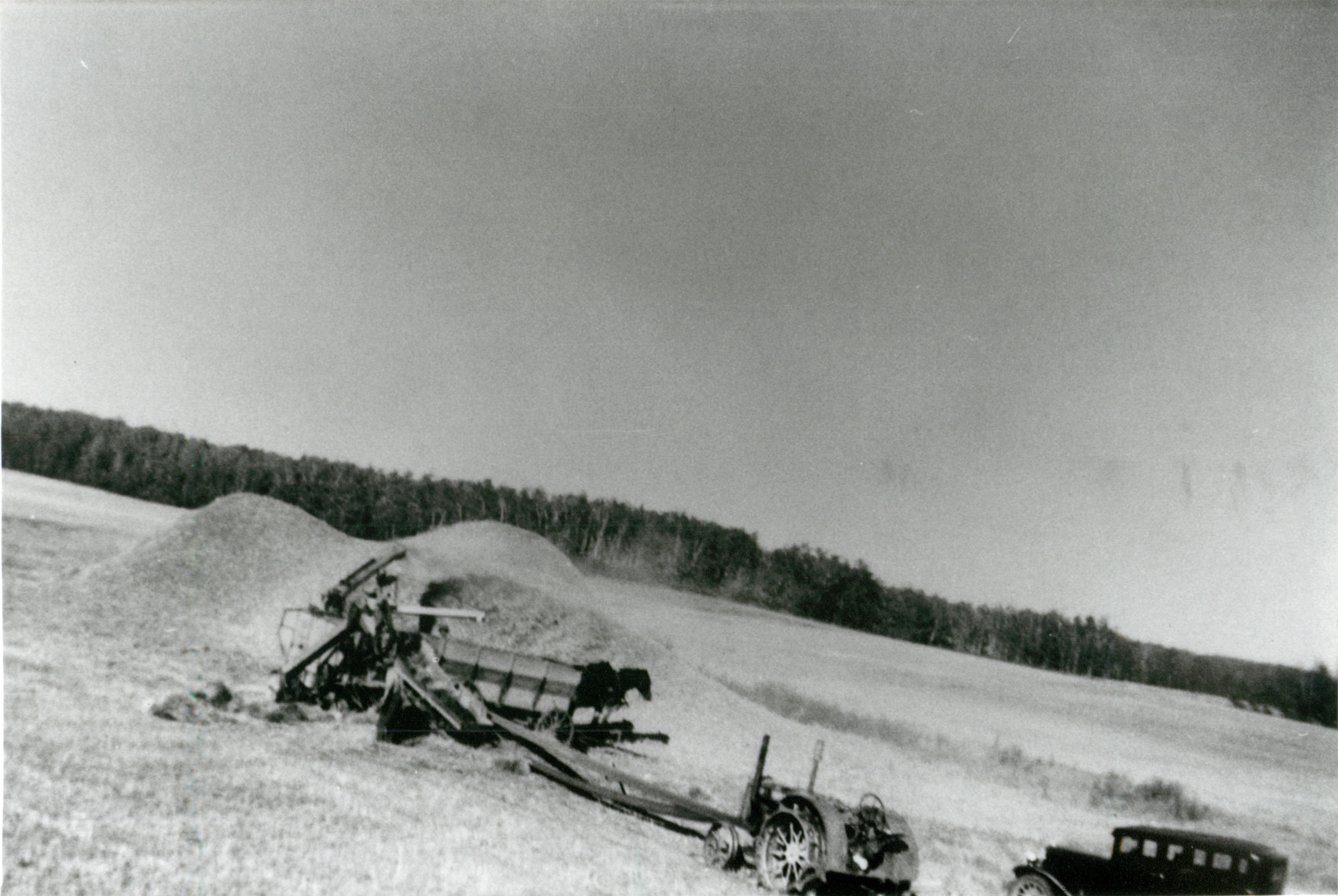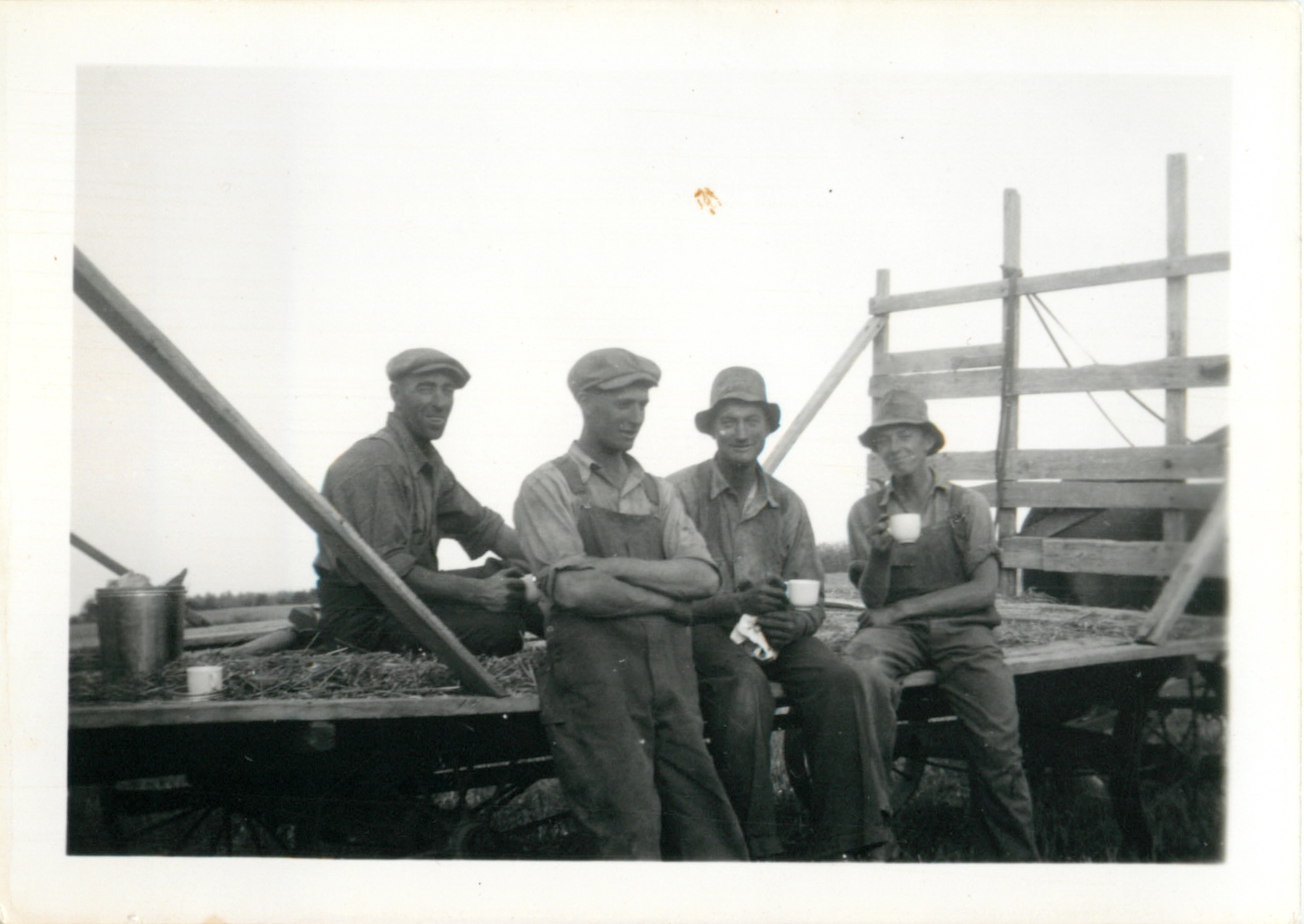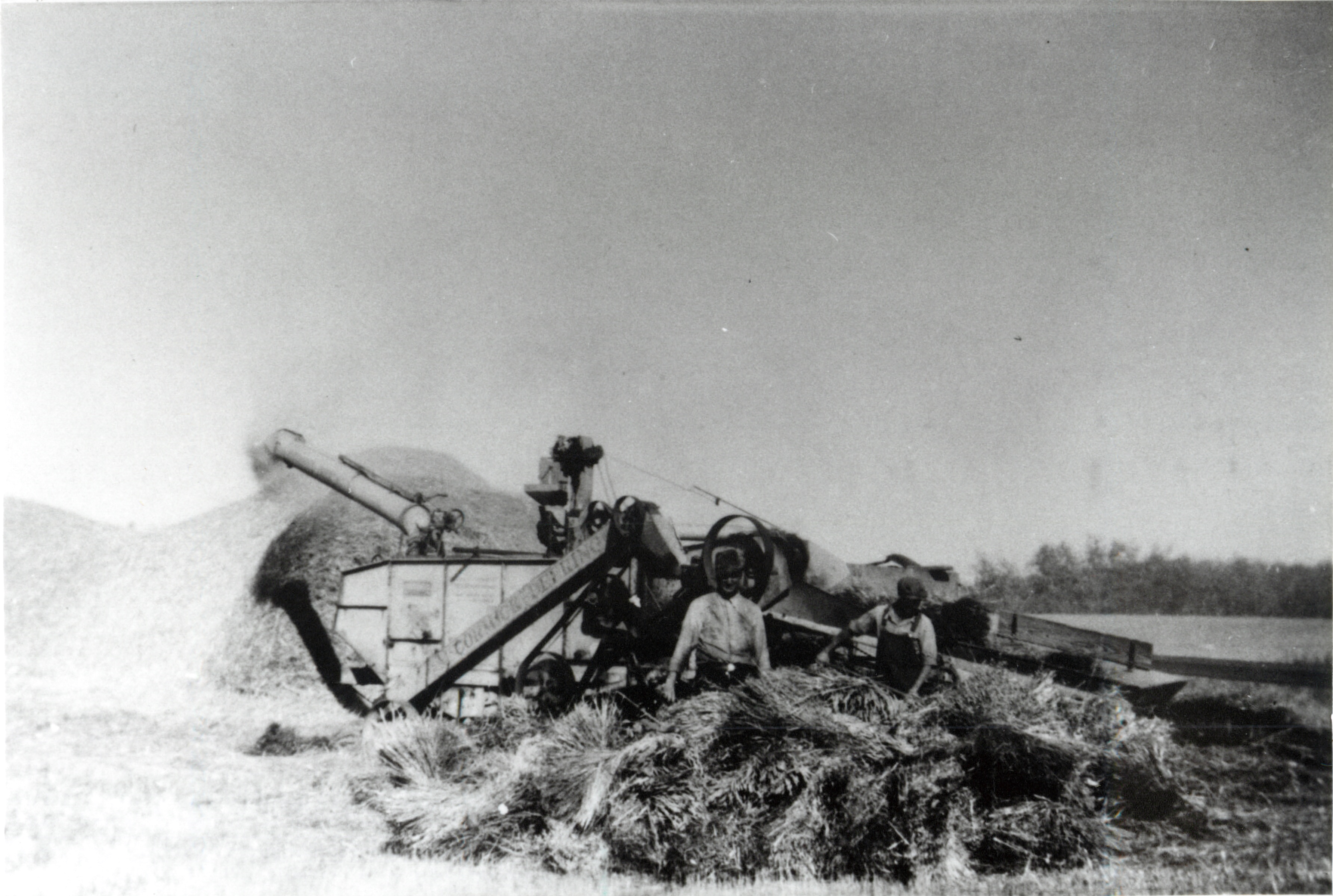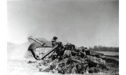 Description Threshing crew on the Stewart (Bert) Stevenson Farm. Now the property of Wild Life Conservation.