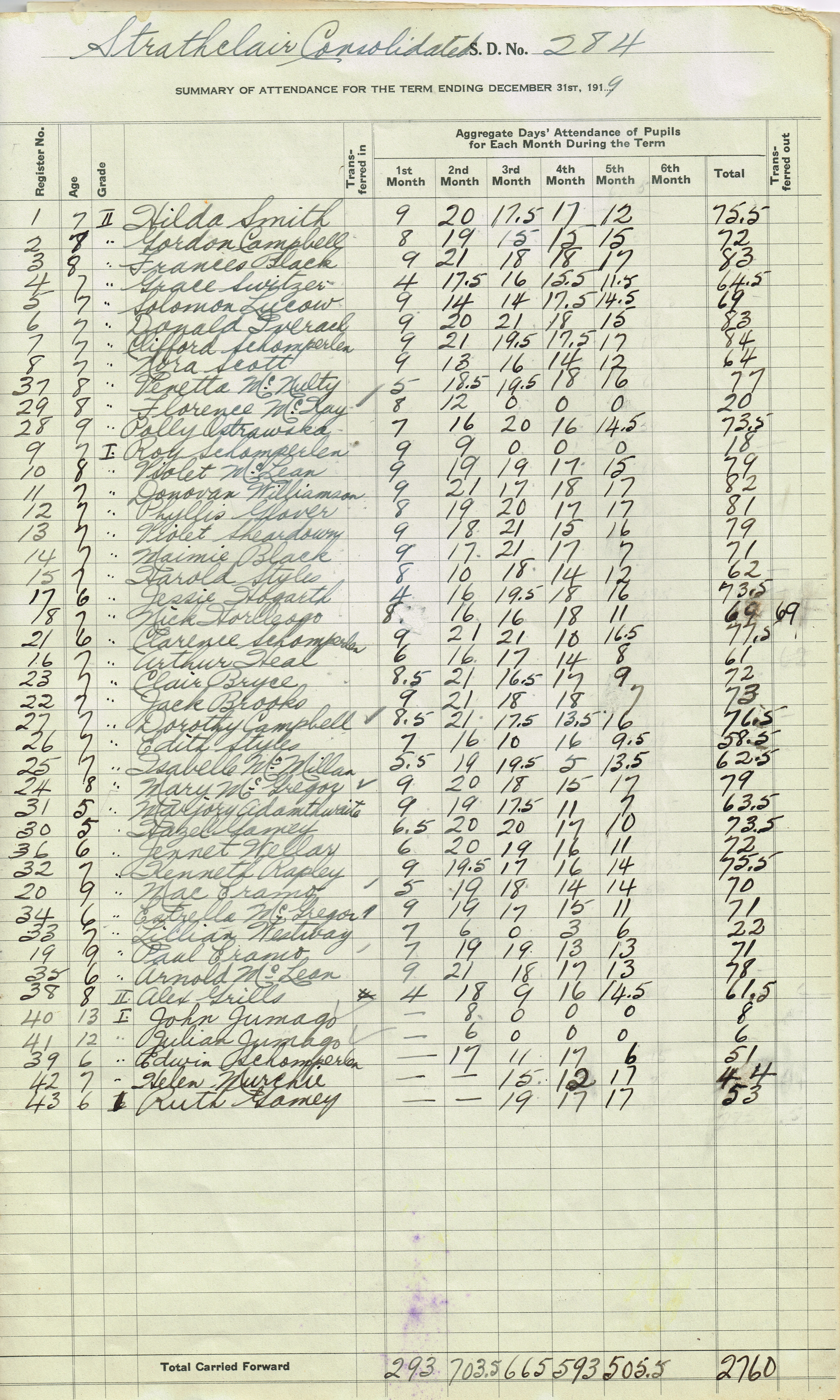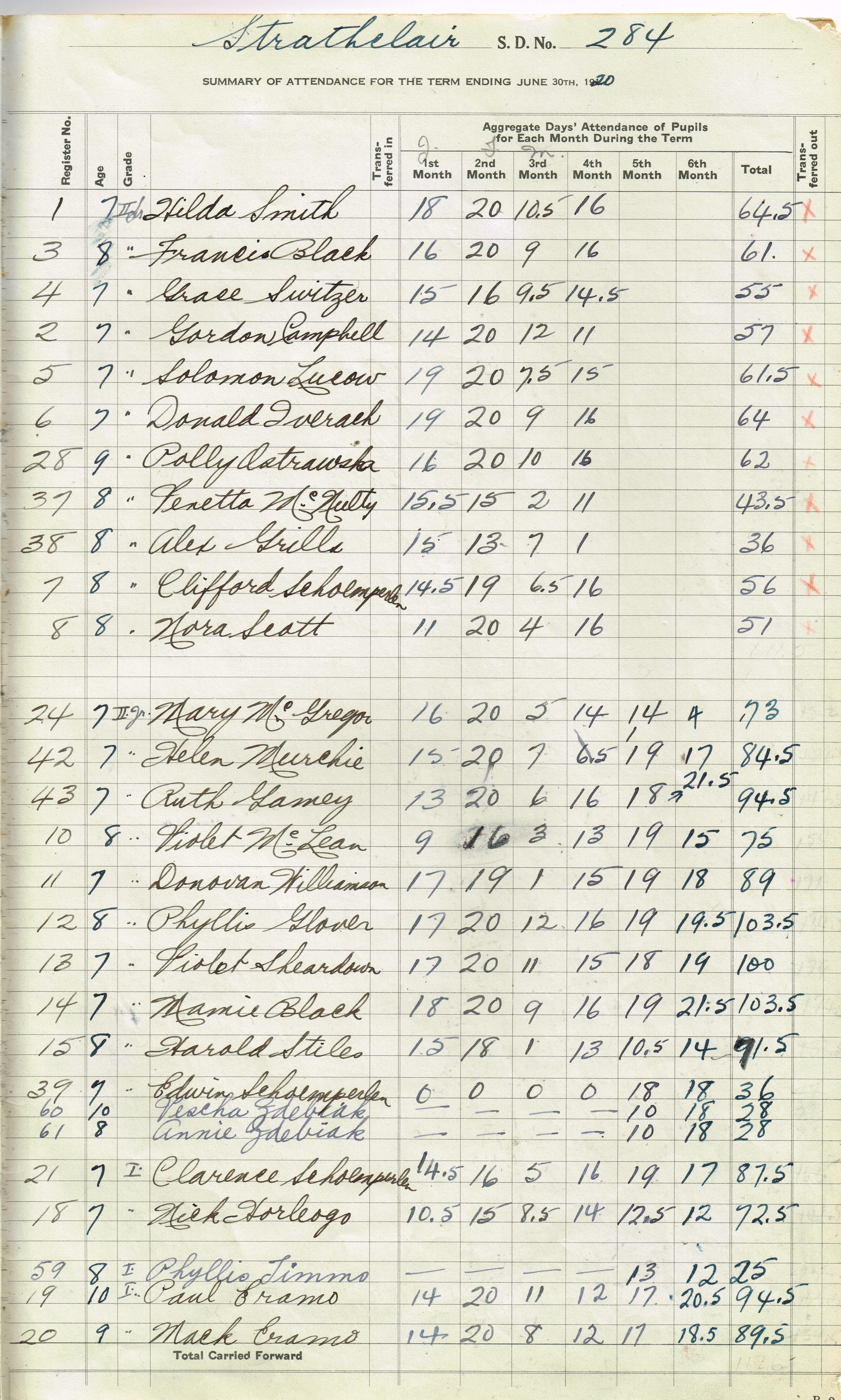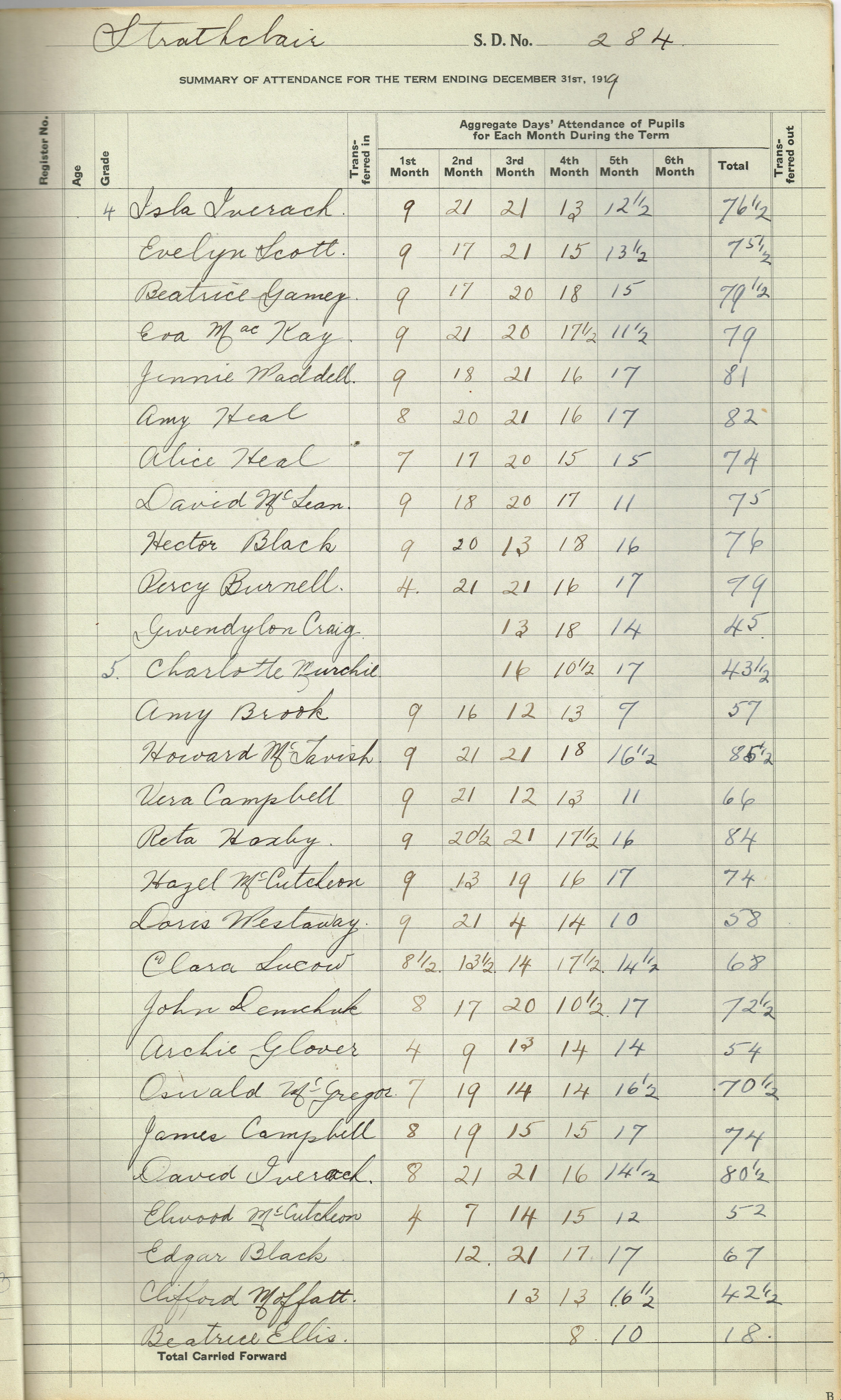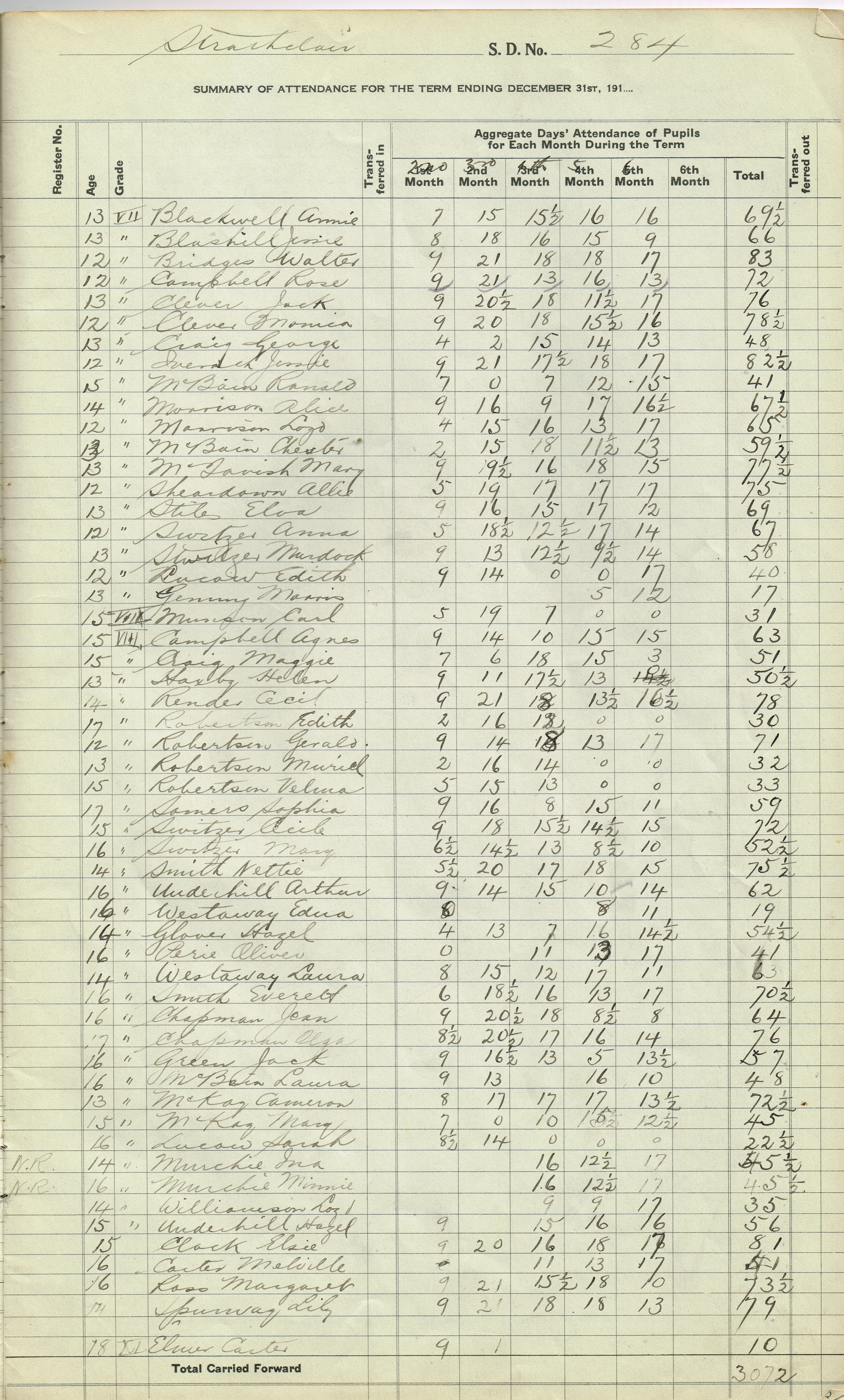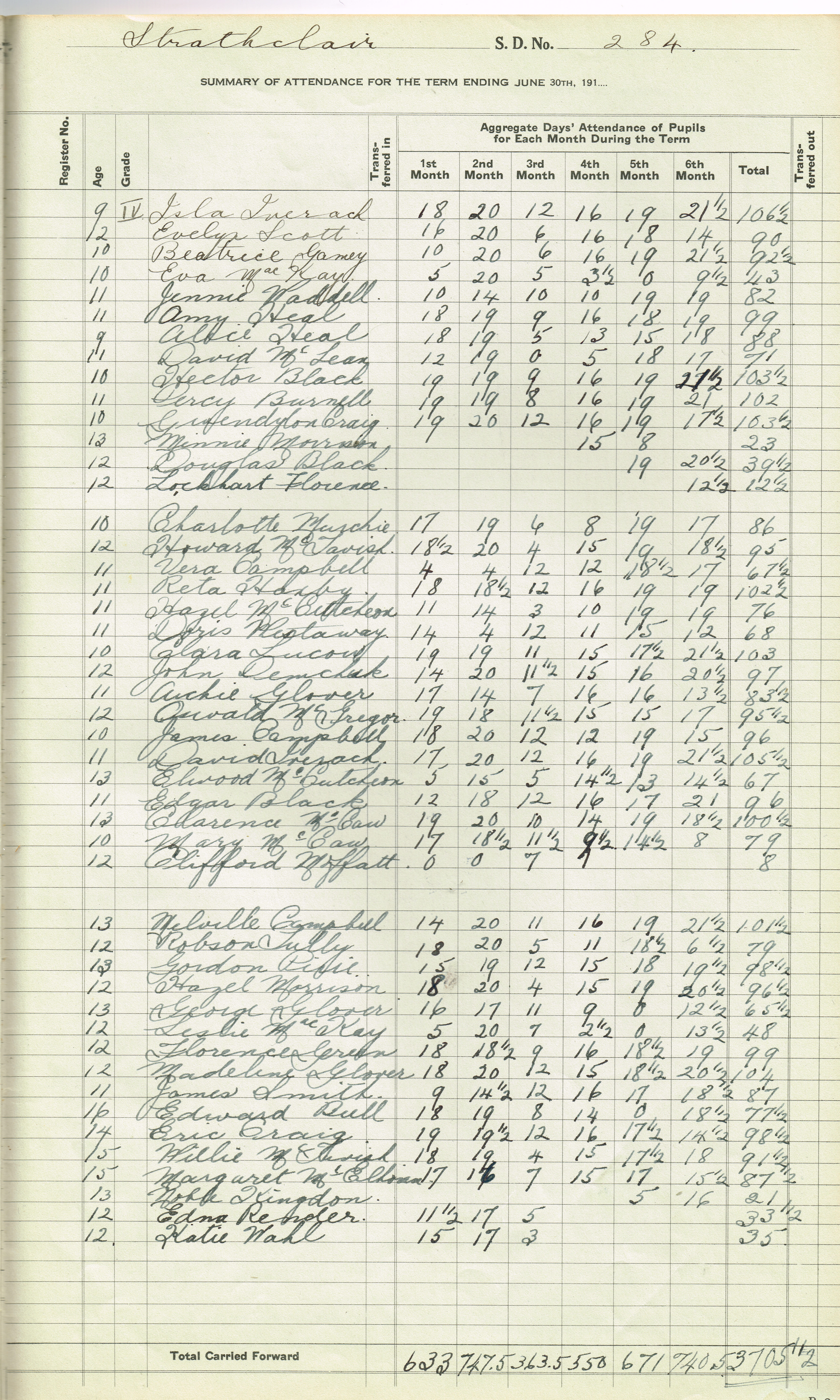 Notes David Iverach (Teacher), Annie Blackwell (G.7), Walter Bridges (G.8), Jessie Blashall (G.7), Rose Campbell (G.7), Jack Clever (G.7), Monica Clever (G.8), George Craig (G.7), Jessie Iverach (G,8), Edith Lucow (G.8), Ronald McBain (G.7), Chester McBain (G.7), Mary McTavish (G.7), Alice Morrison (G.7), Allie Sheardown (G.8), Murdock Switzer (G.7), Anna Switzer (G.7), Elva Stiles (G.7), Morris Genuny (G.7), Olvier Pirie (G.8), Maggie Craig (G.8), Hazel Glover (G.8), Cecil Render (G.8), Gerald Robertson (G.8), Sophie Somers (G.8), Cecile Switzer (G.8), Mary Switzer (G.8), Nettie Smith (G.8), Arthur Underhill (G.8), Laura Westaway (G.8), Elva Westaway (G.8), Helen Haxby (G.8), Everett Smith (G.9), Jean Chapman (G.9), Olga Chapman (G.9), Cameron McKay (G.9), Mary McKay (G.9), Hazel Underhill (G.9), Ina Murchie (G.9), Minnie Murchie (G.9), Jack Green (G.9), Laura McBain (G.9), Sarah Lucow (G.9), Melville Carter (G.10), Elsie Clack (G.10), Lily Spurway (G.10), Margaret Ross (G.10), Loyd Williamson (G.10).