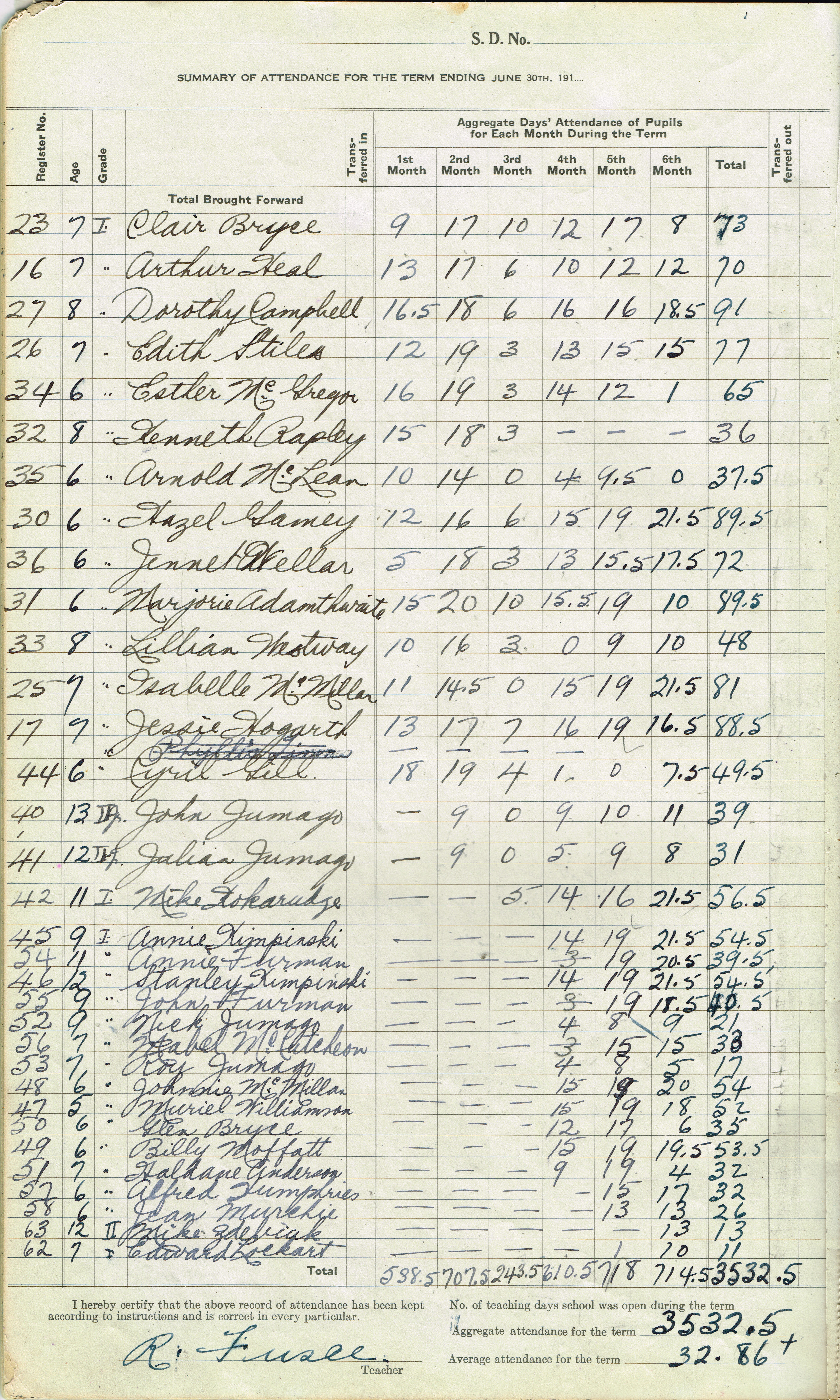 Description Robena Fusee (Teacher), Clair Bryce (G.1), Arthur Heal (G.1), Dorothy Campbell (G.1), Edith Stiles (G.1), Esther McGregor (G.1), Kenneth Rapley (G.1), Arnold McLean (G.1), Hazel Gamey (G.1), Jennet Wellar (G.1), Marjorie Adamthwaite (G.1), Lillian Westway (G.1), Isabelle McMillian (G.1), Jessie Hogarth (G.1), Cyril Gill (G.1), John Jumago (G.2), Julian Jumago (G.2), Mike Kokarudge (Kokorudz) (G.1), Annie Kimpinski (G.1), Annie Furman (G.1), Stanley Kimpinski (G.1), John Furman (G.1), Nick Jumago (G.1), Mabel McCutcheon (G.1), Roy Jumago (G.1), Johnnie McMillan (G.1), Muriel Williamson (G.1), Glen Bryce (G.1), Billy Moffatt (G.1), Haldane Anderson (G.1), Alfred Humphries (G.1), Jean Murchie (G.1), Mike Zdebiak (G.2), Edward Lockhart (G.1).
