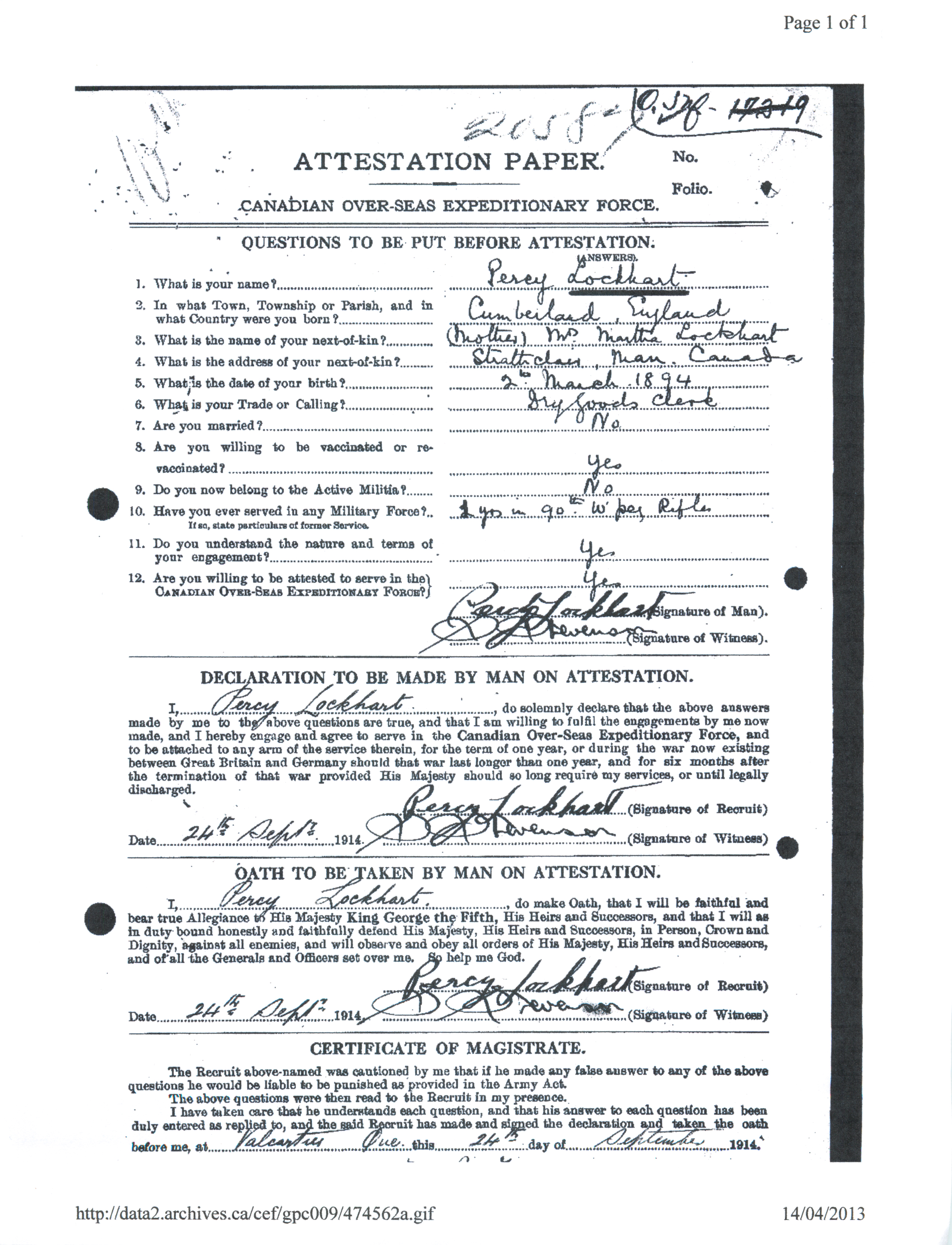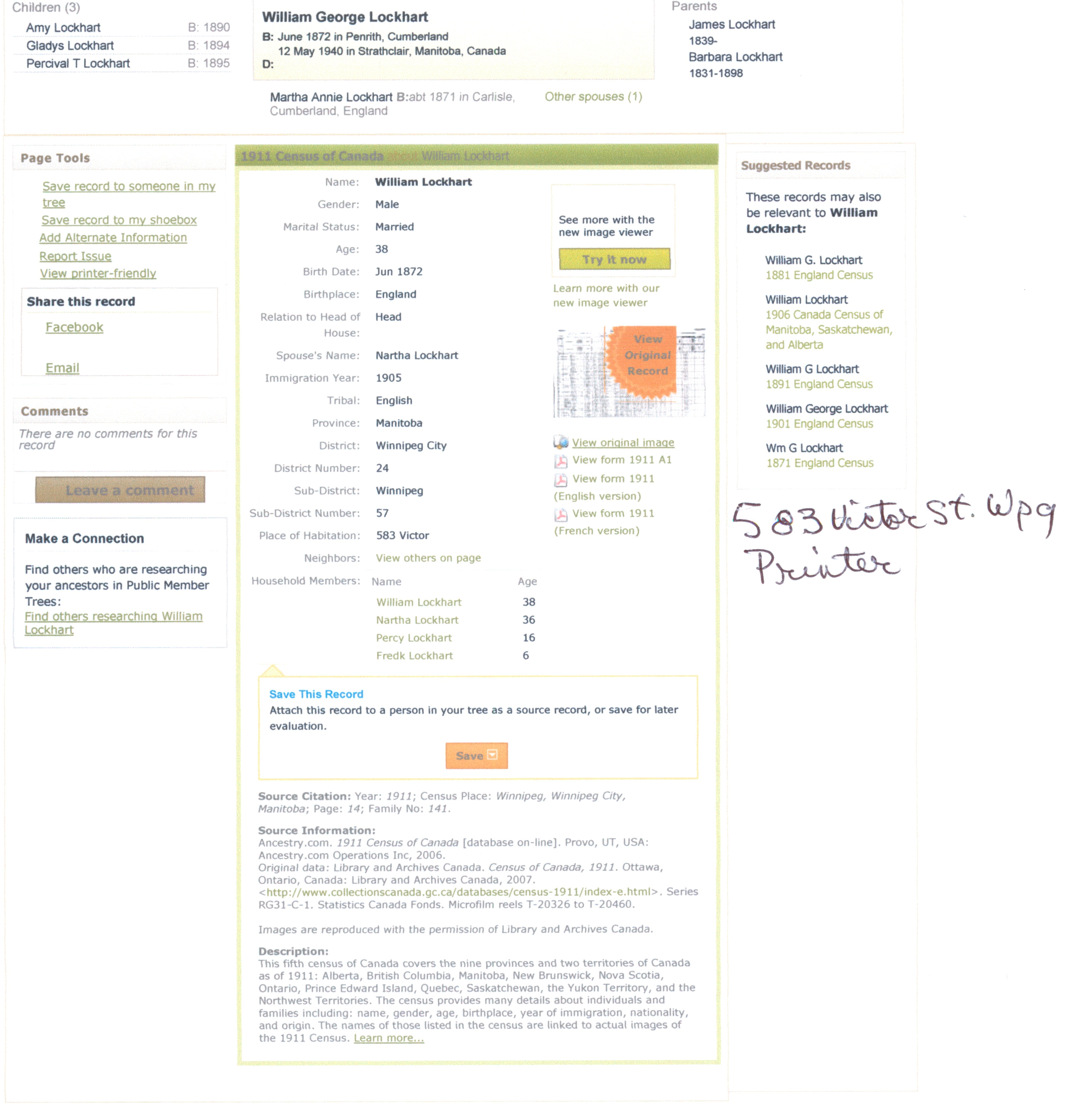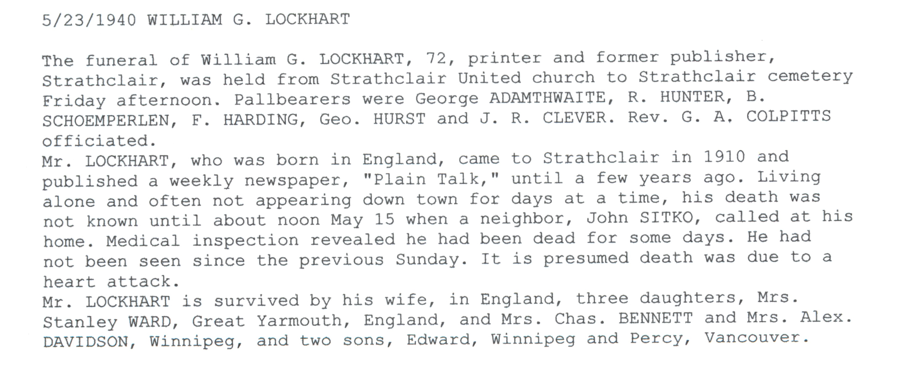 Notes William George Lockhart Born 1869 at Penrith Cumberland, England. Died May 12 1940 in Strathclair Manitoba. Parents: James Lockhart 1839-1921 and Barbara Tremble 1830-1898 William Lockhart married Martha Annie Simpson in 1889 at Ormskirk Lancashire, England Martha Annie Simpson: Born 1874, in Carlisle Cumberland Together Martha and William had 5 children: Amy Lockhart 1890 - 1983 married to Charles Bennett 1885 - 1983 Percival Tremble Lockhart 1894 – 1960 WWI Veteran Gladys Lockhart 1892 - ? married to Stanley Cowell, Ward Fredrick Lockhart 1904-1922 Edward W. Lockhart 1913-1973 married to Joyce Vivian Goodwin 1919-2011 William Lockhart came to Montreal Canada in Nov 3 1905, on the ship Virginian. He first stopped in Winnipeg and continued his work within the printing trade and then made it to Strathclair in 1910. Martha’s family came to Montreal Canada May 12 1906, on the ship Tunisian.