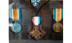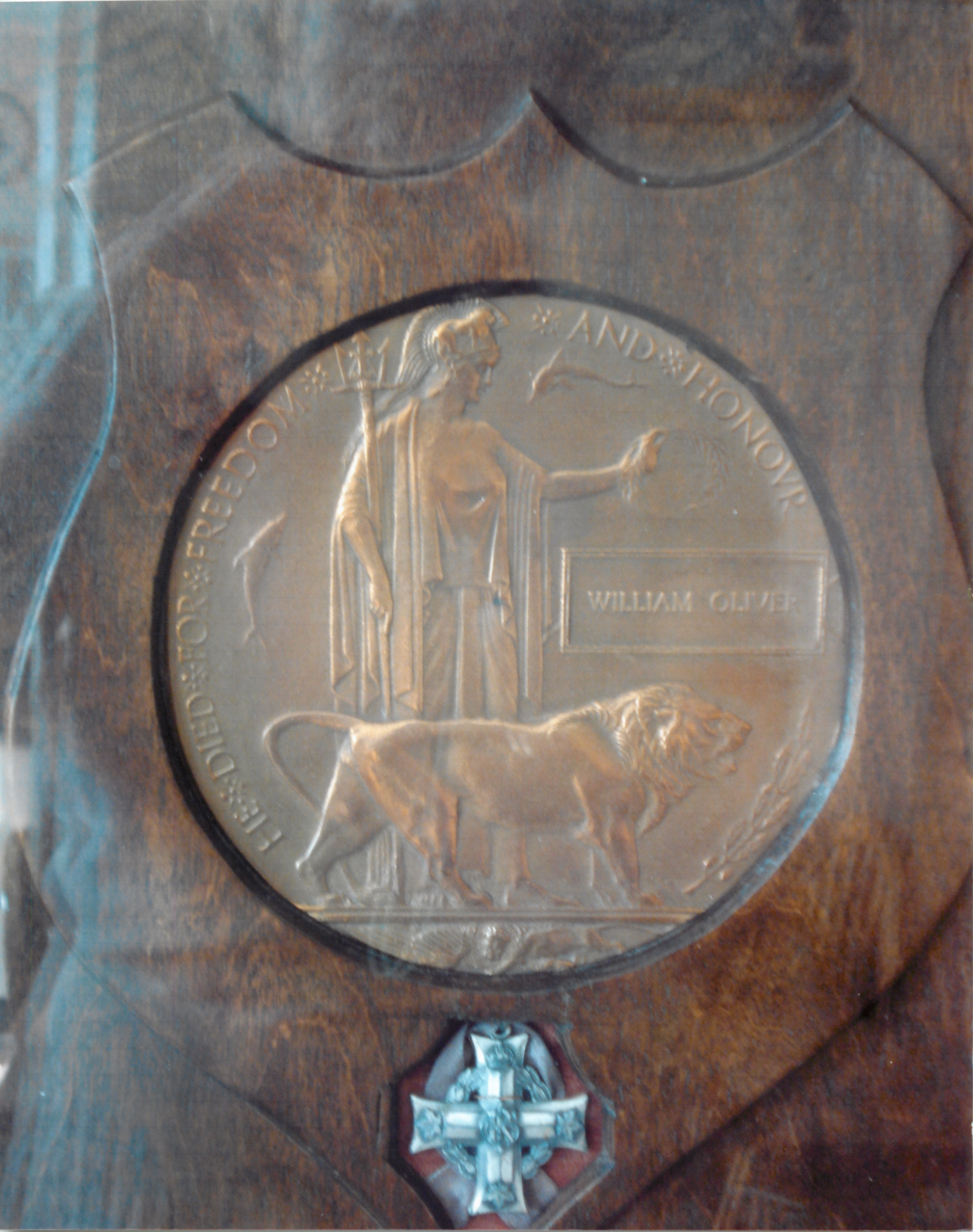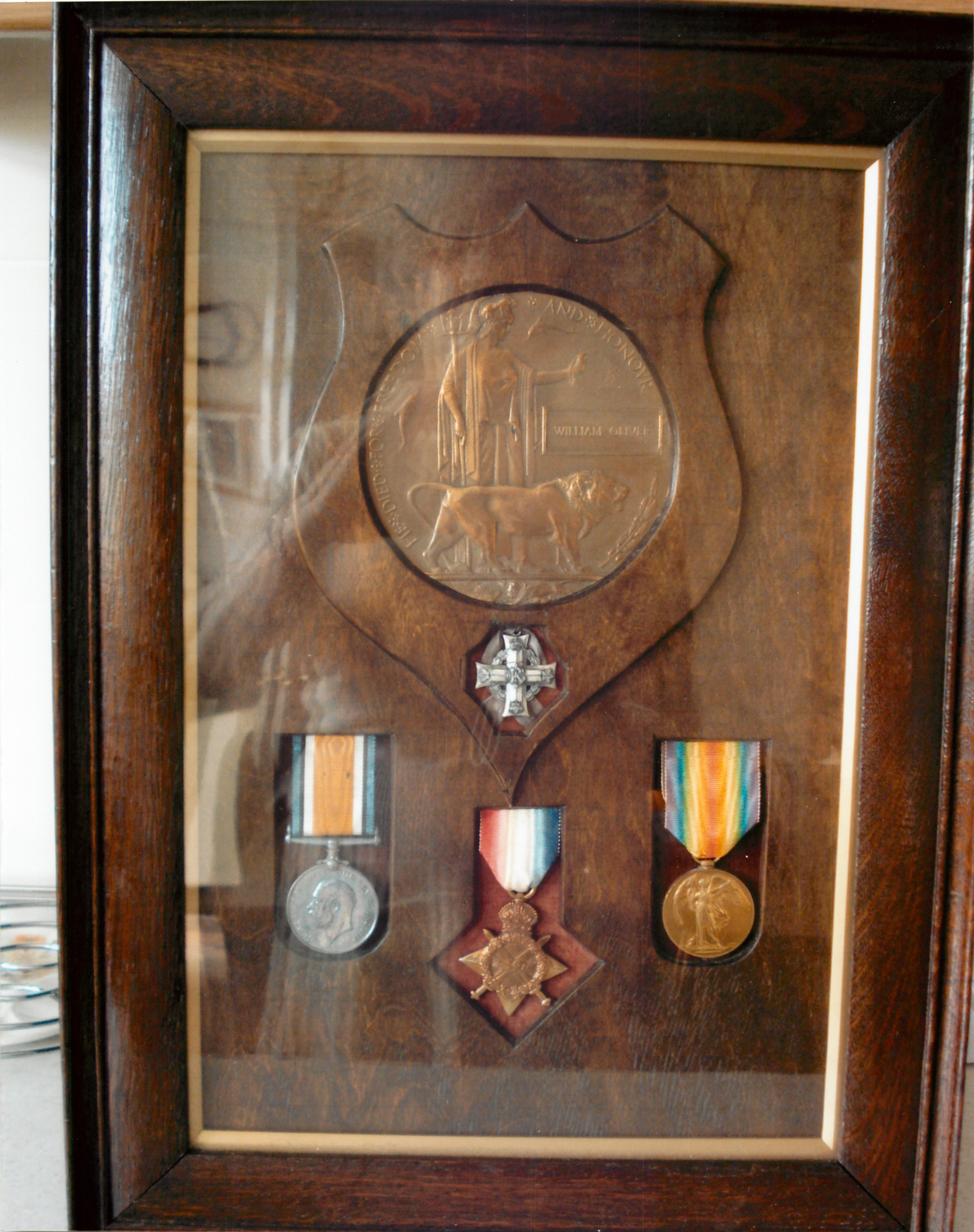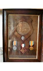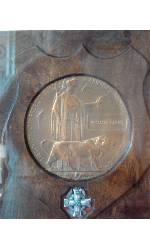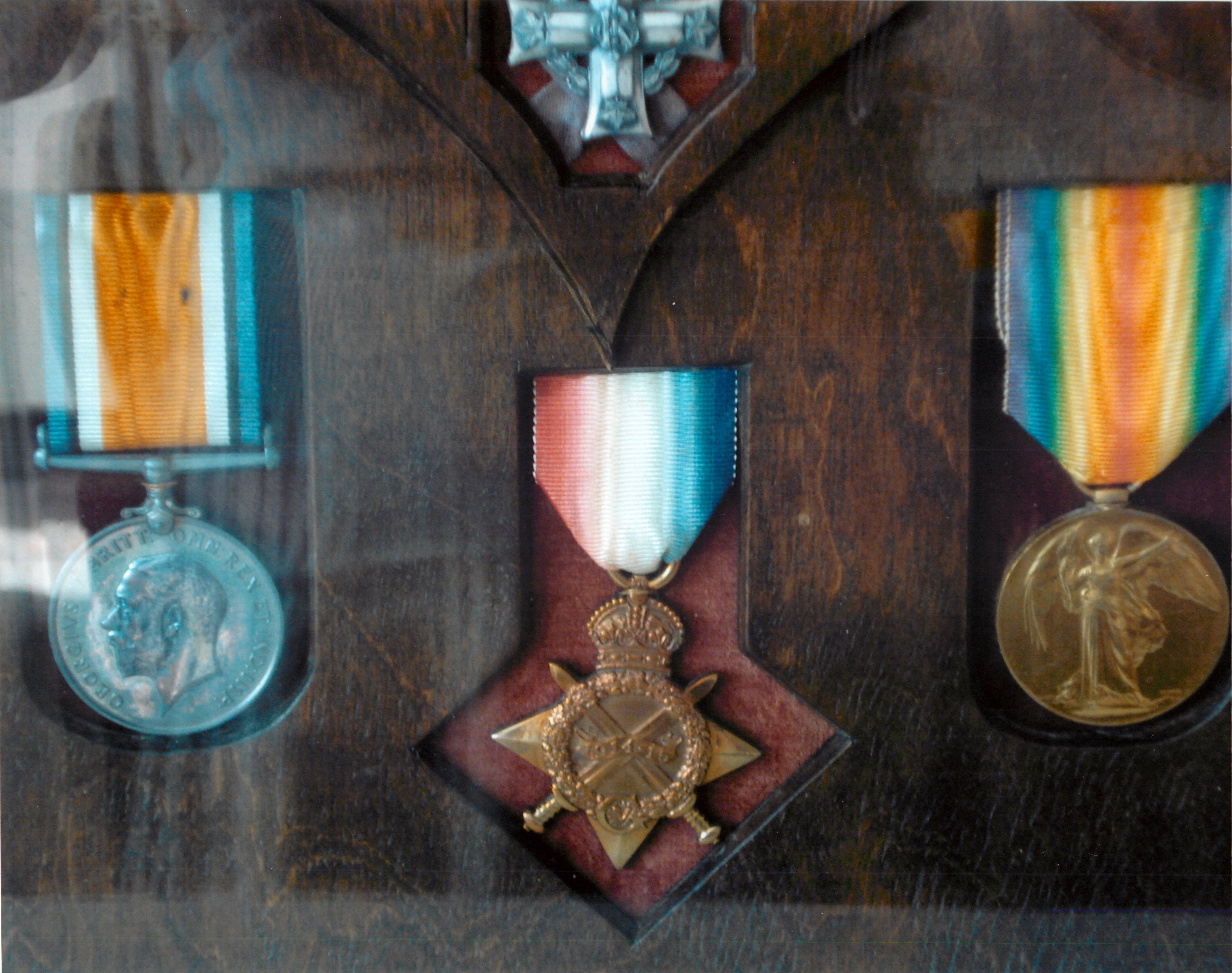 Description The three medals side by side are the campaign medals given to all British and Commonwealth service men who fought in the First World War. The single cross is a Canadian medal. The round disc with the name engraved was sent, after the war to the family of the soldier who had been killed in battle.