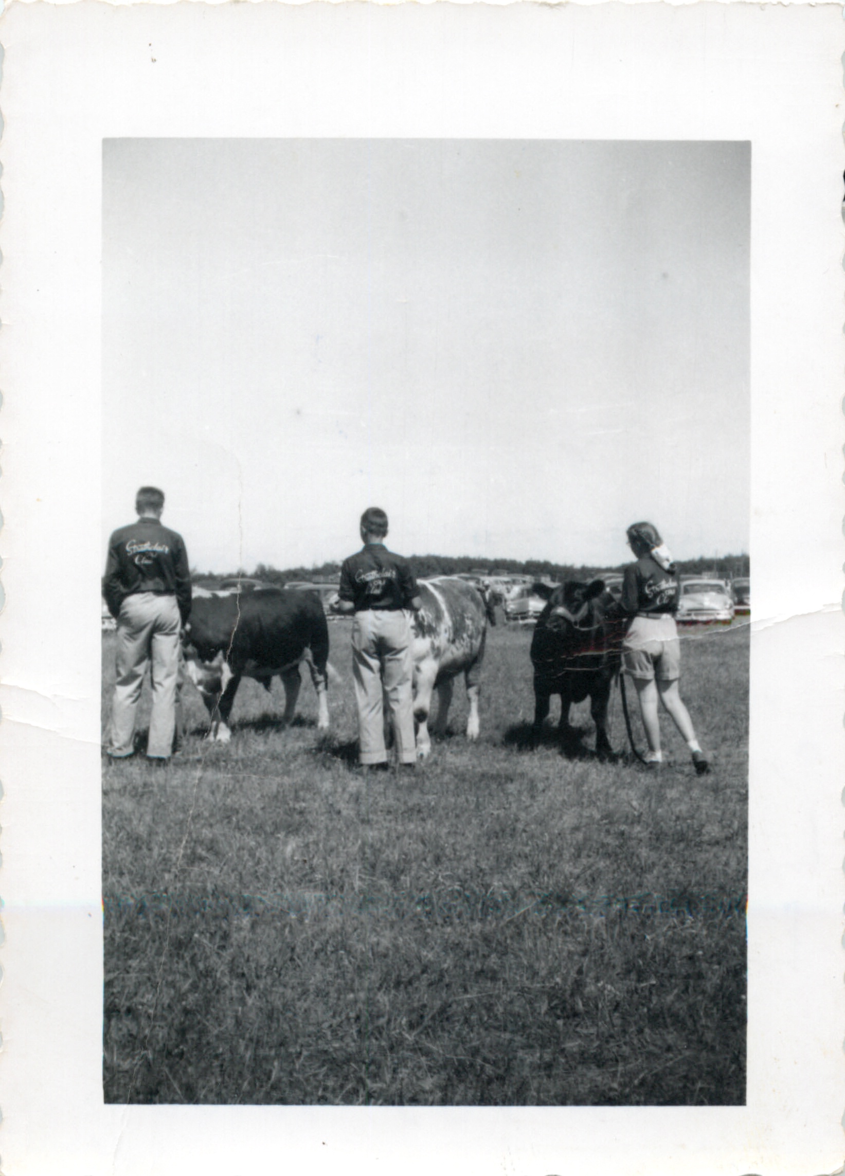 Description Calf Club Competition. Three prize calves. 1st Della Dawn May. 2nd Mordon Harvey. 3rd Bobbie Kerr (Roy Gamey holding calf) Verna Gamey Strathclair Collection; 2012.0026; im065;