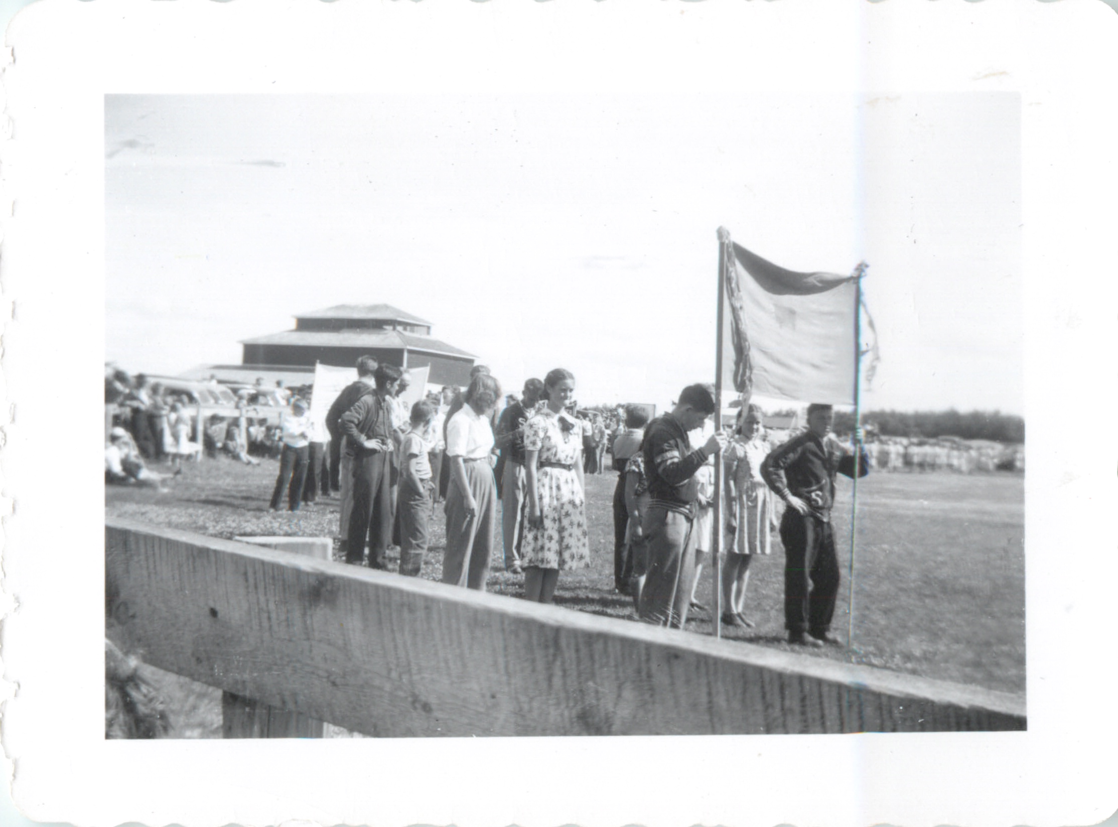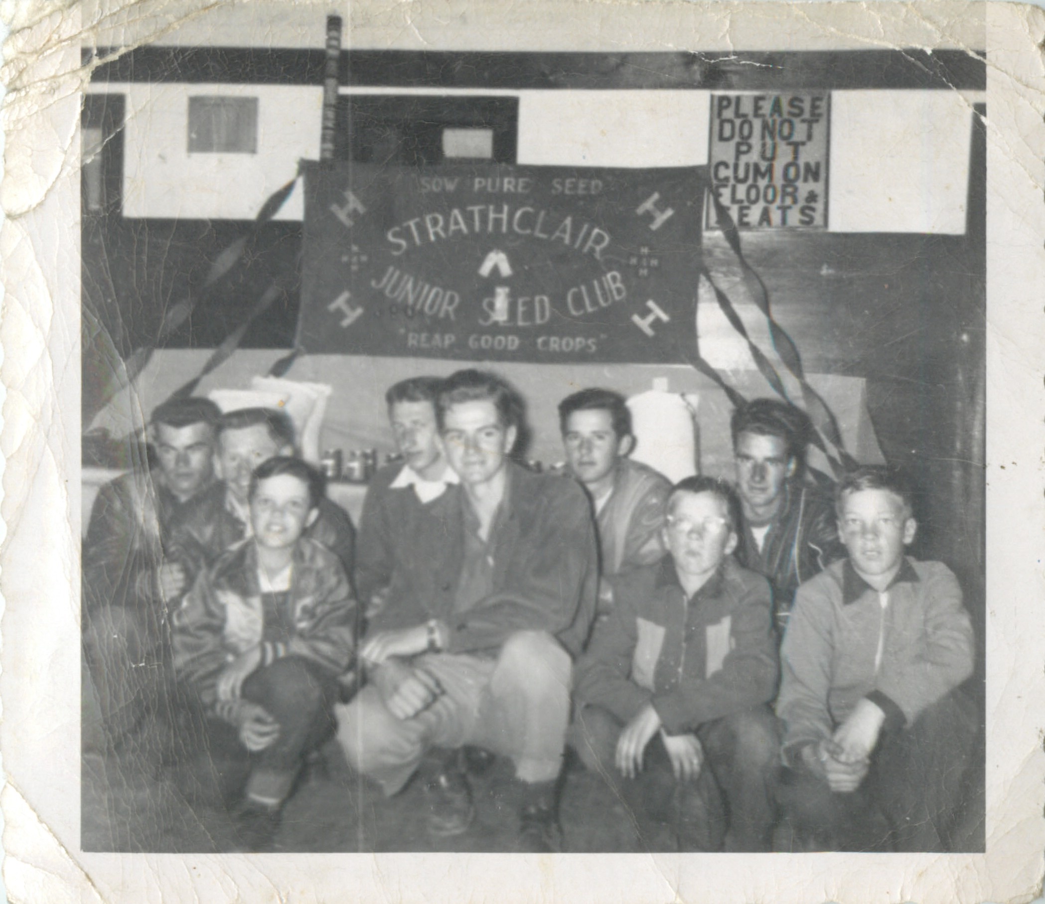 Description Junior Seed Club 1948 L-R Willard Moffat, Alex Kulchyski, Vern Westaway, Roy Gamey, Hashmir Chastko, Graham Somers, Clarence Jack, Graham Switzer, Delmar Jack. Verna Gamey Collection 2012.0026