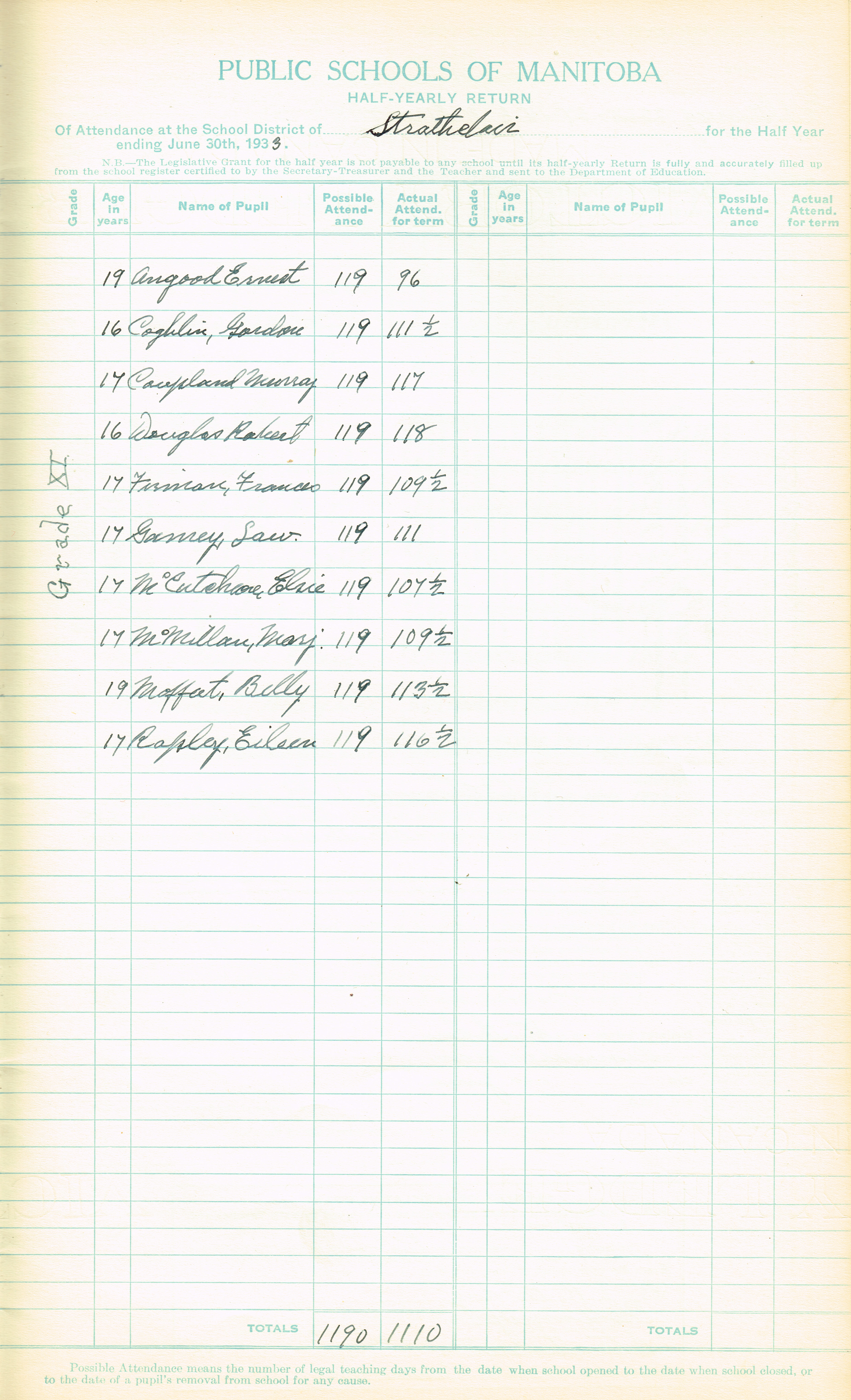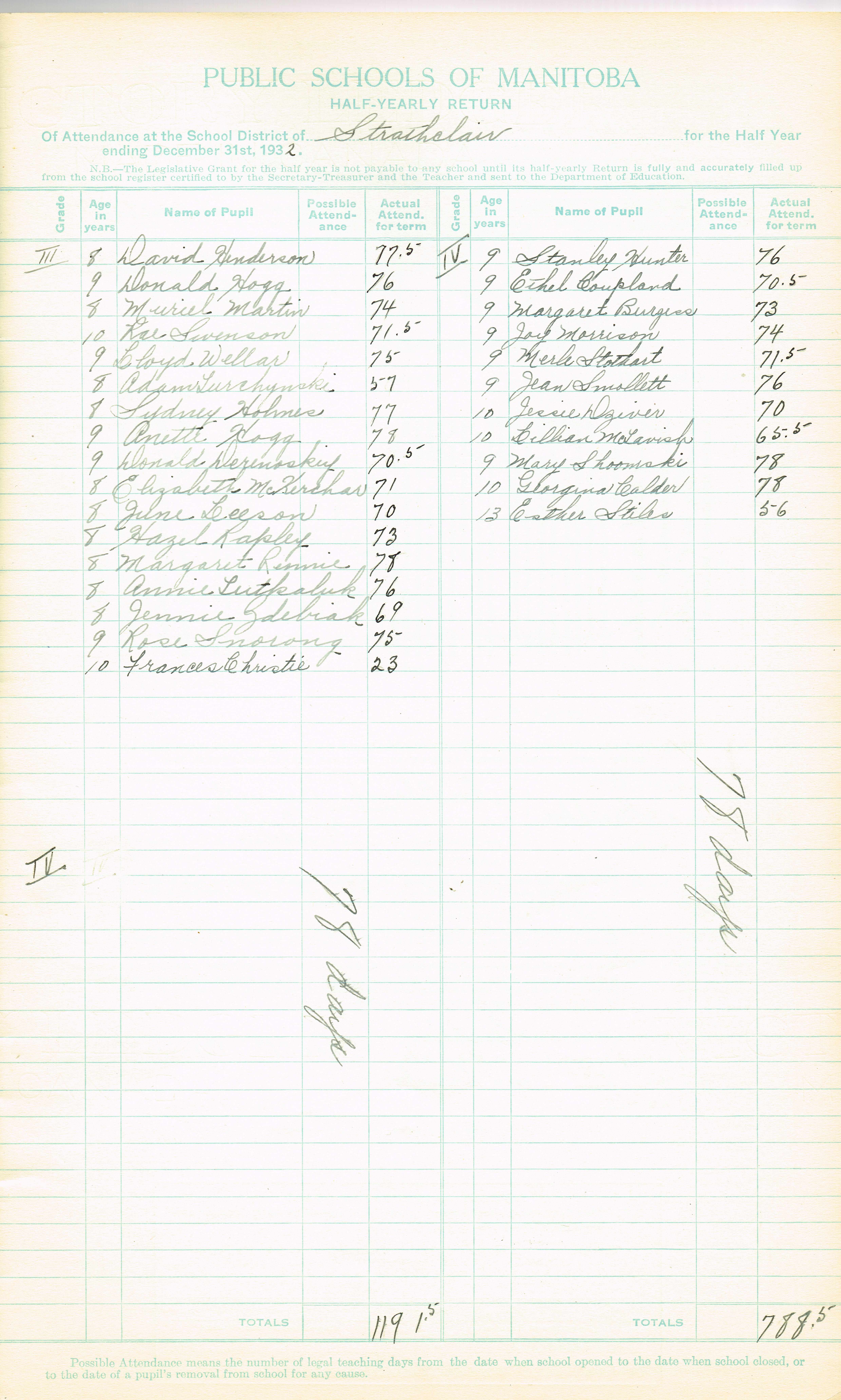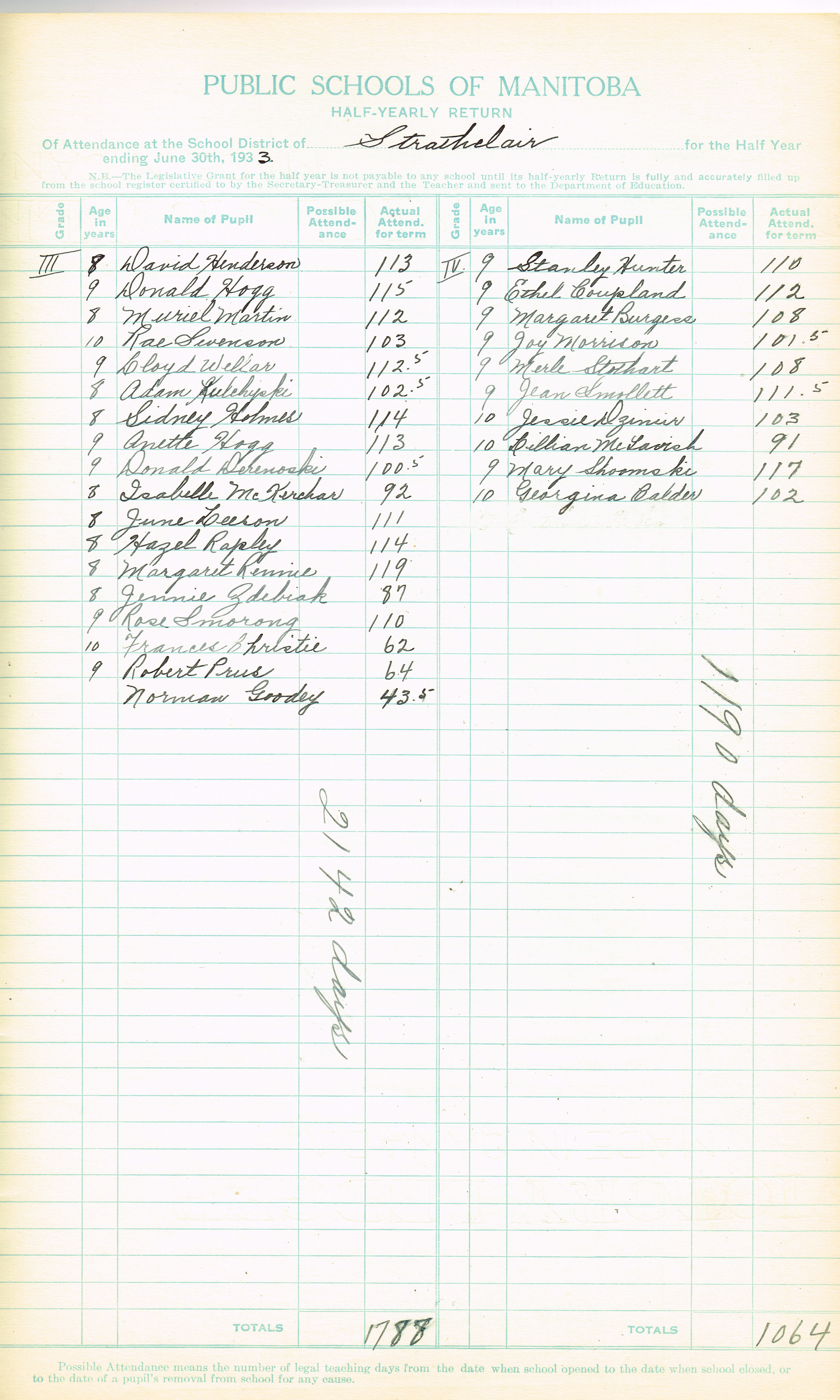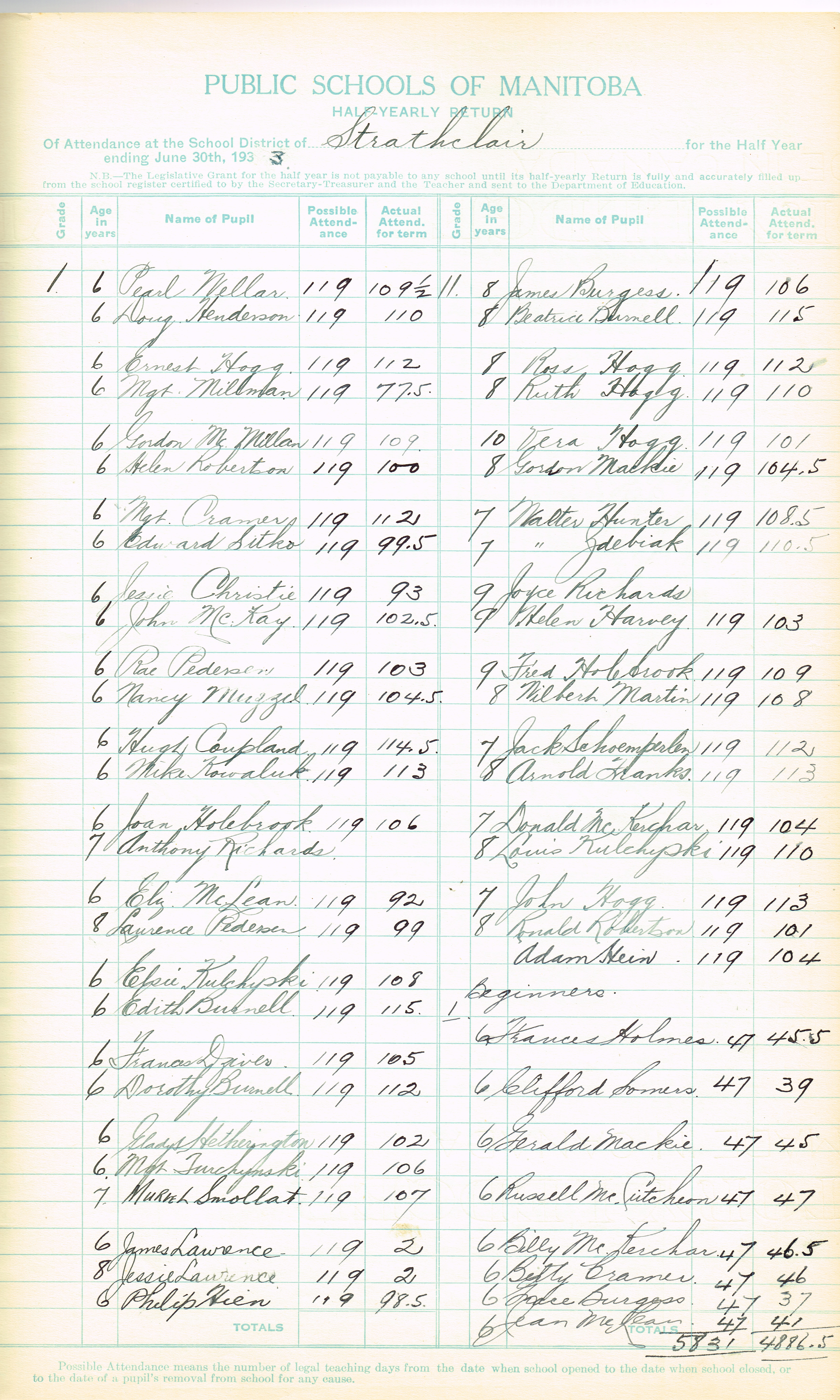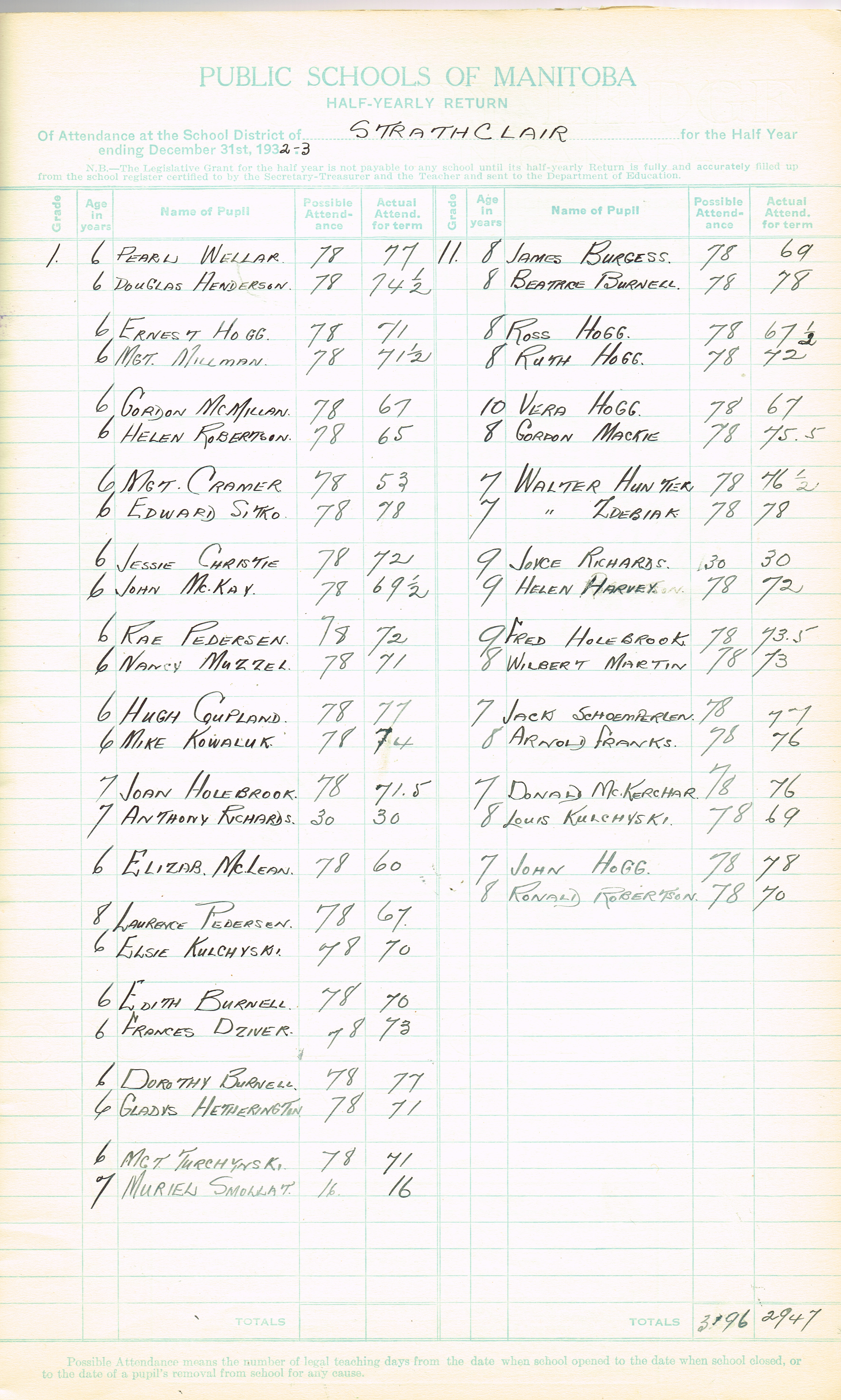 Notes Gladys Sleigh (teacher), Pearl Wellar (G. 1), Douglas Henderson (G. 1), Ernest Hogg (G. 1), Mgt. Millman (G. 1), Gordon McMillan (G. 1), Helen Robertson (G. 1), Mgt. Cramer (G. 1), Edward Sitko (G. 1), Jessie Christie (G. 1), John McKay (G. 1), Rae Pedersen (G. 1), Nancy Muzzel (G. 1), Hugh Coupland (G. 1), Mike Kowaluk (G. 1), Joan Holebrook (G. 1), Anthony Richards (G. 1), Elizab. McLean (G. 1), Laurence Pedersen (G. 1), Elsie Kulchyski (Kulchycki) (G. 1), Edith Burnell (G. 1), Frances Dziver (G. 1), Dorothy Burnell (G. 1), Gladys Hetherington (G. 1), Mgt. Turchynski (G. 1), Muriel Smollat (G. 1), James Lawrence (G. 1), Jessie Lawrence (G. 1), Philip Hien (G. 1), James Burgess (G. 2), Beatrice Burnell (G. 2), Ross Hogg (G. 2), Ruth Hogg (G. 2), Vera Hogg (G. 2), Gordon Mackie (G. 2), Walter Hunter (G. 2), Walter Zdebiak (G. 2), Joyce Richards (G. 2), Helen Harvey (G. 2), Fred Holebrook (G. 2), Wilbert Martin (G. 2), Jack Schoemperlen (G. 2), Arnold Franks (G. 2), Donald McKerchar (G. 2), Louis Kulchyski (G. 2), John Hogg (G. 2), Ronald Robertson (G. 2), Adam Hein (G. 2), Frances Holmes (G. 1), Clifford Somers (G. 1), Gerald Mackie (G. 1), Russell McCutcheon (G. 1), Billy McKerchar (G. 1), Betty Cramer (G. 1), Grace Burgess (G. 1), Jean McLean (G. 1).