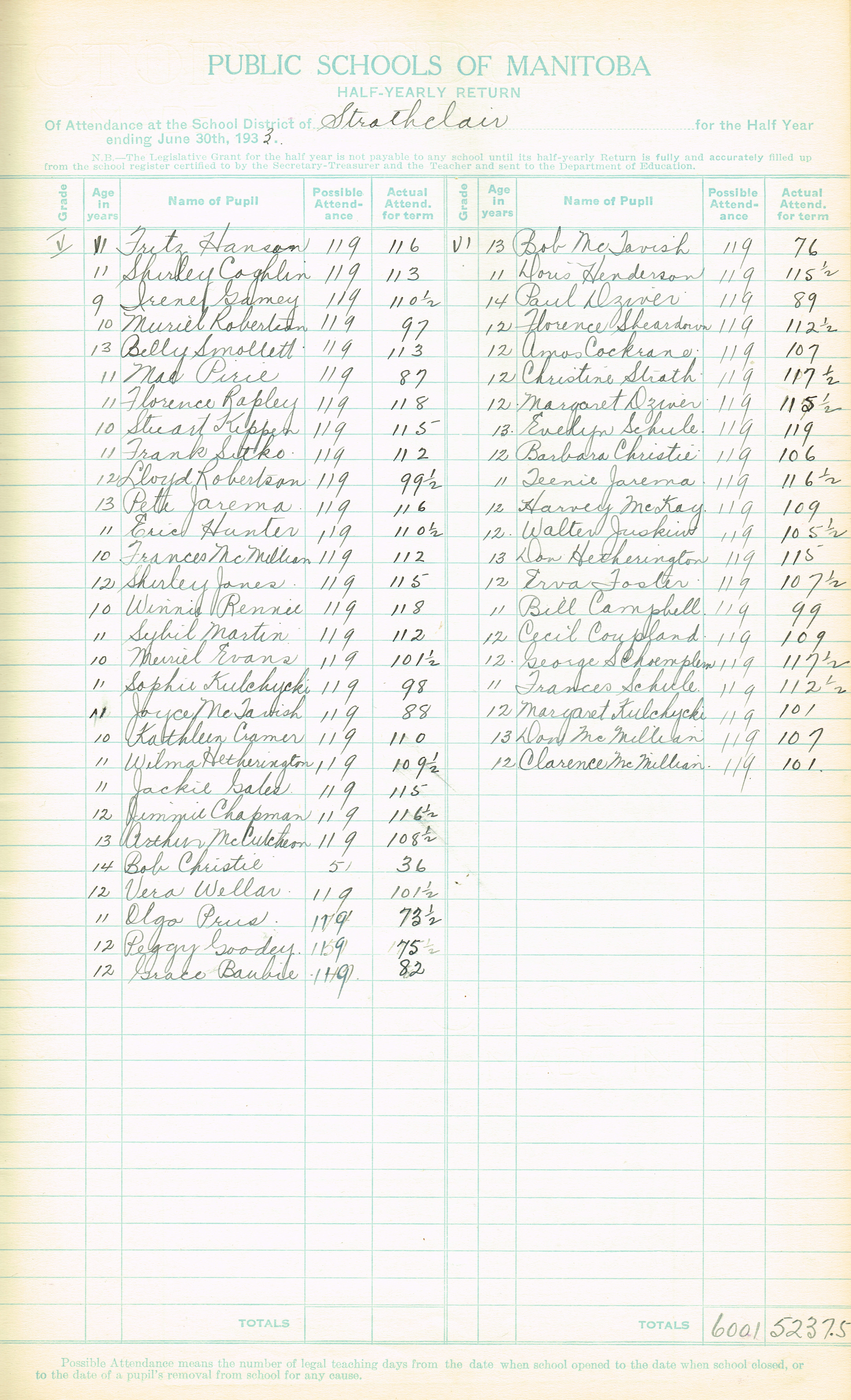 Notes Eva M. Pearson (teacher), Fritz Hansen (G. 5), Shirley Coghlin (G. 5), Irene Gamey (G. 5), Muriel Robertson (G. 5), Billy Smollett (G. 5), Mae Pirie (G. 5), Florence Rapley (G. 5), Stuart Kippen (G. 5), Frank Sitko (G. 5), Lloyd Robertson (G. 5), Pete Jarema (G. 5), Eric Hunter (G. 5), Frances McMillian (G. 5), Shirley Jones (G. 5), Winnie Rennie (G. 5), Sybil Martin (G. 5), Muriel Evans (G. 5), Sophie Kulchycki (G. 5), Joyce McTavish (G. 5), Kathleen Crammer (Cramer) (G. 5), Wilma Hetherington (G. 5), Jackie Gales (G. 5), Jimmie Chapman (G. 5), Arthur McCutcheon (G. 5), Bob Christie (G. 5), Bob McTavish (G. 6), Doris Henderson (G. 6), Paul Dziver (G. 6), Florence Sheardown (G. 6), Pete Tutkaluk (G. 6), Amos Cochrane (G. 6), Clarence McMillian (G. 6), Christine Strath (G. 6), Margaret Dziver (G. 6), Evelyn Schule (G. 6), Teenie Jarema (G. 6), Harvey McKay (G. 6), Walter Juskiw (G. 6), Jimmie Bailey (G. 6), Don Hetherington (G. 6), Erva Foster (G. 6), Bill Campbell (G. 6), Cecil Coupland (G. 6), George Schoemperlen (G. 6), Frances Schule (G. 6), Margaret Kulchycki (G. 6), Don McMillian (G. 6), Barbara Christie (G. 6).