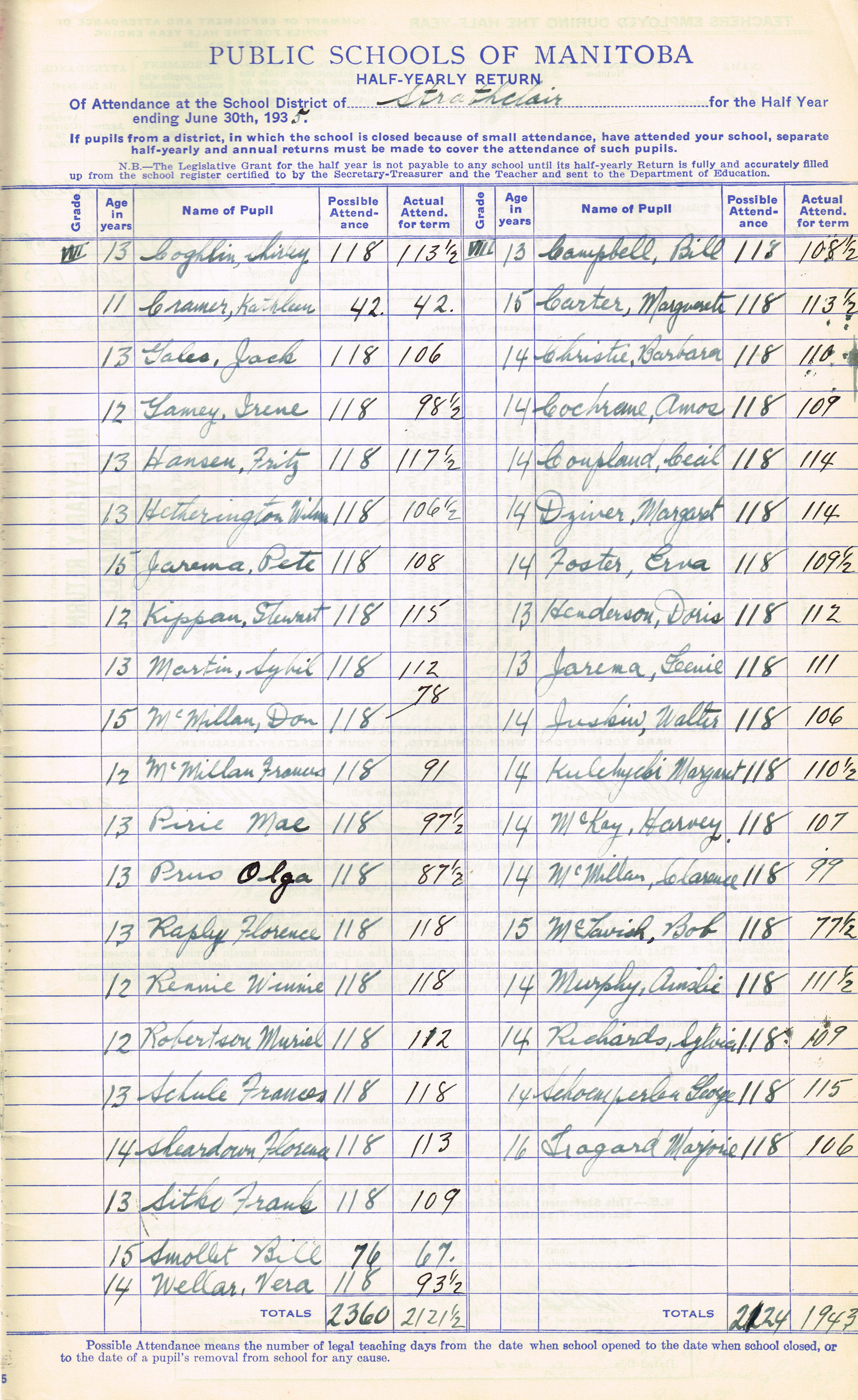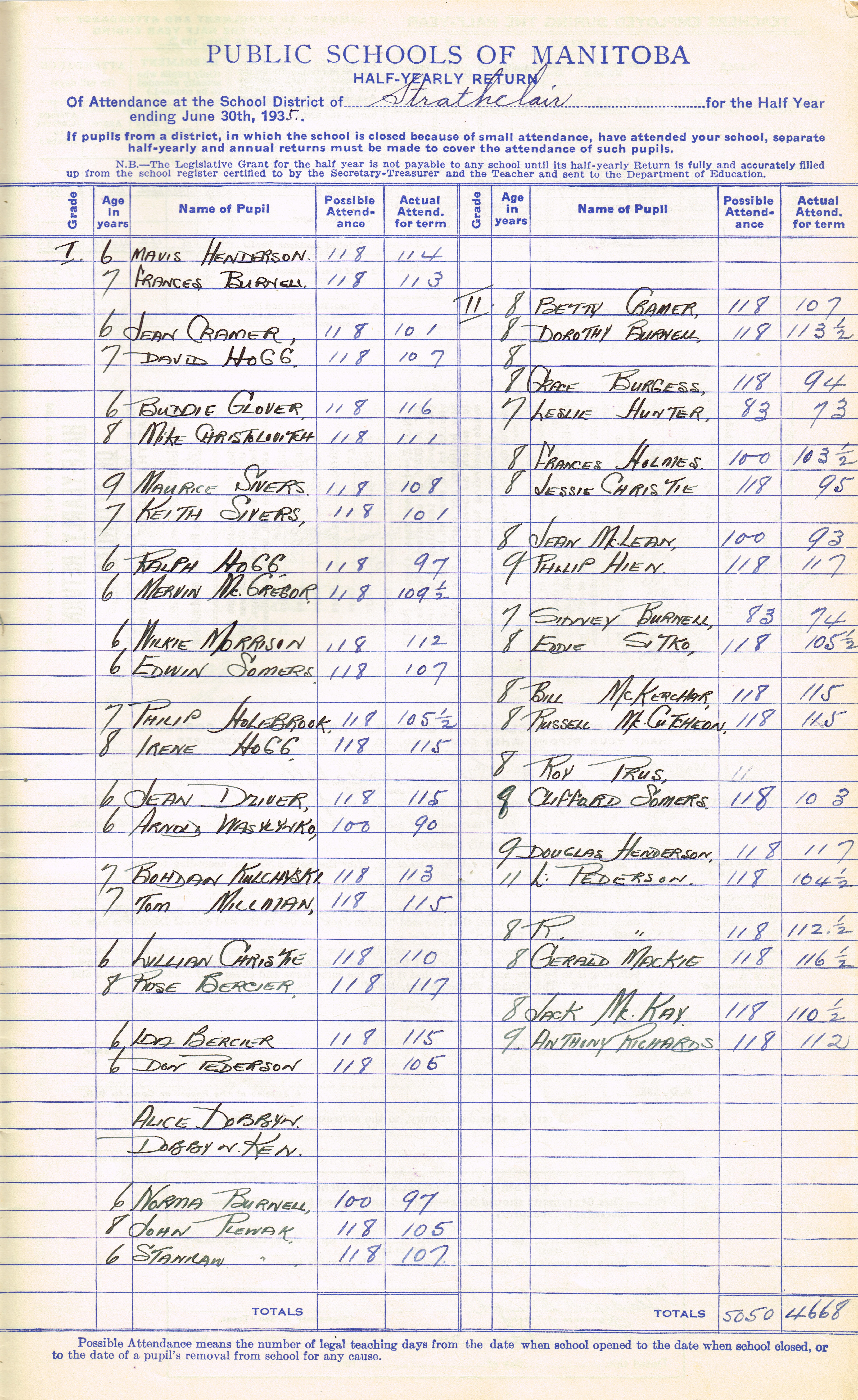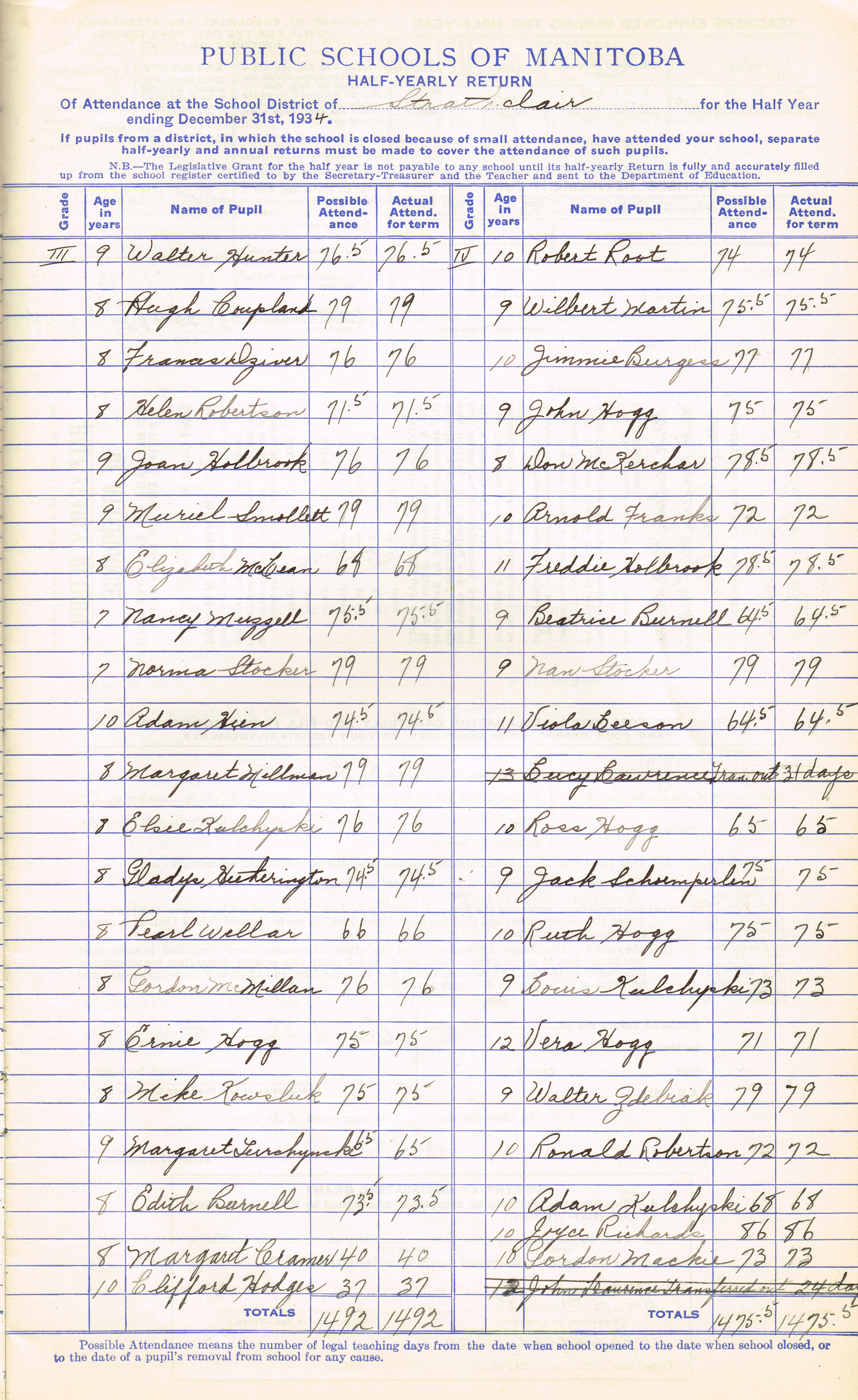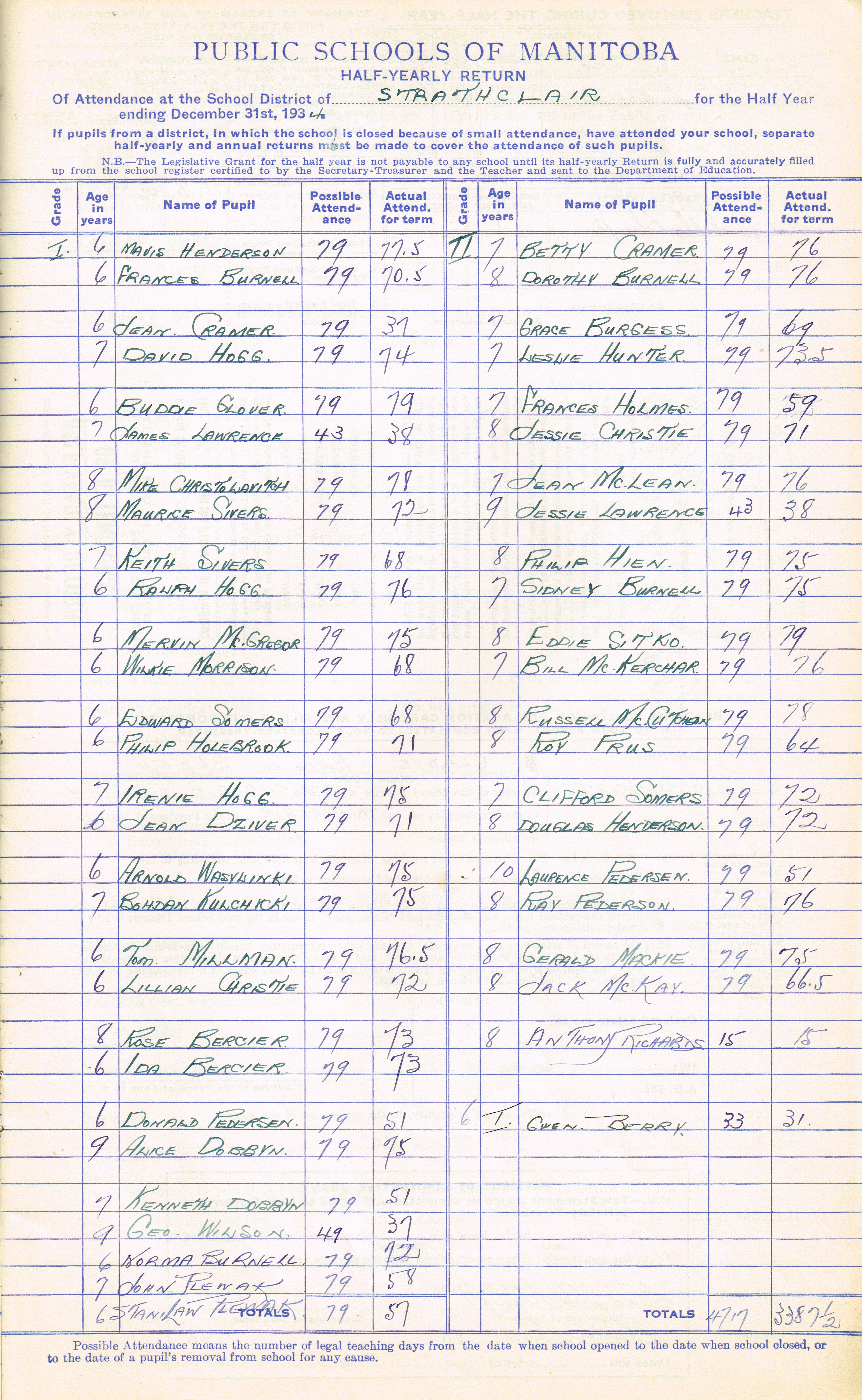 Notes Gladys Sleigh (teacher), Mavis Henderson (G. 1), Frances Burnell (G. 1), Jean Cramer (G. 1), David Hogg (G. 1), Buddie Glover (G. 1), Mike Christolavich (G. 1), Maurice Sivers (G. 1), Keith Sivers (G. 1), Ralph Hogg (G. 1), Mervin McGregor (G. 1), Wilkie Morrison (G. 1), Edward Somers (G. 1), Philip Holebrook (G. 1), Irene Hogg (G. 1), Jean Dziver (G. 1), Arnold Wasylynko (G. 1), Bohdan Kulchyski (G. 1), Tom Millman (G. 1), Lillian Christie (G. 1), Rose Bercier (G. 1), Ida Bercier (G. 1), Don Pedersen (G. 1), Alice Dobbyn (G. 1), Ken Dobbyn (G. 1), Norma Burnell (G. 1), John Plewak (G. 1), Stanilaw (Stanley) Plewak (G. 1), Betty Cramer (G. 2), Dorothy Burnell (G. 2), Grace Burgess (G. 2), Leslie Hunter (G. 2), Frances Holmes (G. 2), Jessie Christie (G. 2), Jean McLean (G. 2), Philip Hien (G. 2), Sidney Burnell (G. 2), Eddie Sitko (G. 2), Bill McKerchar (G. 2), Russell McCutcheon (G. 2), Roy Prus (G. 2), Clifford Somers (G. 2), Douglas Henderson (G. 2), L. (Lawrence) Pedersen (G. 2), R. (Ray) Pedersen (G. 2), Gerald Mackie (G. 2), Jack McKay (G. 2), Anthony Richards (G. 2).