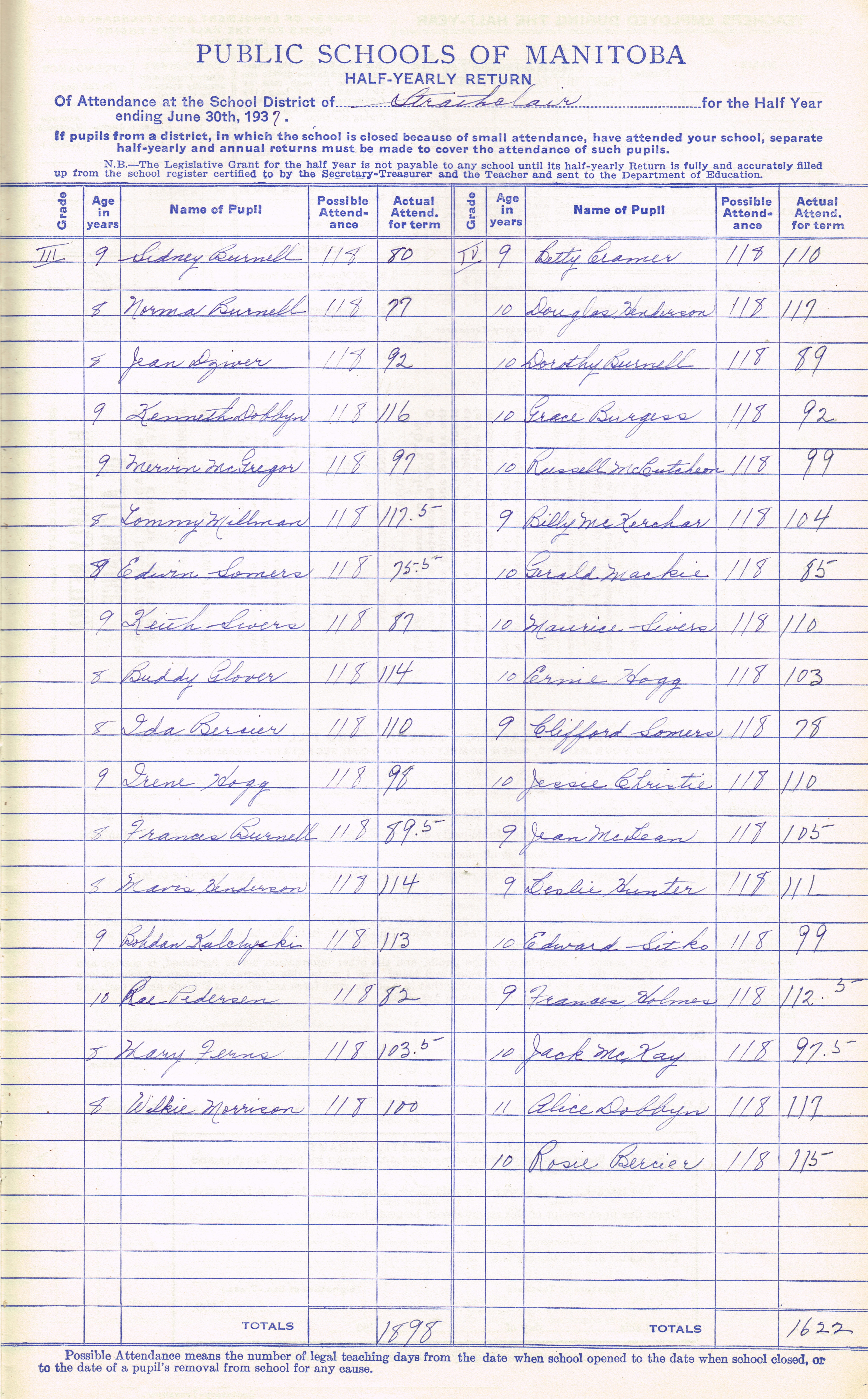 Description Eva Bennett (teacher), Sidney Burnell (G. 3), Norma Burnell (G. 3), Jean Dziver (G. 3), Kenneth Dobbyn (G. 3), Mervin McGregor (G. 3), Tommy Millman (G. 3), Edwin Somers (G. 3), Keith Sivers (G. 3), Buddy Glover (G. 3), Ida Bercier (G. 3), Irene Hogg (G. 3), Frances Burnell (G. 3), Mavis Henderson (G. 3), Bohdan Kulchyski (G. 3), Rae Pedersen (G. 3), Mary Ferns (G. 3), Wilkie Morrison (G. 3), Betty Cramer (G. 4), Douglas Henderson (G. 4), Dorothy Burnell (G. 4), Grace Burgess (G. 4), Russell McCutcheon (G. 4), Billy McKerchar (G. 4), Gerald Mackie (G. 4), Maurice Sivers (G. 4), Ernie Hogg (G. 4), Clifford Somers (G. 4), Jessie Christie (G. 4), Jean McLean (G. 4), Leslie Hunter (G. 4), Edward Sitko (G. 4), Frances Holmes (G. 4), Jack McKay (G. 4), Alice Dobbyn (G. 4), Rosie Bercier (G. 4).