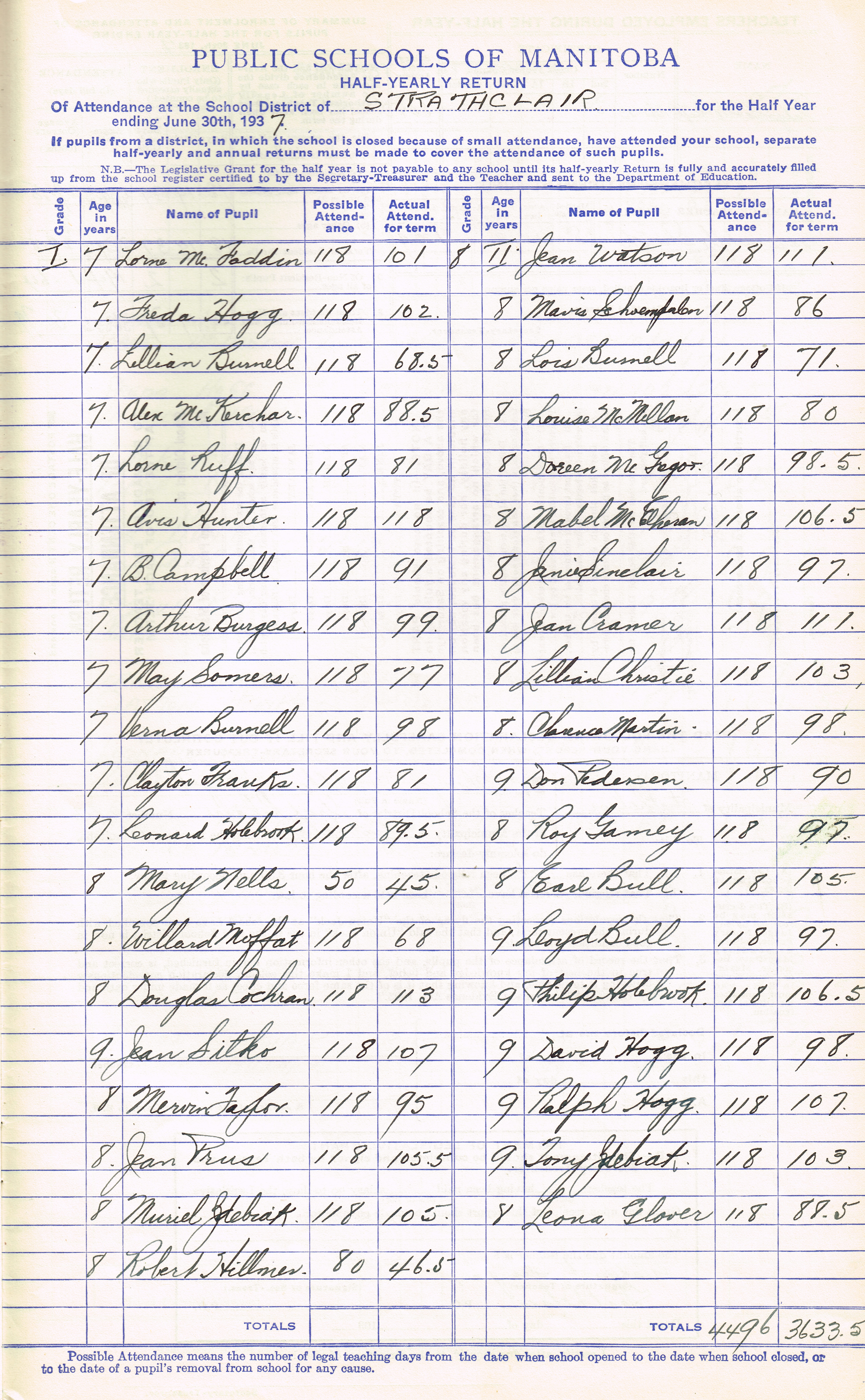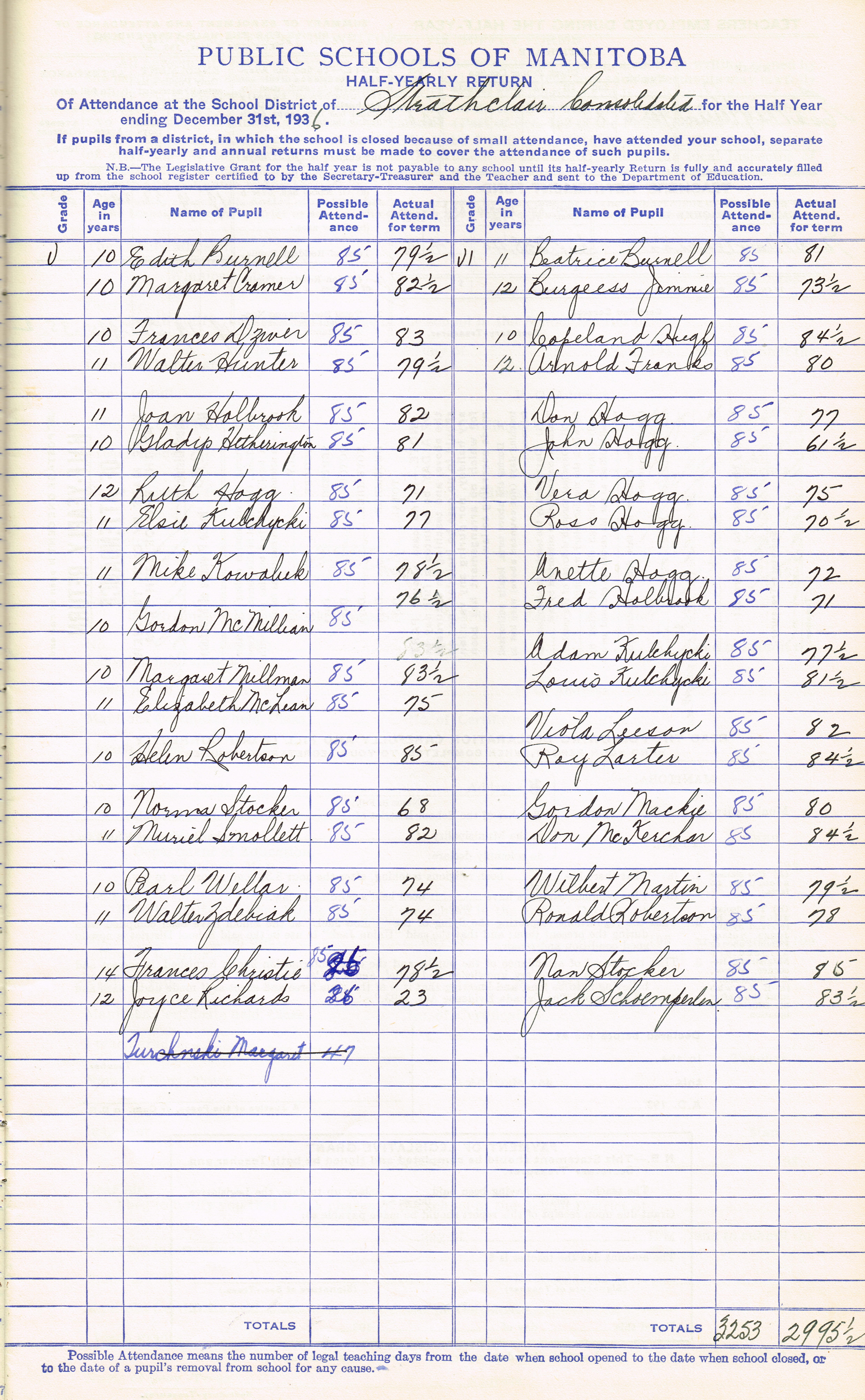 Description Gladys Sleigh (teacher), Lorne McFaddin (G. 1), Freda Hogg (G. 1), Lillian Burnell (G. 1), Alex McKerchar (G. 1), Lorne Ruff (G. 1), Avis Hunter (G. 1), B. Campbell (G. 1), Arthur Burgess (G. 1), May Somers (G. 1), Verna Burnell (G. 1), Clayton Franks (G. 1), Leonard Holebrook (G. 1), Mary Wells (G. 1), Willard Moffat (G. 1), Douglas Cochran (G. 1), Jean Sitko (G. 1), Mervin Taylor (G. 1), Jean Prus (G. 1), Muriel Zdebiak (G. 1),Robert Hillmer (G. 1), Jean Watson (G. 2), Mavis Schoemperlen (G. 2), Lois Burnell (G. 2), Louise McMillan (G. 2), Doreen McGregor (G. 2), Mabel McElheran (G. 2), Janie Sinclair (G. 2), Jean Cramer (G. 2), Lillian Christie (G. 2), Clarence Martin (G. 2), Don Pedersen (G. 2), Roy Gamey (G. 2), Earl Bull (G. 2), Lloyd Bull (G. 2), Philip Holebrook (G. 2), David Hogg (G. 2), Ralph Hogg (G. 2), Tony Zdebiak (G. 2), Leona Glover (G. 2).