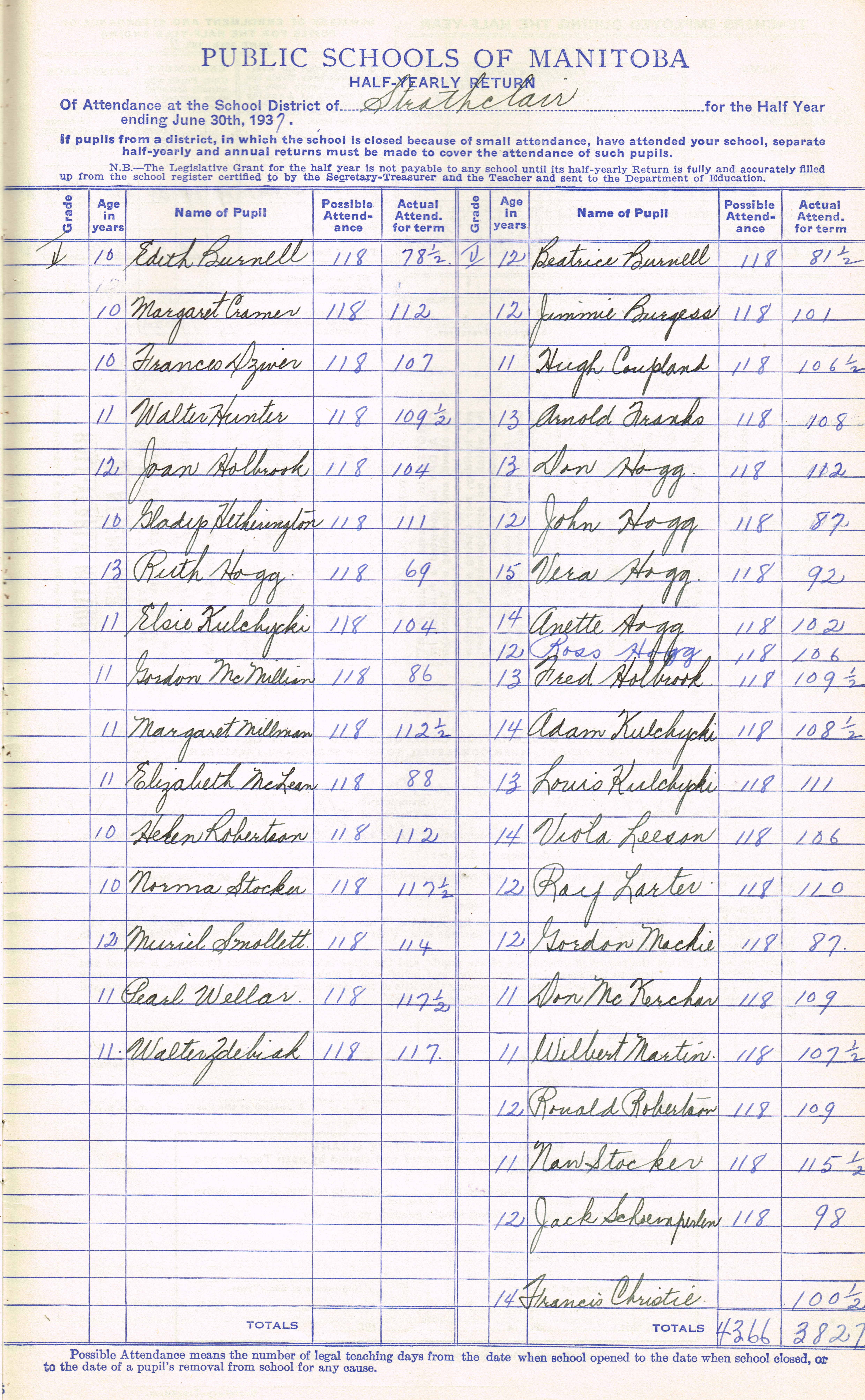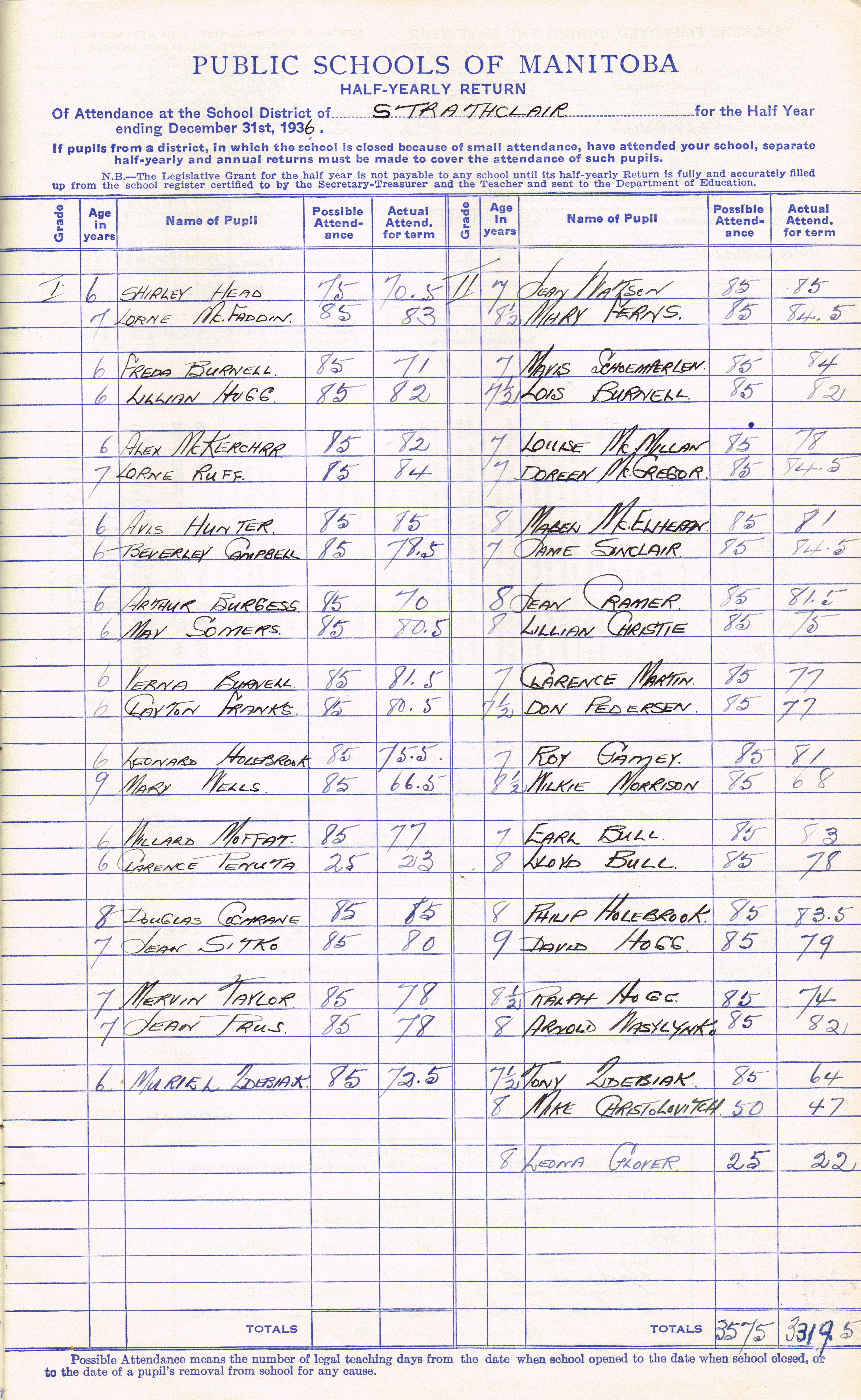 Notes Gladys Sleigh (teacher), Shirley Head (G. 1), Lorne McFaddin (G. 1), Freda Burnell (Hogg) (G. 1), Lillian Hogg (Burnell) (G. 1), Alex McKerchar (G. 1), Lorne Ruff (G. 1), Avis Hunter (G. 1), Beverly Campbell (G. 1), Arthur Burgess (G. 1), May Somers (G. 1), Verna Burnell (G. 1), Clayton Franks (G. 1), Leonard Holebrook (G. 1), Mary Wells (G. 1), Willard Moffat (G. 1), Clarence Penuta (G. 1), Douglas Cochrane (G. 1), Jean Sitko (G. 1), Mervin Taylor (G. 1), Jean Prus (G. 1), Muriel Zdebiak (G. 1), Jean Watson (G. 2), Mary Ferns (G. 2), Mavis Schoemperlen (G. 2), Lois Burnell (G. 2), Louise McMillan (G. 2), Doreen McGregor (G. 2), Mabel McElheran (G. 2), Janie Sinclair (G. 2), Jean Cramer (G. 2), Lillian Christie (G. 2), Clarence Martin (G. 2), Don Pedersen (G. 2), Roy Gamey (G. 2), Wilkie Morrison (G. 2), Earl Bull (G. 2), Lloyd Bull (G. 2), Philip Holebrook (G. 2), David Hogg (G. 2), Ralph Hogg (G. 2), Arnold Wasylynko (G. 2), Tony Zdebiak (G. 2), Mike Christolovitch (G. 2), Leona Glover (G. 2).