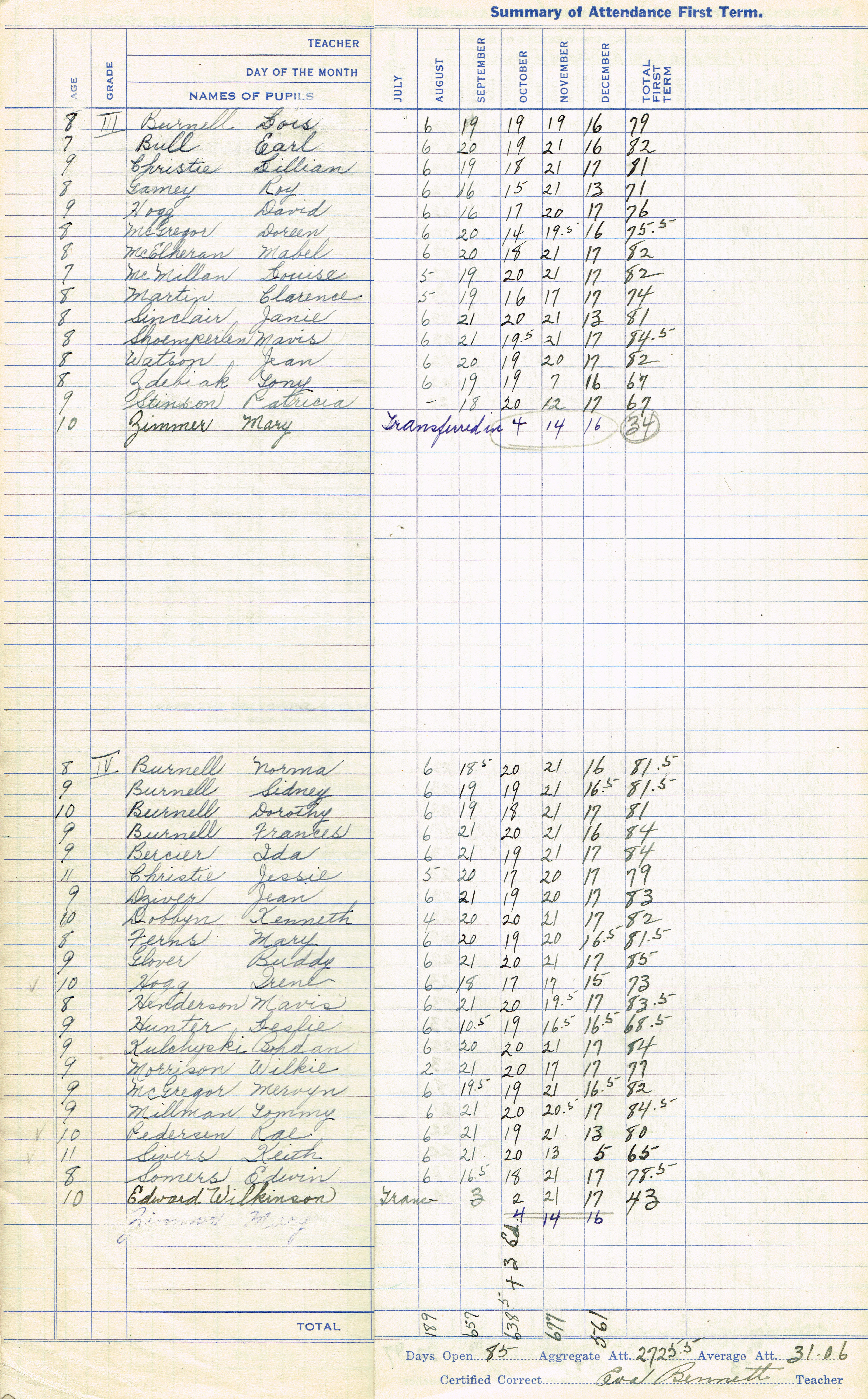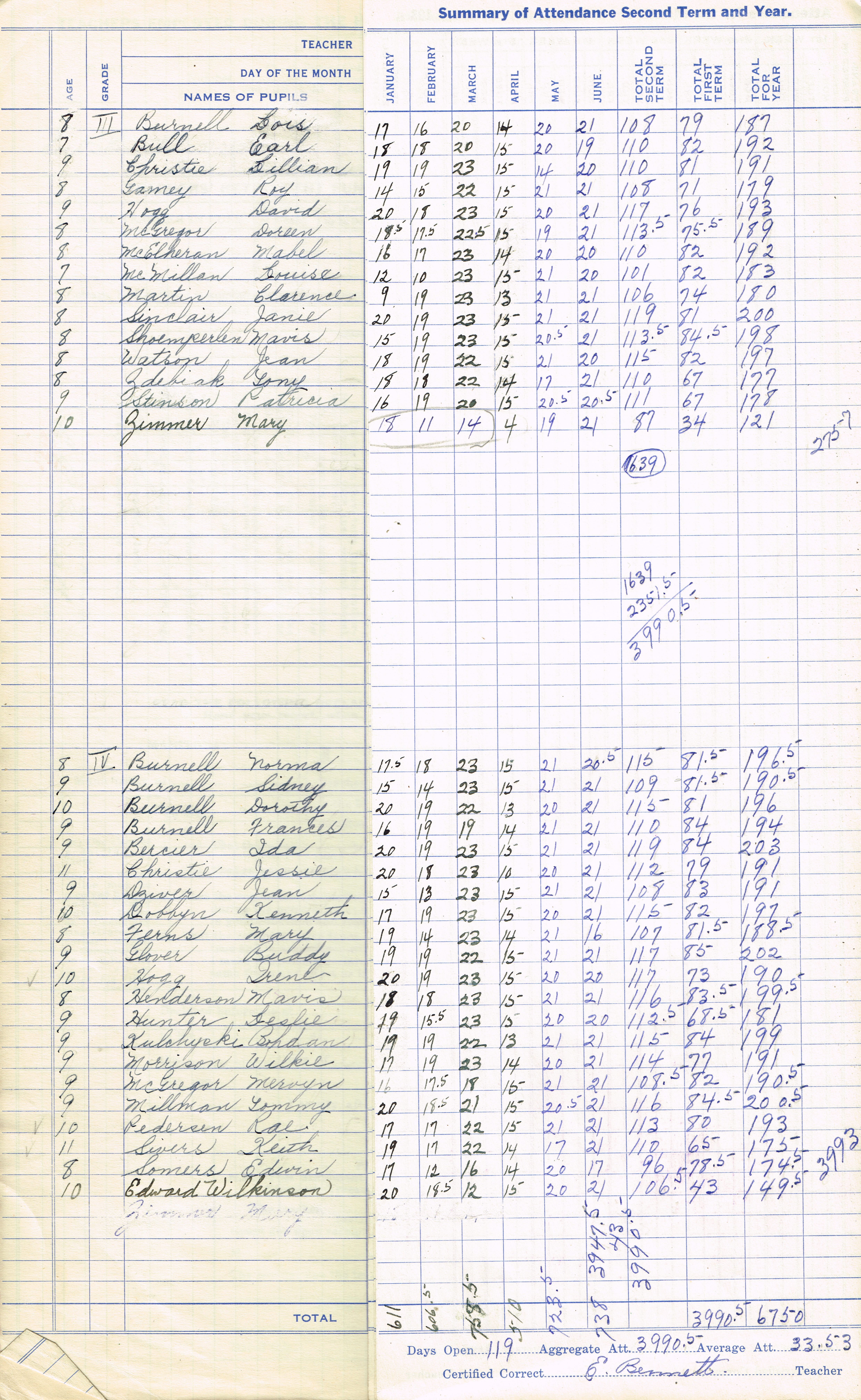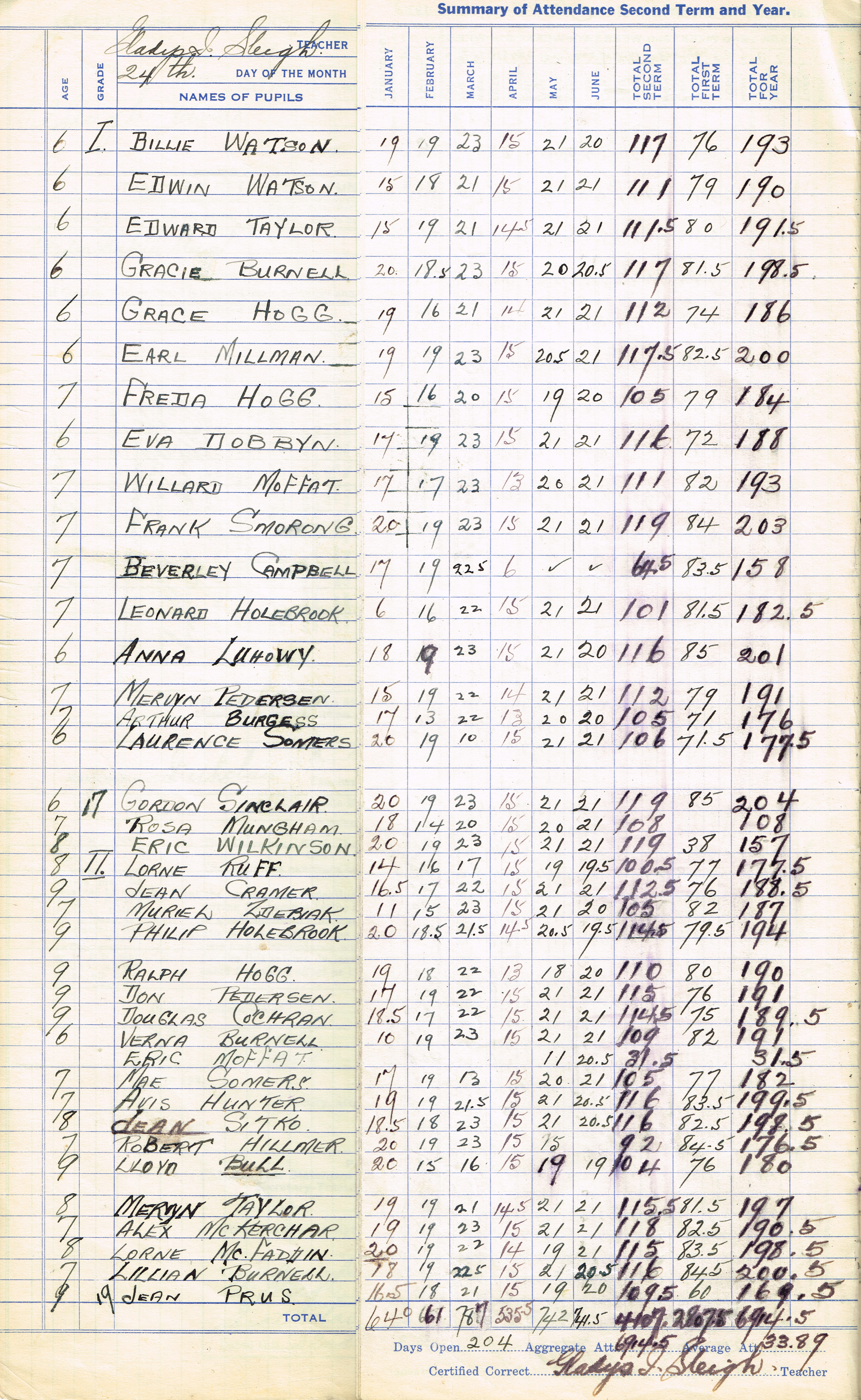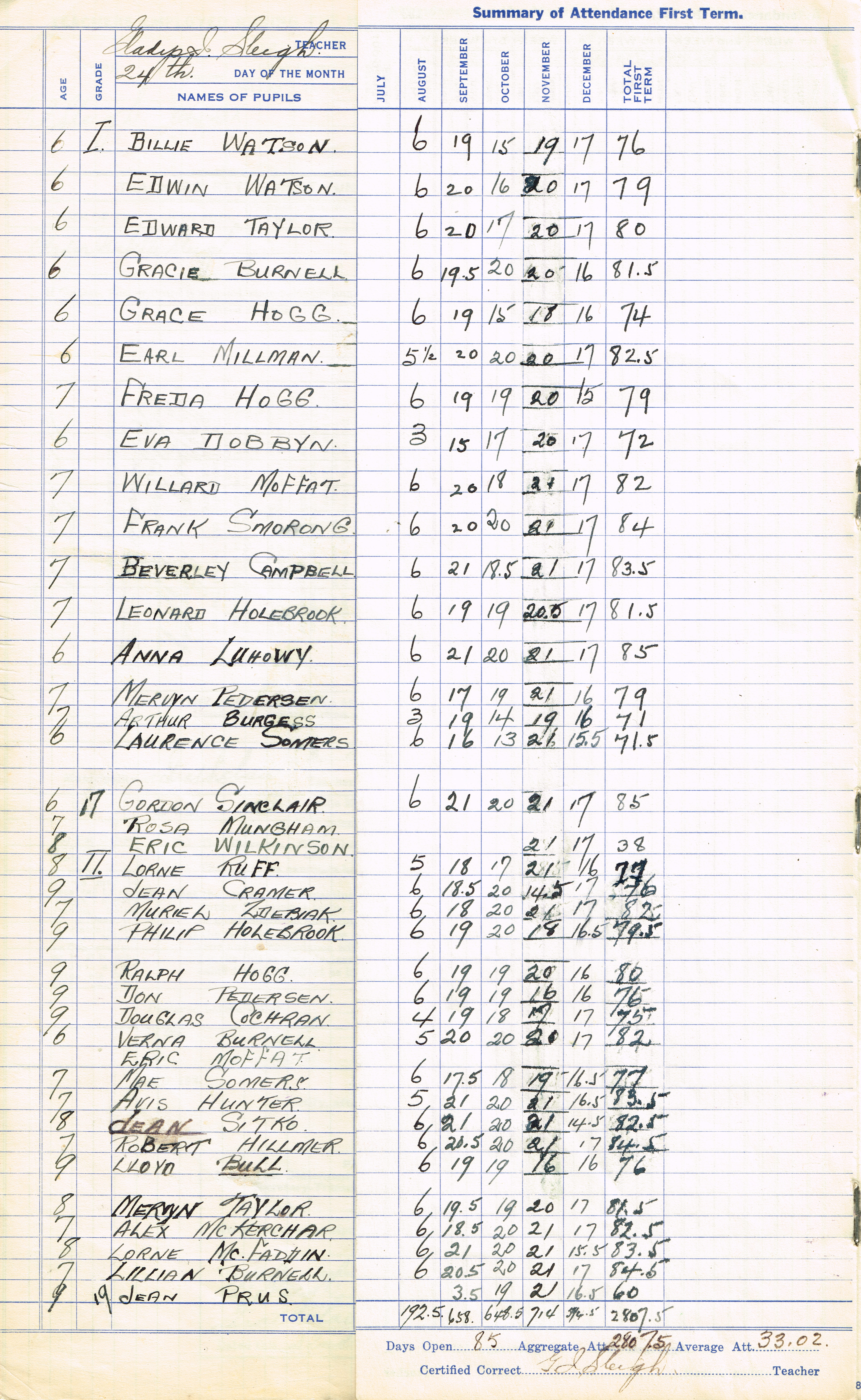 Description Gladys Sleigh (teacher), Billie Watson (G. 1), Edwin Watson (G. 1), Edward Taylor (G. 1), Gracie Burnell (G. 1), Grace Hogg (G. 1), Earl Millman (G. 1), Freda Hogg (G. 1), Eva Dobbyn (G. 1), Willard Moffat (G. 1), Frank Smorong (G. 1), Beverly Campbell (G. 1), Leonard Holebrook (G. 1), Anna Luhowy (G. 1), Mervyn Pedersen (G. 1), Arthur Burgess (G. 1), Laurence Somers (G. 1), Gordon Sinclair (G. 1), Rosa Mungham (G. 1), Eric Wilkinson (G. 1), Lorne Ruff (G. 2), Jean Cramer (G. 2), Muriel Zdebiak (G. 2), Philip Holebrook (G. 2), Ralph Hogg (G. 2), Don Pedersen (G. 2), Douglas Cochran (G. 2), Verna Burnell (G. 2), Eric Moffat (G. 2), Mae Somers (G. 2), Avis Hunter (G. 2), Jean Sitko (G. 2), Robert Hillmer (G. 2), Lloyd Bull (G. 2), Mervyn Taylor (G. 2), Alex McKerchar (G. 2), Lorne McFaddin (G. 2), Lillian Burnell (G. 2), Jean Prus (G. 2).