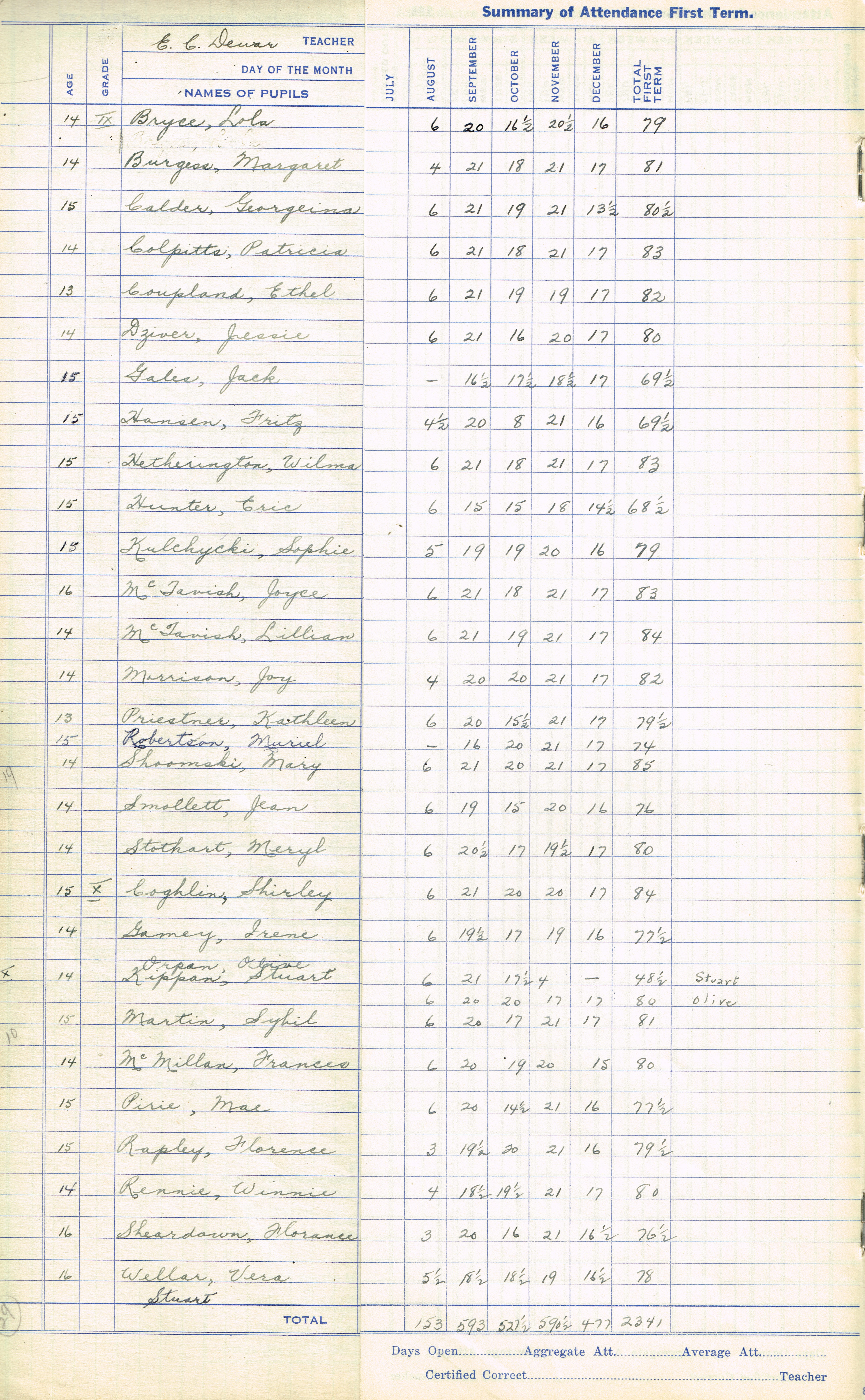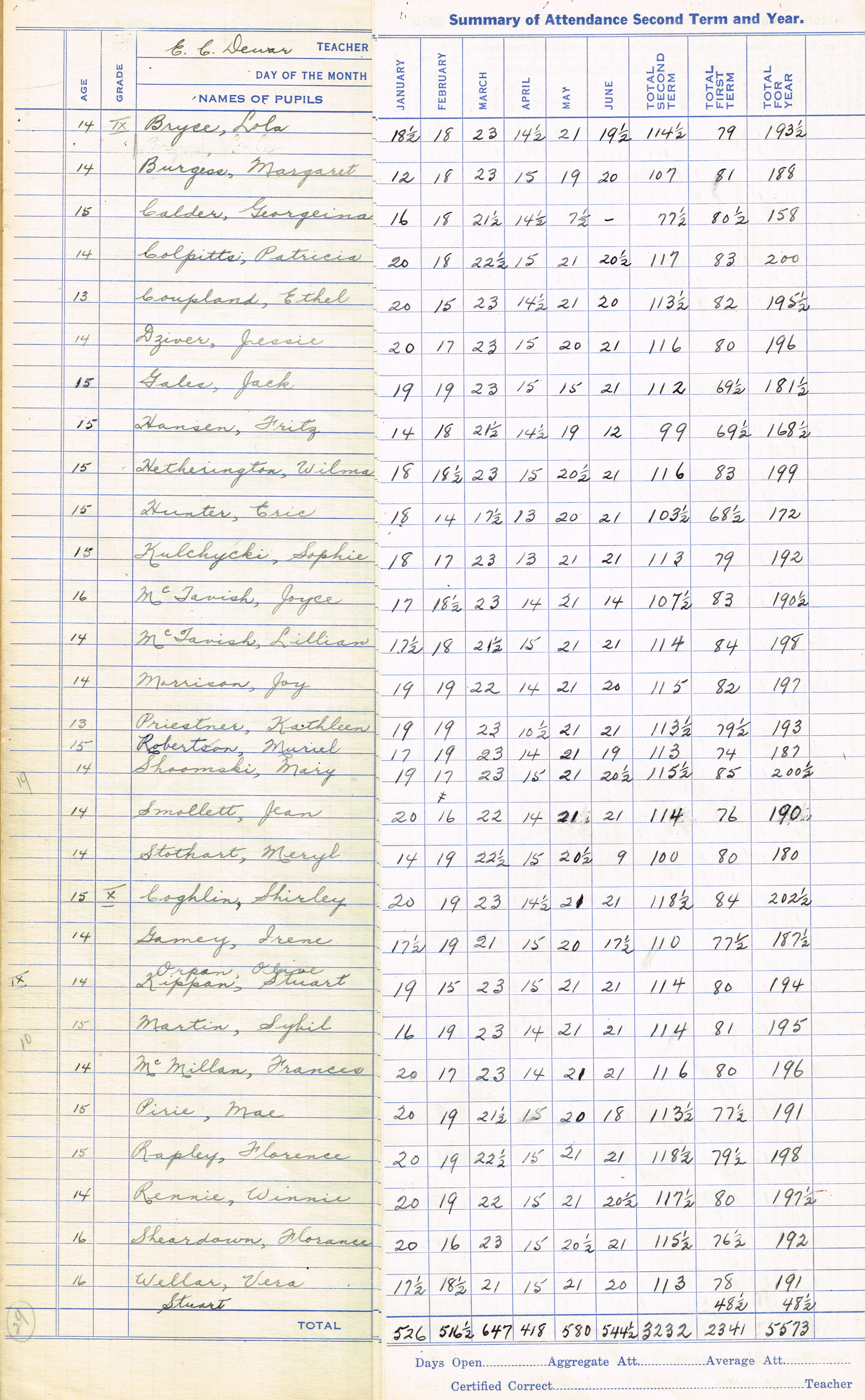 Description E. C. Dewar (teacher), Lola Bryce (G. 9), Margaret Burgess (G. 9), Georgina Calder (G. 9), Patricia Colpitts (G. 9), Ethel Coupland (G. 9), Jessie Dziver (G. 9), Jack Gales (G. 9), Fritz Hansen (G. 9), Wilma Hetherington (G. 9), Eric Hunter (G. 9), Sophie Kulchycki (G. 9), Joyce McTavish (G. 9), Lillian McTavish (G. 9), Joy Morrison (G. 9), Kathleen Priestner (G. 9), Muriel Robertson (G. 9), Mary Shoomski (G. 9), Jean Smollett (G. 9), Meryl Stothart (G. 9), Shirley Coghlin (G. 9), Irene Gamey (G. 9), Olive Orpan (G. 10), Stuart Kippan (G. 10), Sybil Martin (G. 10), Frances McMillan (G. 10), Mae Pirie (G. 10), Florence Rapley (G. 10), Winnie Rennie (G. 10), Florence Sheardown (G. 10), Vera Wellar (G. 10).