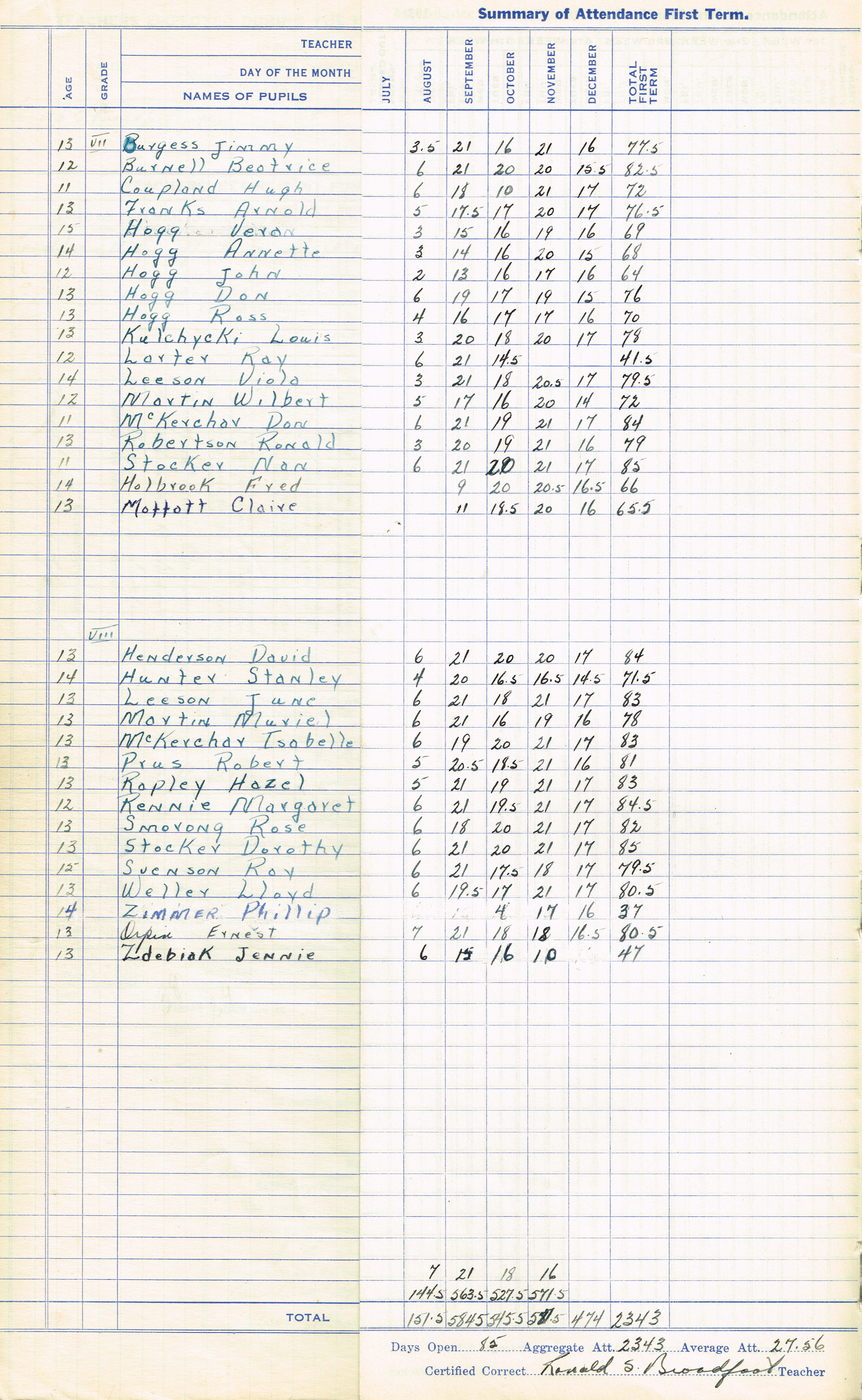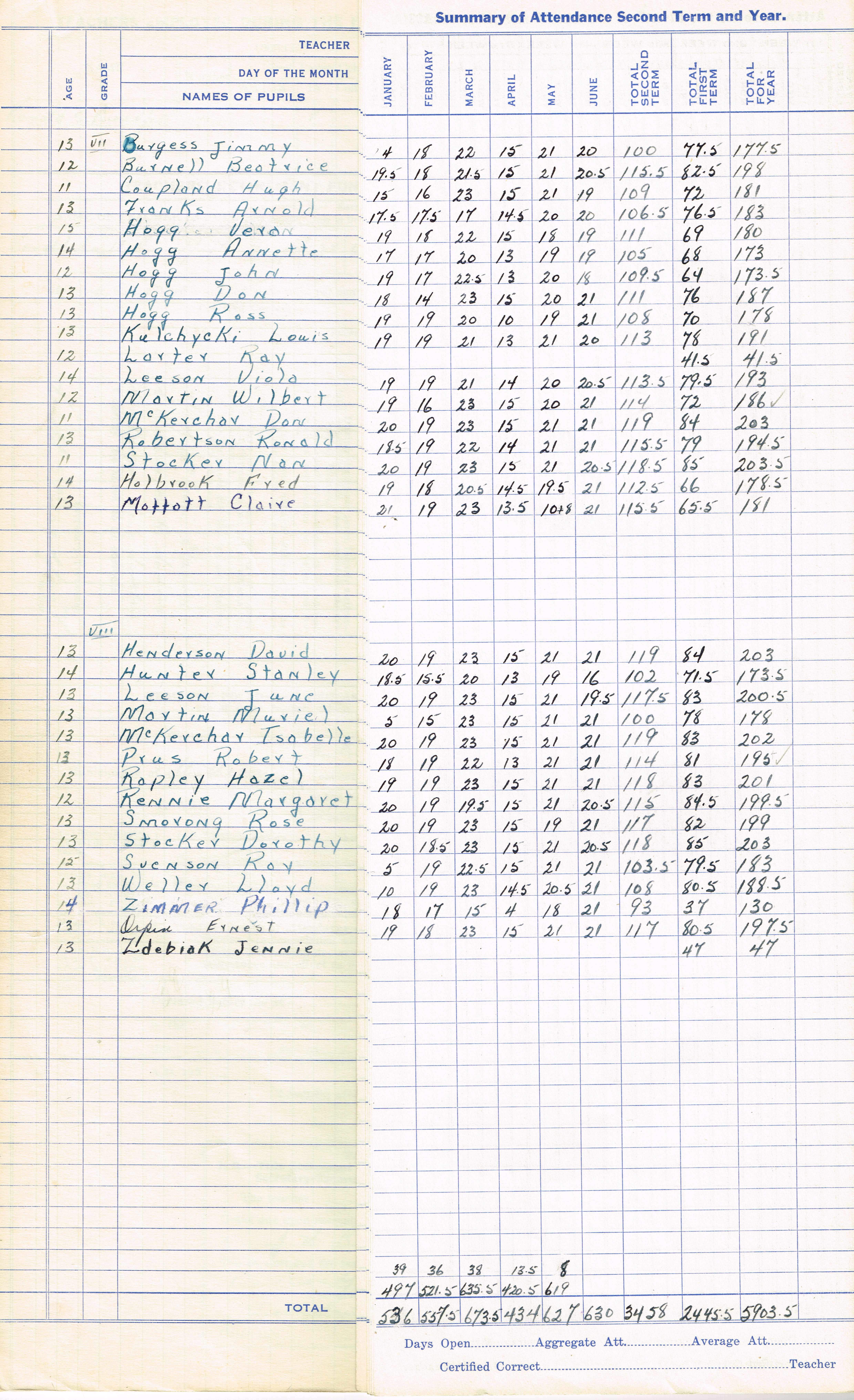 Description Ronald S. Broadfoot (teacher), Jimmy Burgess (G. 7), Beatrice Burnell (G. 7), Hugh Coupland (G. 7), Arnold Franks (G. 7), Vera Hogg (G. 7), Annette Hogg (G. 7), John Hogg (G. 7), Don Hogg (G. 7), Ross Hogg (G. 7), Louis Kulchycki (G. 7), Ray Larter (G. 7), Viola Leeson (G. 7), Wilbert Martin (G. 7), Don McKerchar (G. 7), Ronald Robertson (G. 7), Nan Stocker (G. 7), Fred Holbrook (G. 7), Claire Moffatt (G. 7), David Henderson (G. 8), Stanley Hunter (G. 8), June Leeson (G. 8), Muriel Martin (G. 8), Isabelle McKerchar (G. 8), Robert Prus (G. 8), Hazel Rapley (G. 8), Margaret Rennie (G. 8), Rose Smorong (G. 8), Dorothy Stocker (G. 8), Ray Svenson (G. 8), Lloyd Wellar (G. 8), Phillip Zimmer (G. 8), Ernest Orpin (G. 8), Jennie Zdebiak (G. 8).