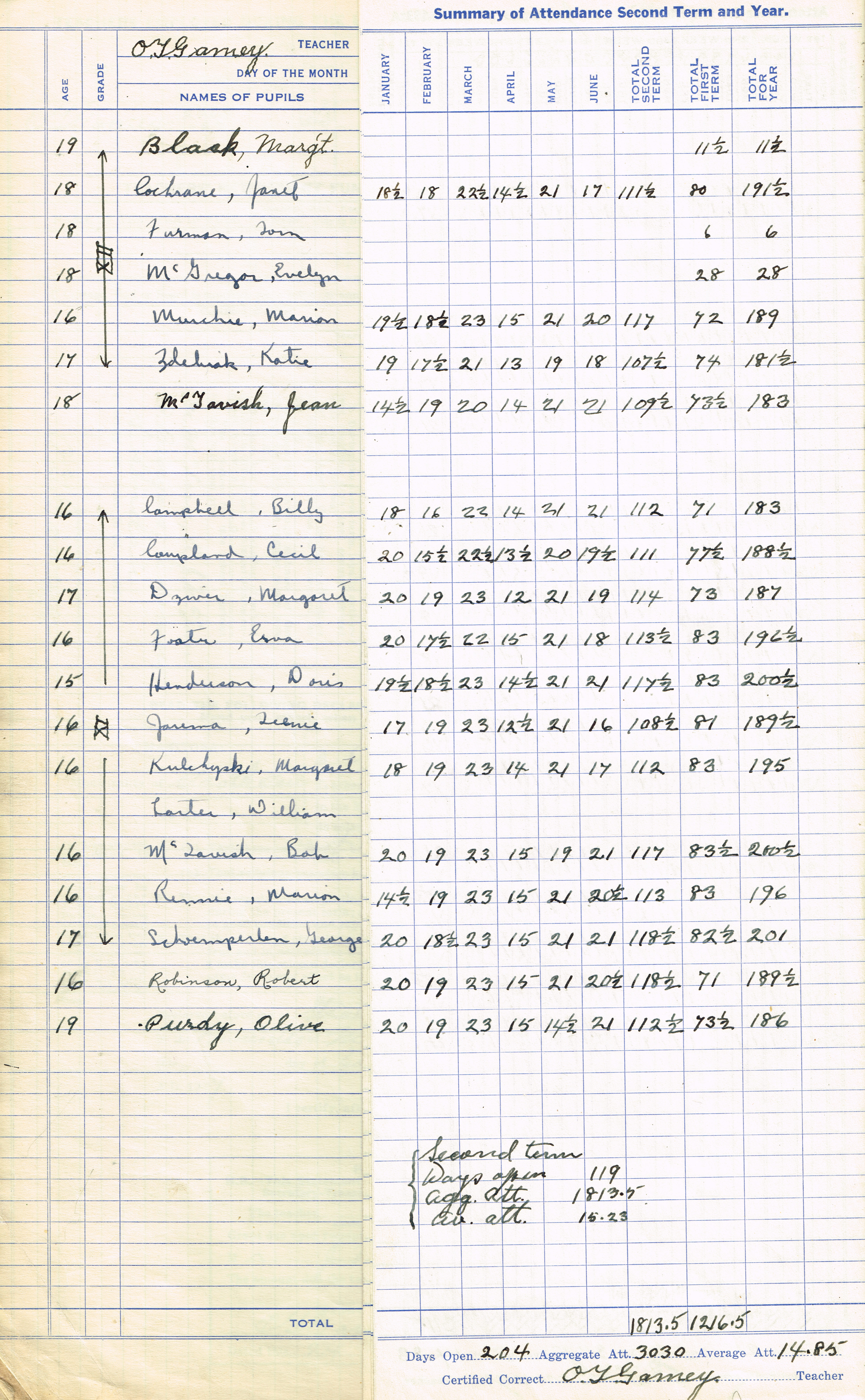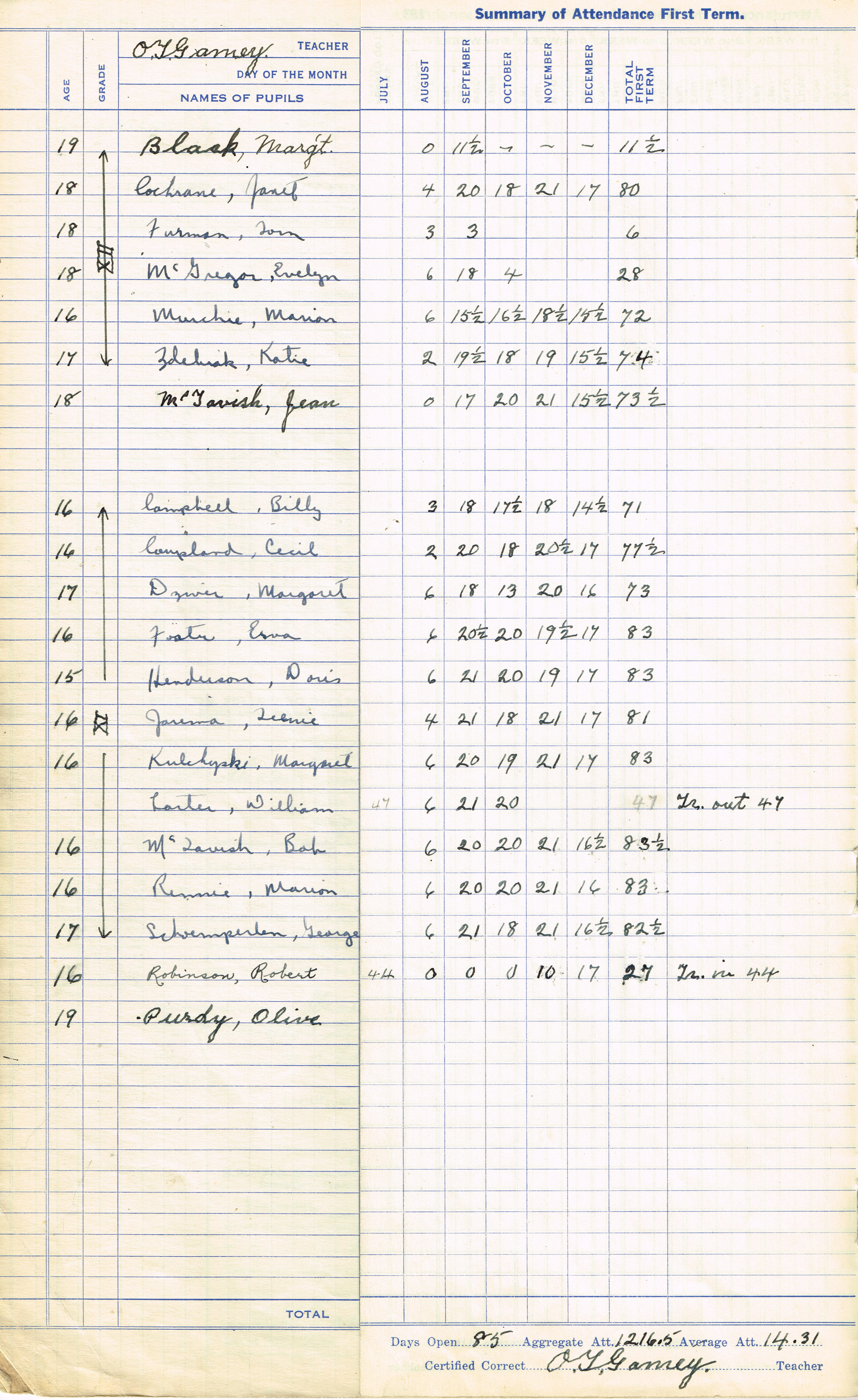 Description O. T. Gamey (teacher), Margaret Black (G. 12), Janet Cochrane (G. 12), Tom Furman (G. 12), Evelyn McGregor (G. 12), Marion Murchie (G. 12), Katie Zdebiak (G. 12), Jean McTavish (G. 12), Billy Campbell (G. 11), Cecil Coupland (G. 11), Margaret Dziver (G. 11), Erva Foster (G. 11), Doris Henderson (G. 11), Teenie Jarema (G. 11), Margeret Kulchyski (G. 11), William Larter (G. 11), Bob McTavish (G. 11), Marion Rennie (G. 11), George Schoemperlen (G. 11), Robert Robinson (G. 11), Olive Purdy (G. 11).