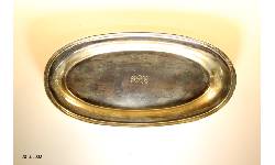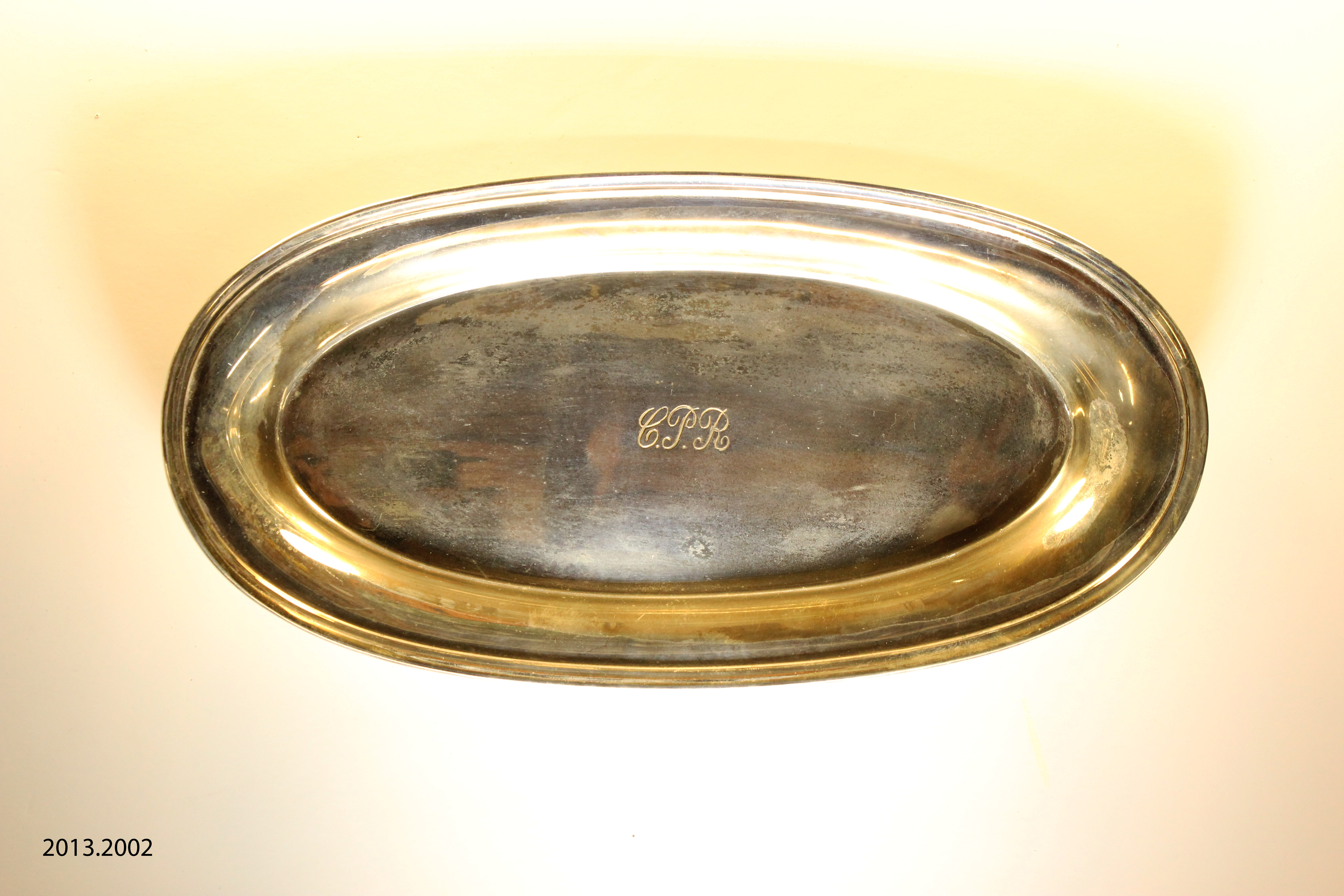 Object Desc 11 inch bread tray used for bread and crackers service on Canadian Pacific dining cars. Bears the "Elkington Plate" hallmark.