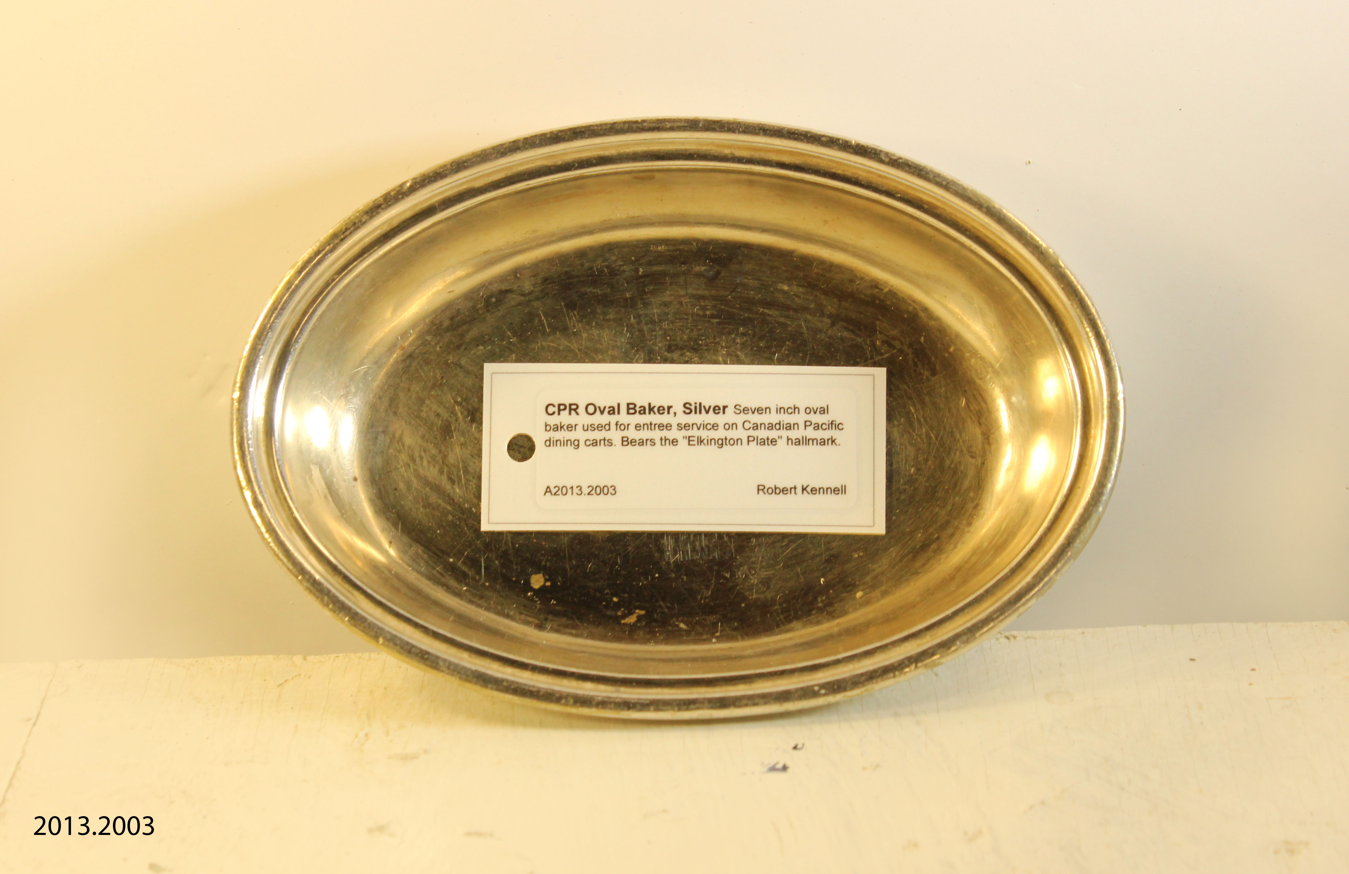 Object Desc Seven inch oval baker used for entree service on Canadian Pacific dining carts. Bears the "Elkington Plate" hallmark.