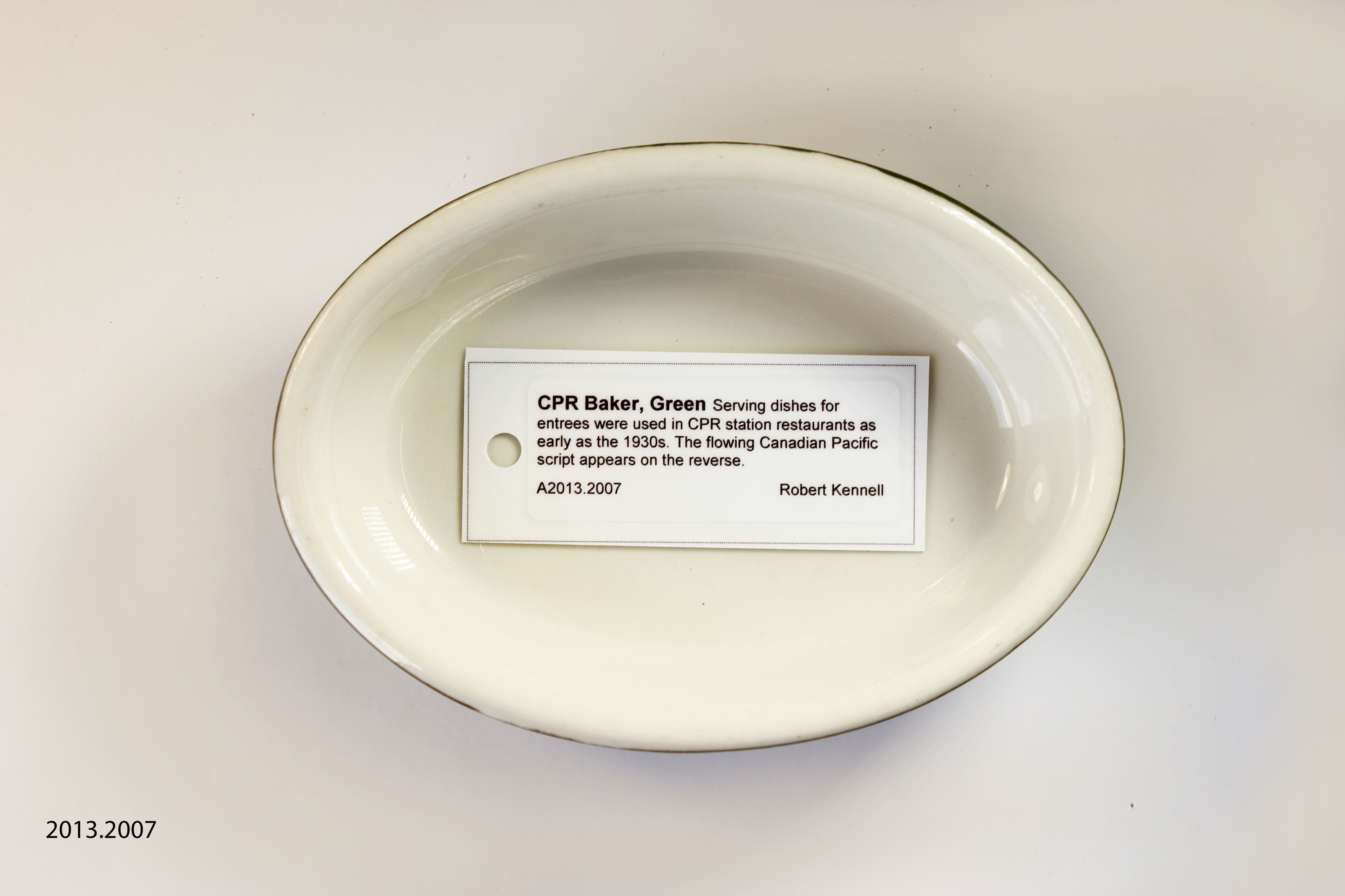 Object Desc Serving dishes for entrees were used in CPR station restaurants as early as the 1930s. The flowing Canadian Pacific script appears on the reverse.