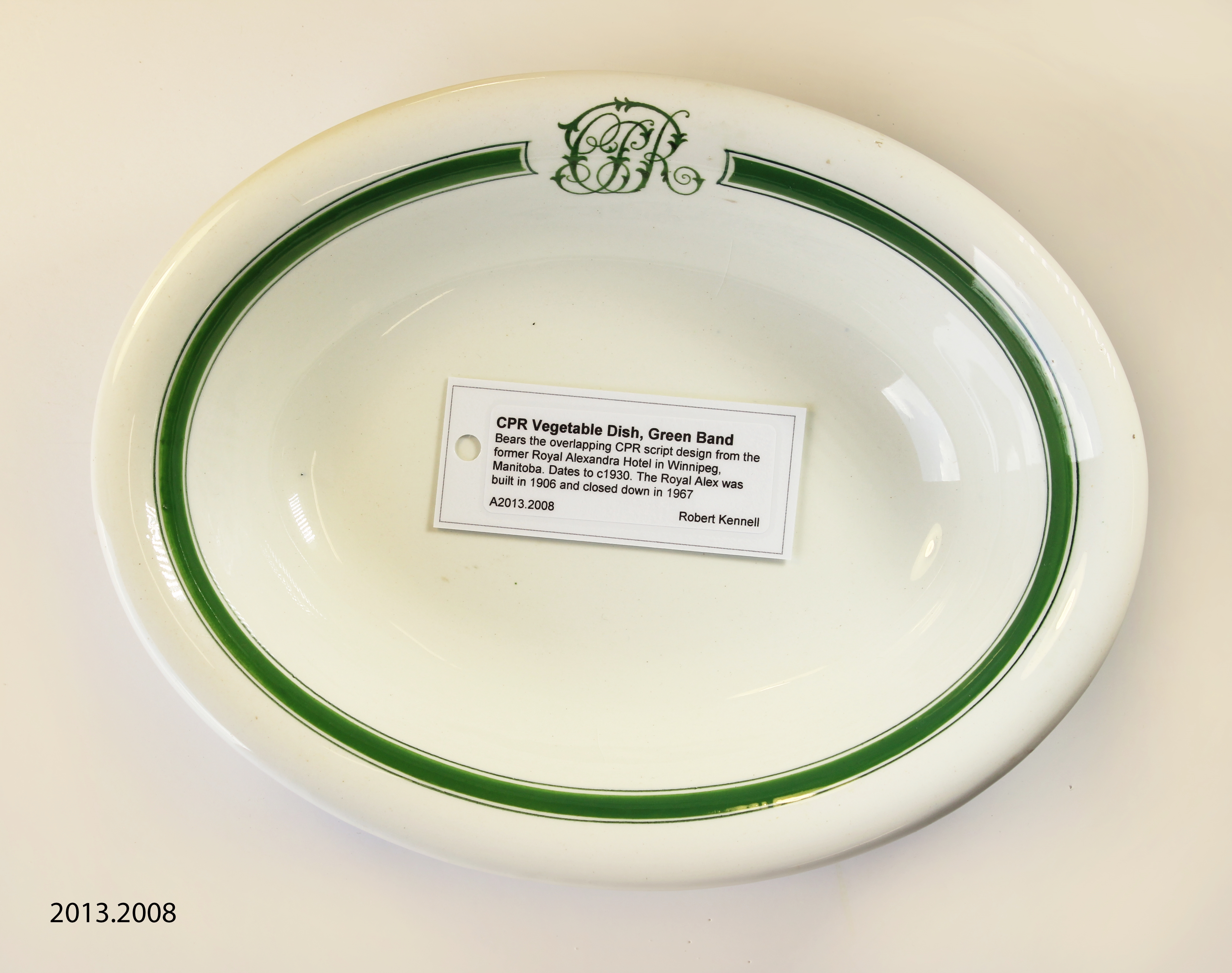 Object Desc Bears the overlapping CPR script design from the former Royal Alexandra Hotel in Winnipeg, Manitoba. Dates to c1930. The Royal Alex was built in 1906 and closed down in 1967