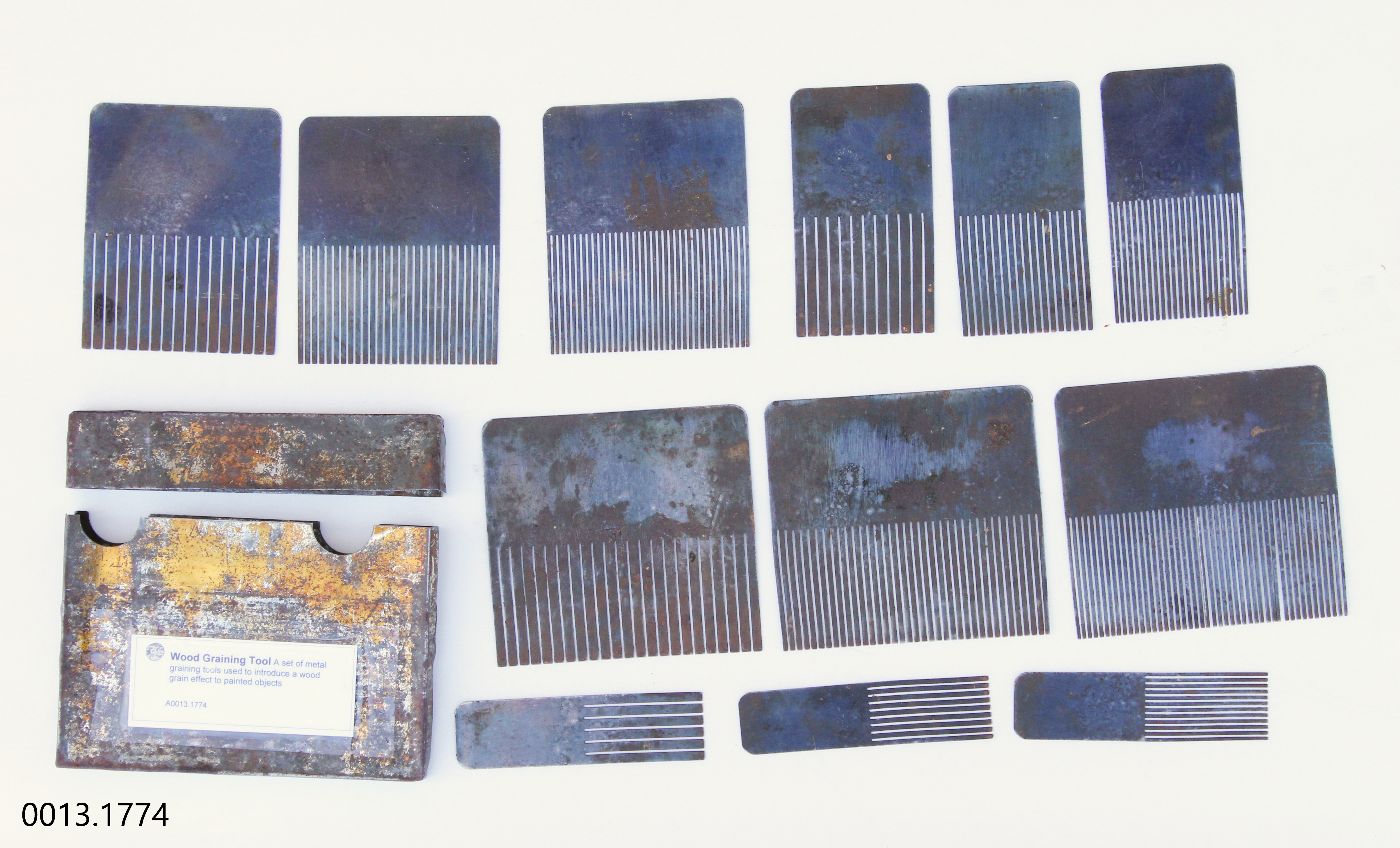 Object Desc A set of metal graining tools used to introduce a wood grain effect to painted objects
