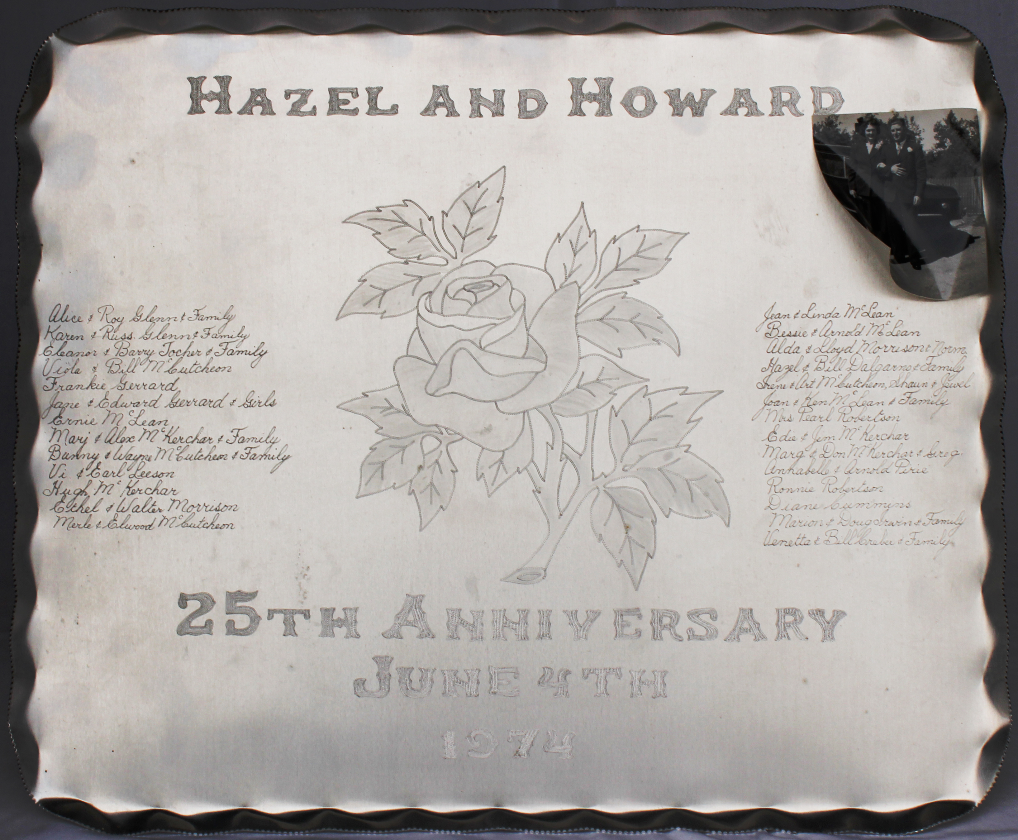 Object Desc Silver tray, Hazel & Howard McNulty's 25th Anniversary, June 4 1974
