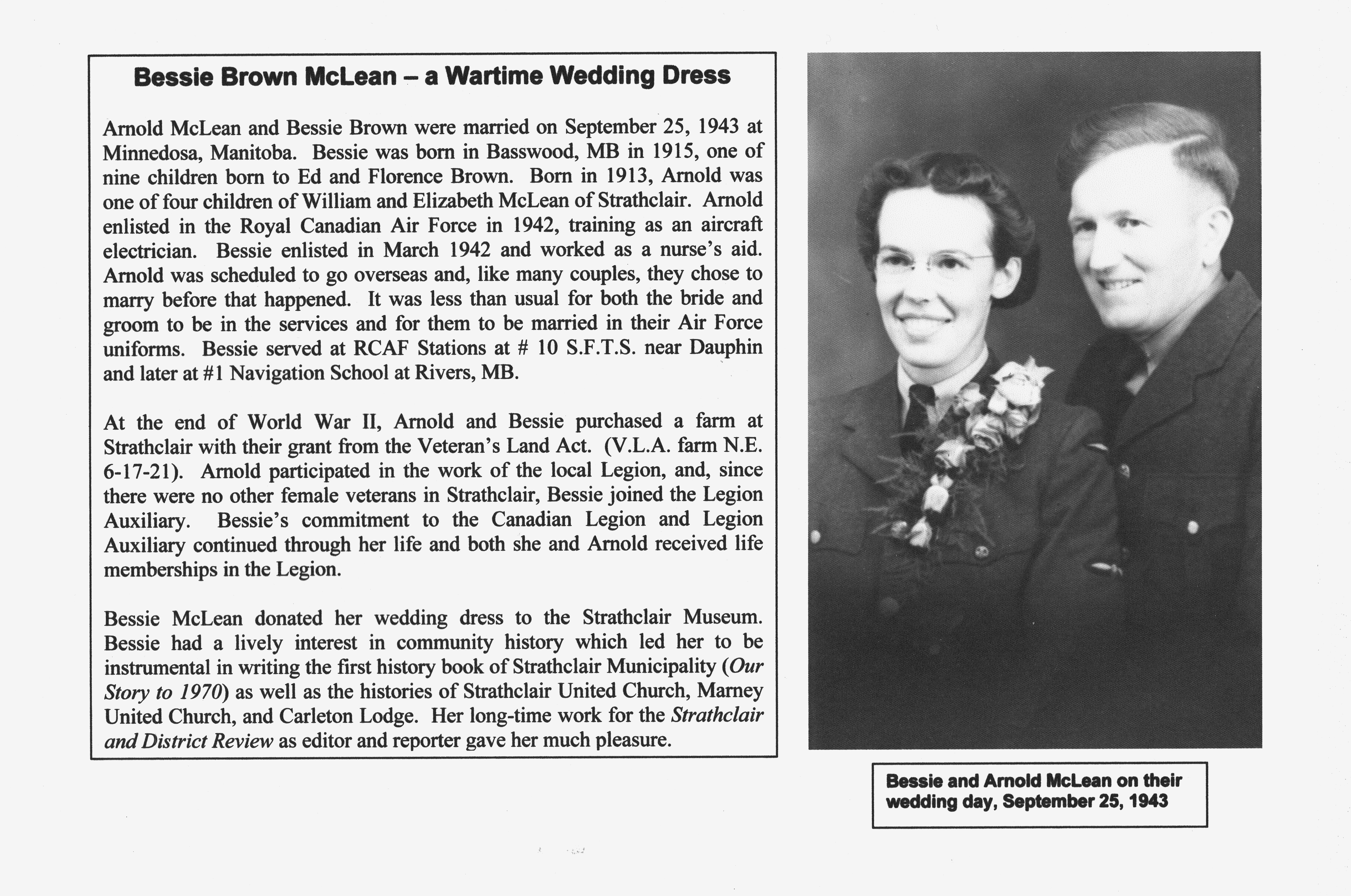Description Bessie Brown married Arnold McLean Sept 25, 1943 in Minnedosa. The wedding photo featured both in their military uniforms.