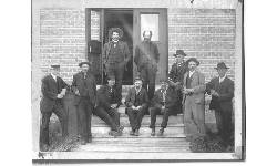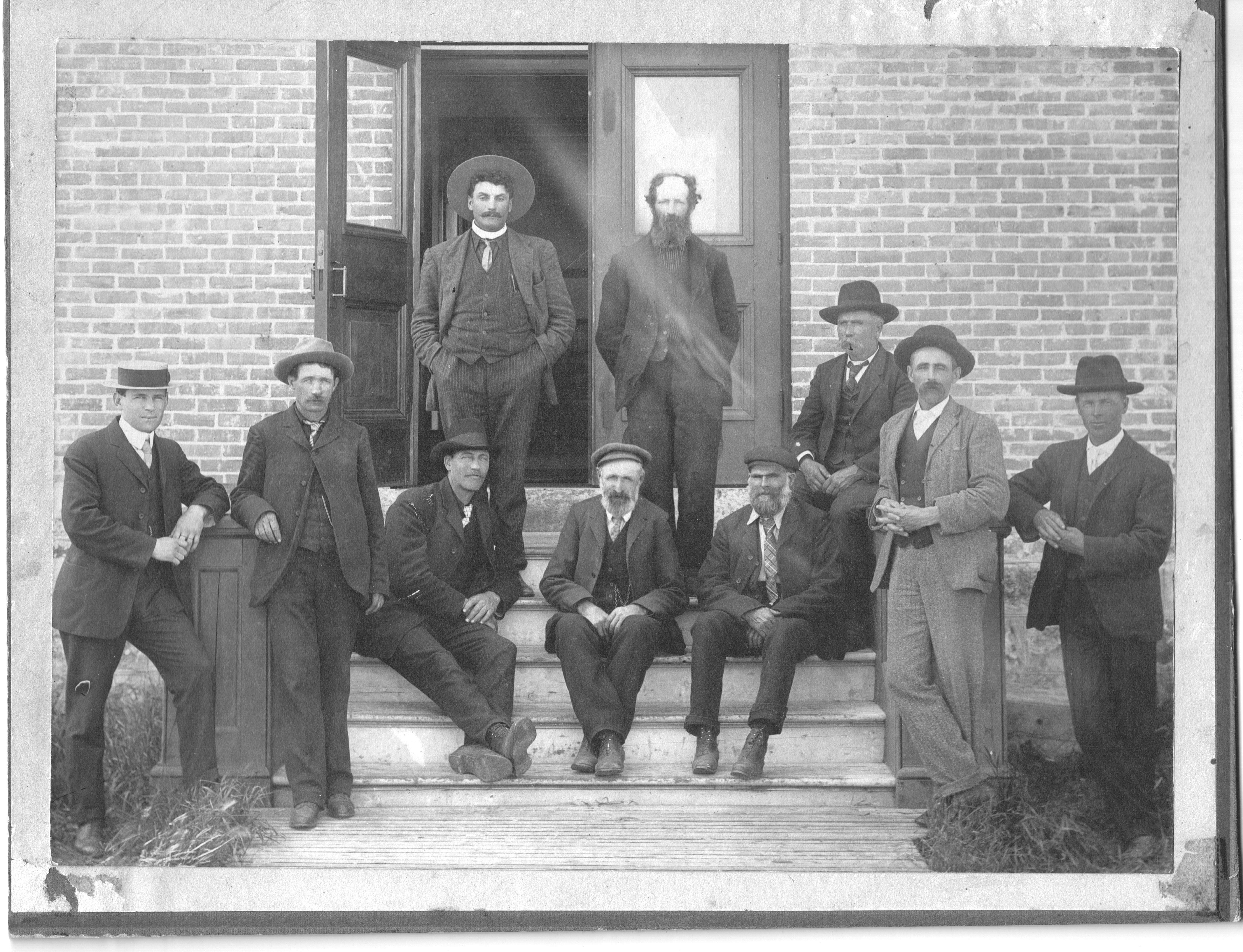 Object Desc Councillors in front of the Strathclair Municipal Hall in 1908. Councillor Wm Geekie, MR. Archie Kippen, Councillor Pat McNutty. Front Row: Wm Tripp (banker), Councillor Wm Harrower, SecTreas A. McIntyre and Councillor Fred Williamson.