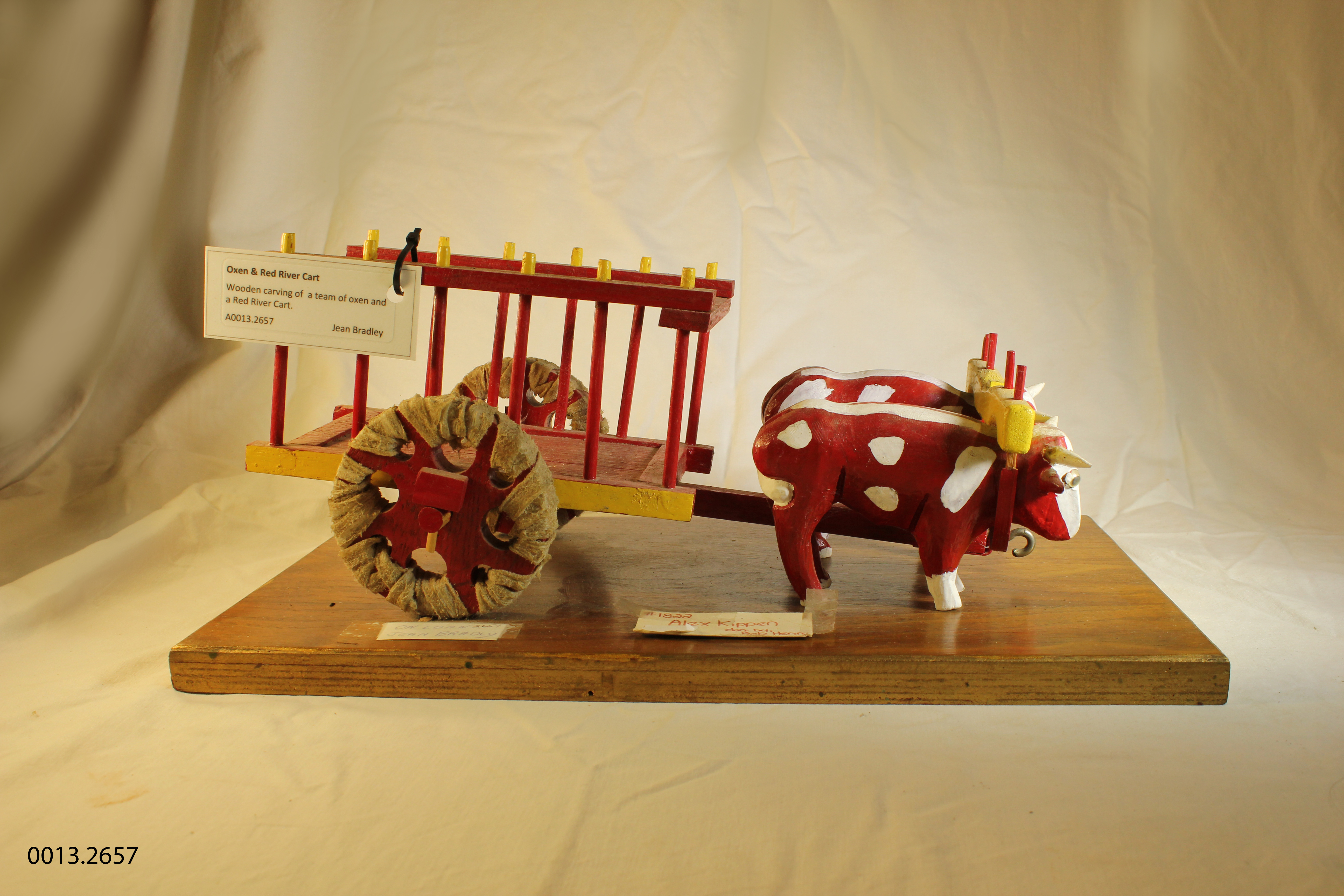 Object Desc Wooden carving of a team of oxen and a Red River Cart.