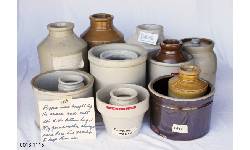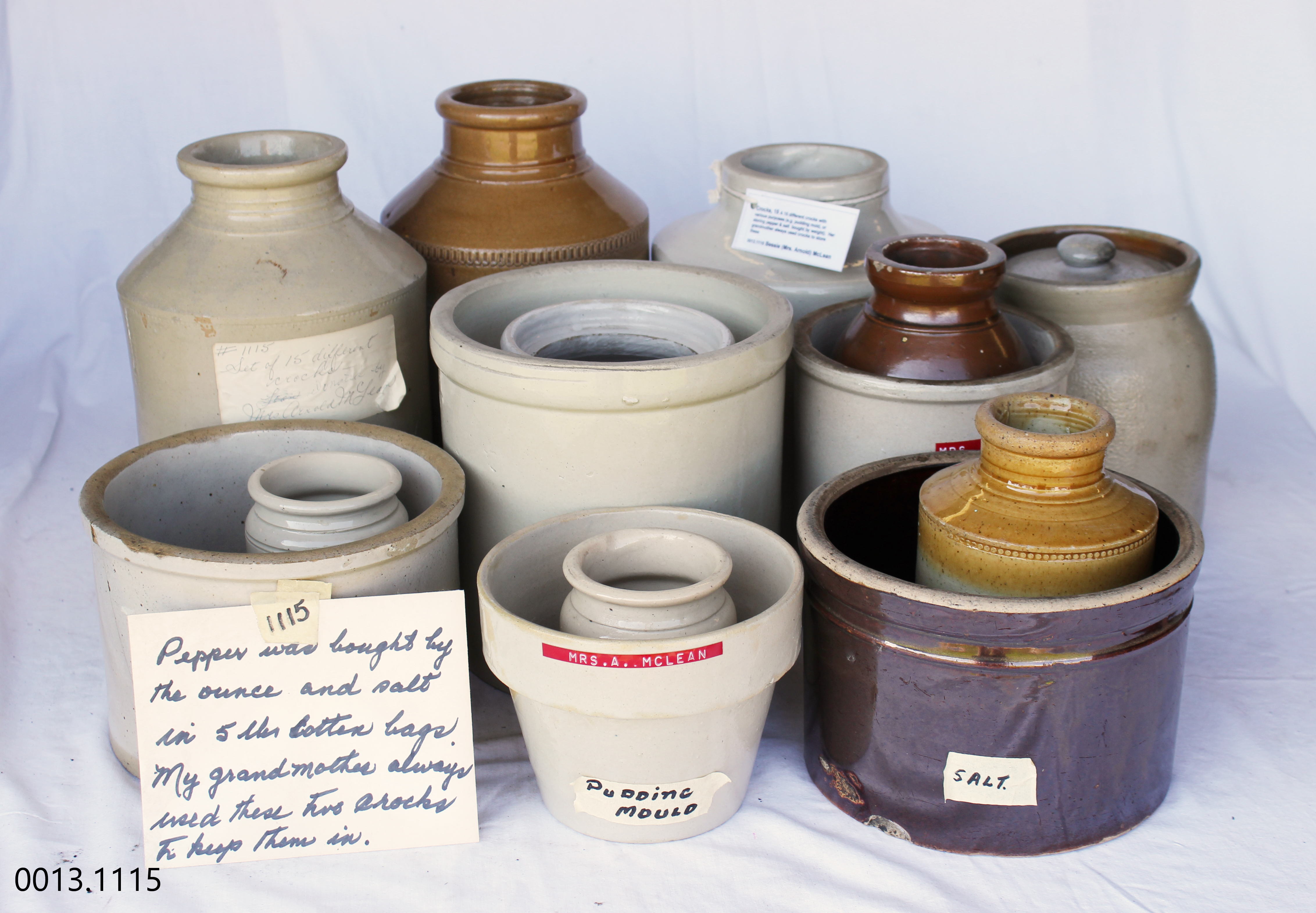 Object Desc A set of 15 different crocks with various purposes(e.g. pudding mold, salt & pepper containers, etc). Pepper was bought by the ounce and salt in 5 lb cotton bags. Her grandmother always used crocks to store them.