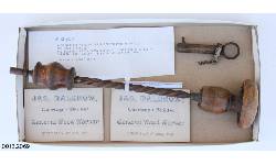 Object Desc To drill/screw, 2 cork removers, 2 business cards ("Jas Baldrow, Carriage Maker, General Wood Worker, Strathclair Station, MB").