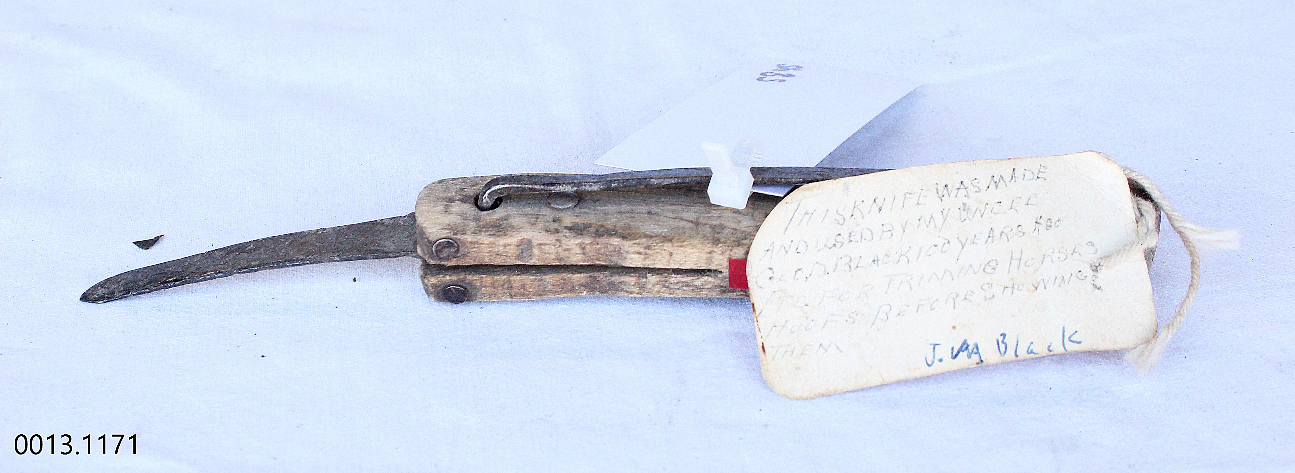 Object Desc "Made and used by my uncle GADD? Black 100 years ago. It's for trimming horse hooves before showing." - J.M. Black