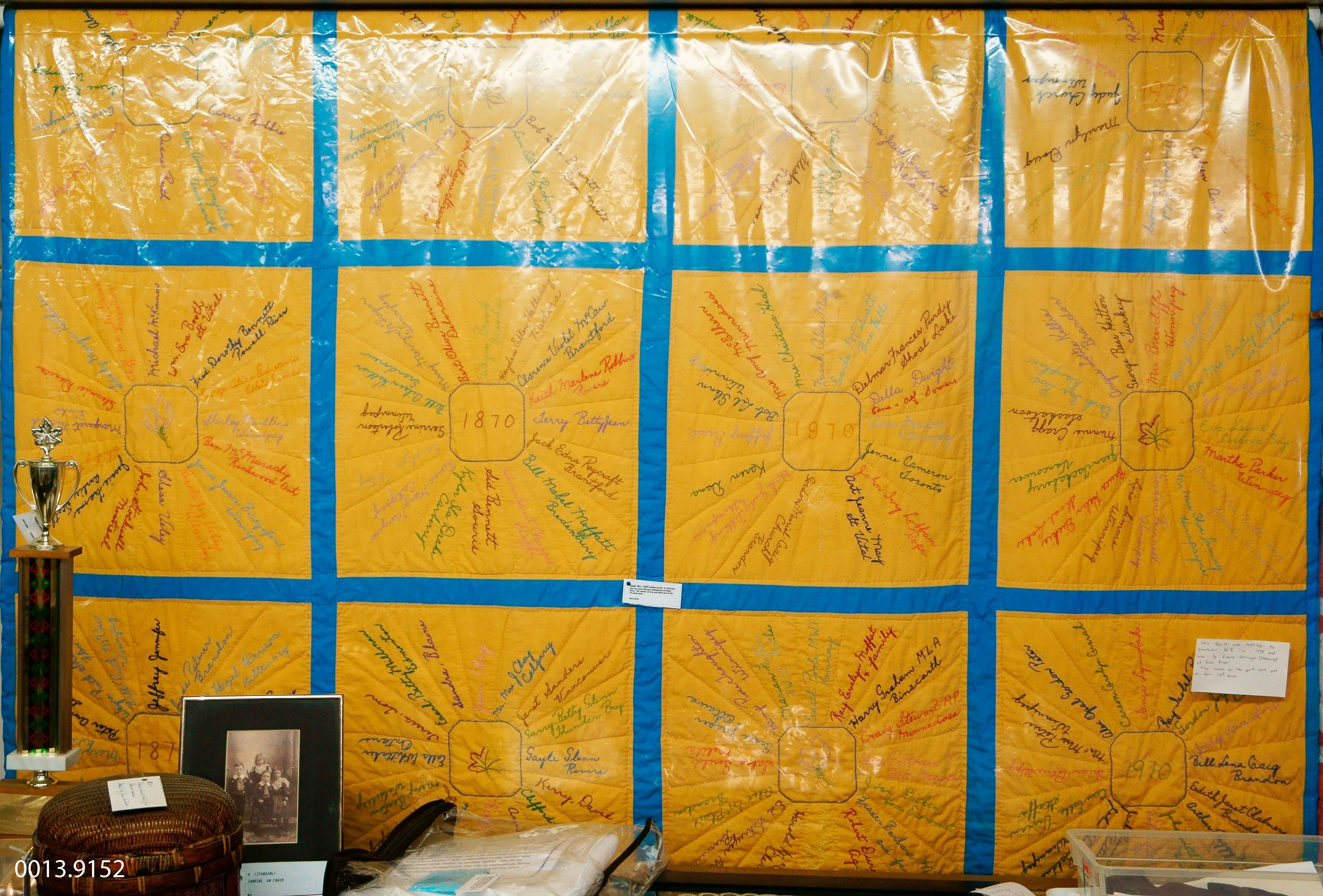 Object Desc Raffled by W.I. in 1970 and won by Laura Stringer (Westaway) of Swan River. The names on the quilt were put on for 10 cents each.