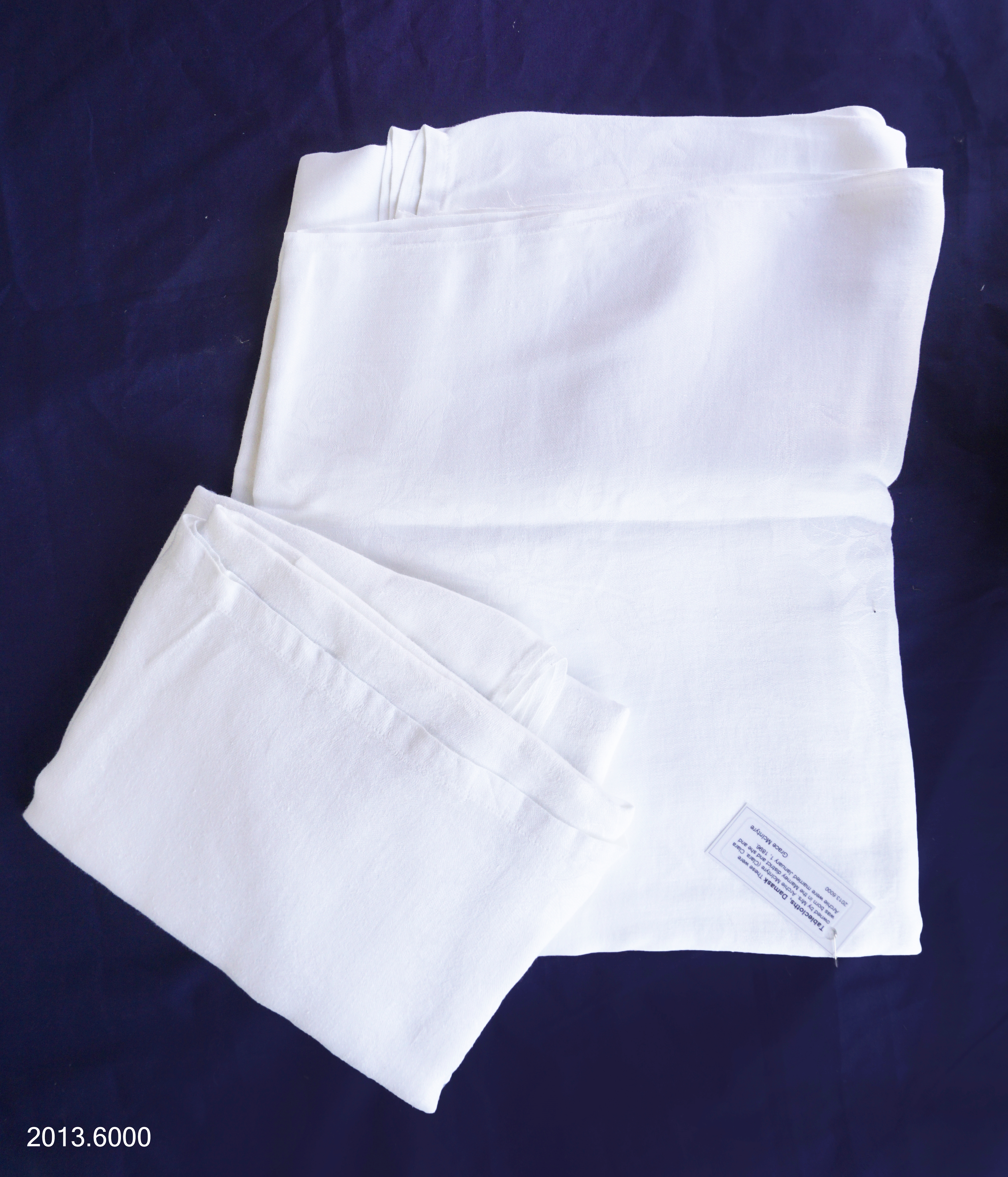 Notes Until polyester became popular most households had at least one white linen or damask tablecloths that were only used when there was company. They were very troublesome and time consuming to wash and iron. These were owned by Mrs. Archie McIntyre (Clara) who insisted on using one every day at supper time. It should be mentioned that she ususlly had hired help to do the heavy work in the house. Clara was born in the Marney district and she and Archie were married January 1, 1896. We don't know how old these tablecloths are but Clara passed away in 1941 and Archie on Dec. 7, 1950. The descriptor Damask refers to weaving technique whereby a pattern was embedded in the weave and sometimes only visable in certain lights. The term Damask was derived from the city of Damascas, Syria where the technique was first invented in the 12th century.