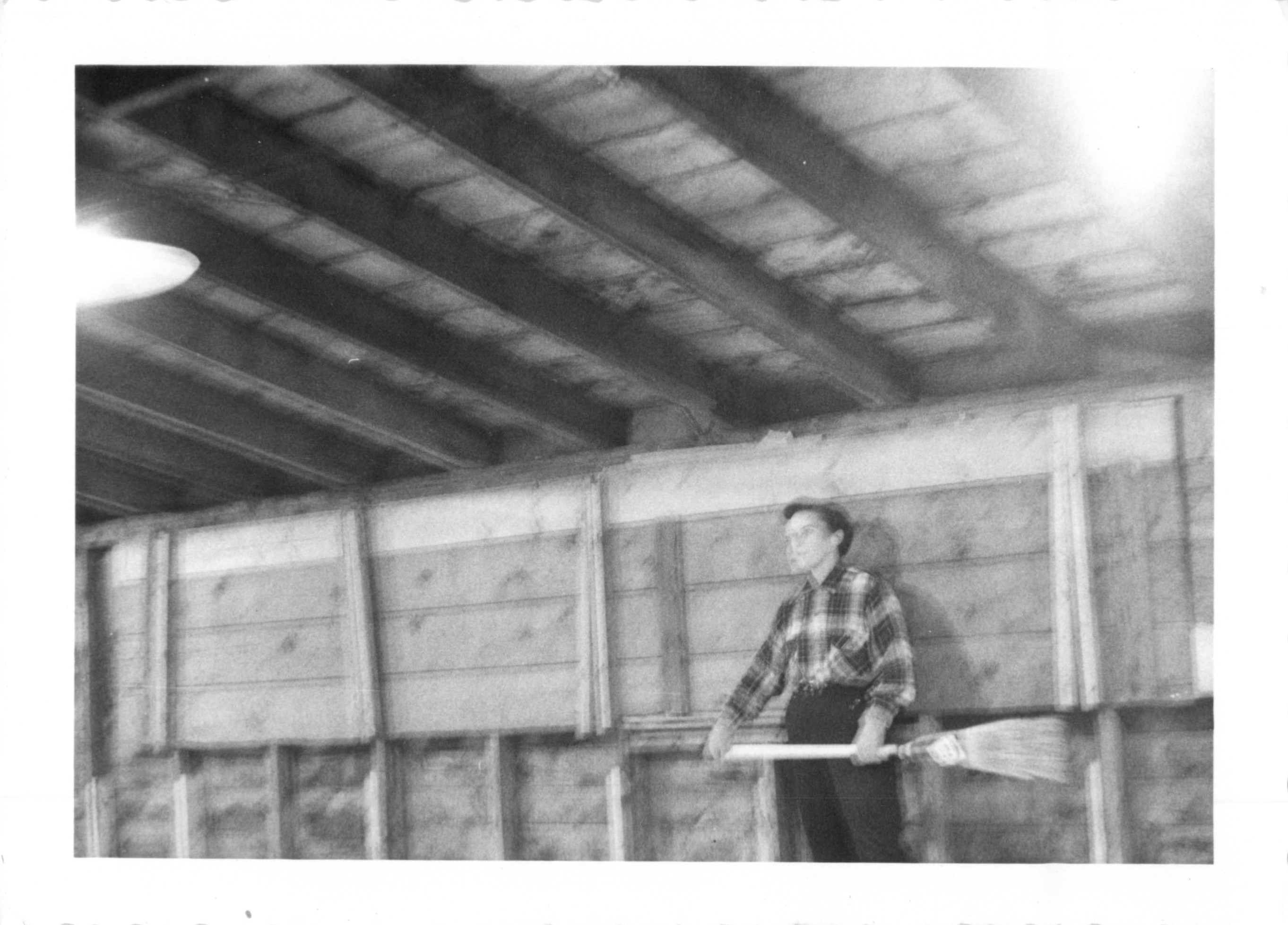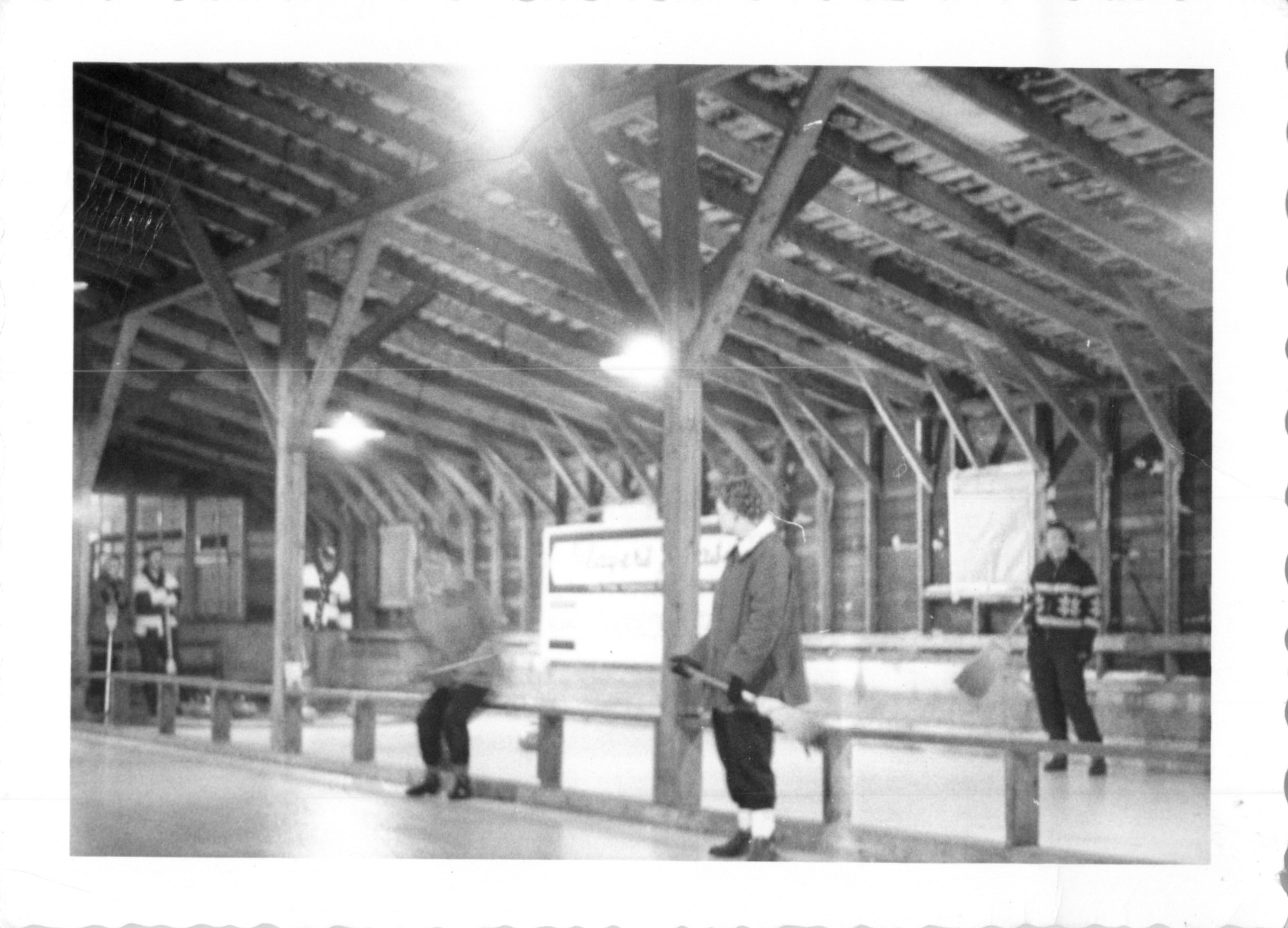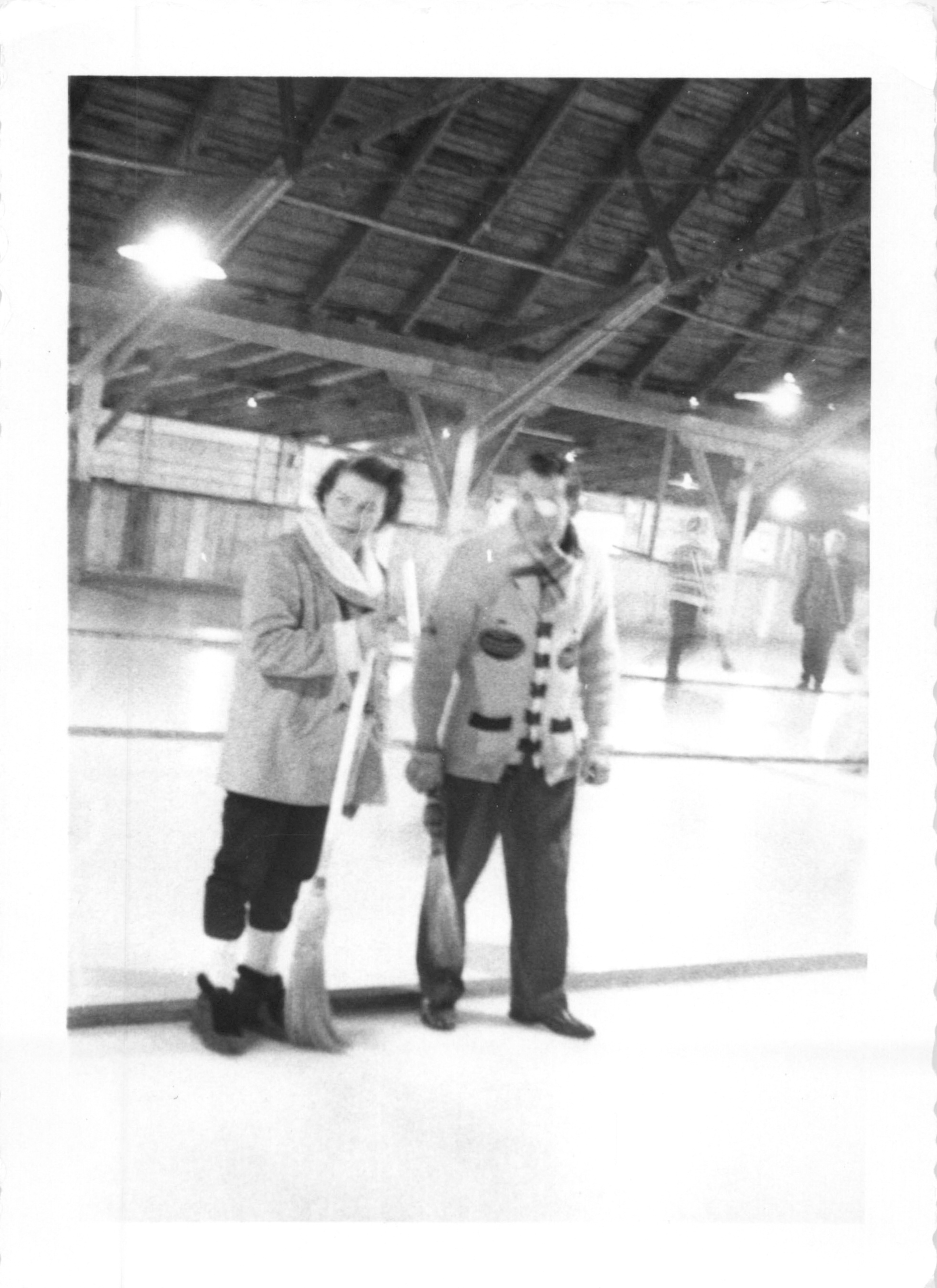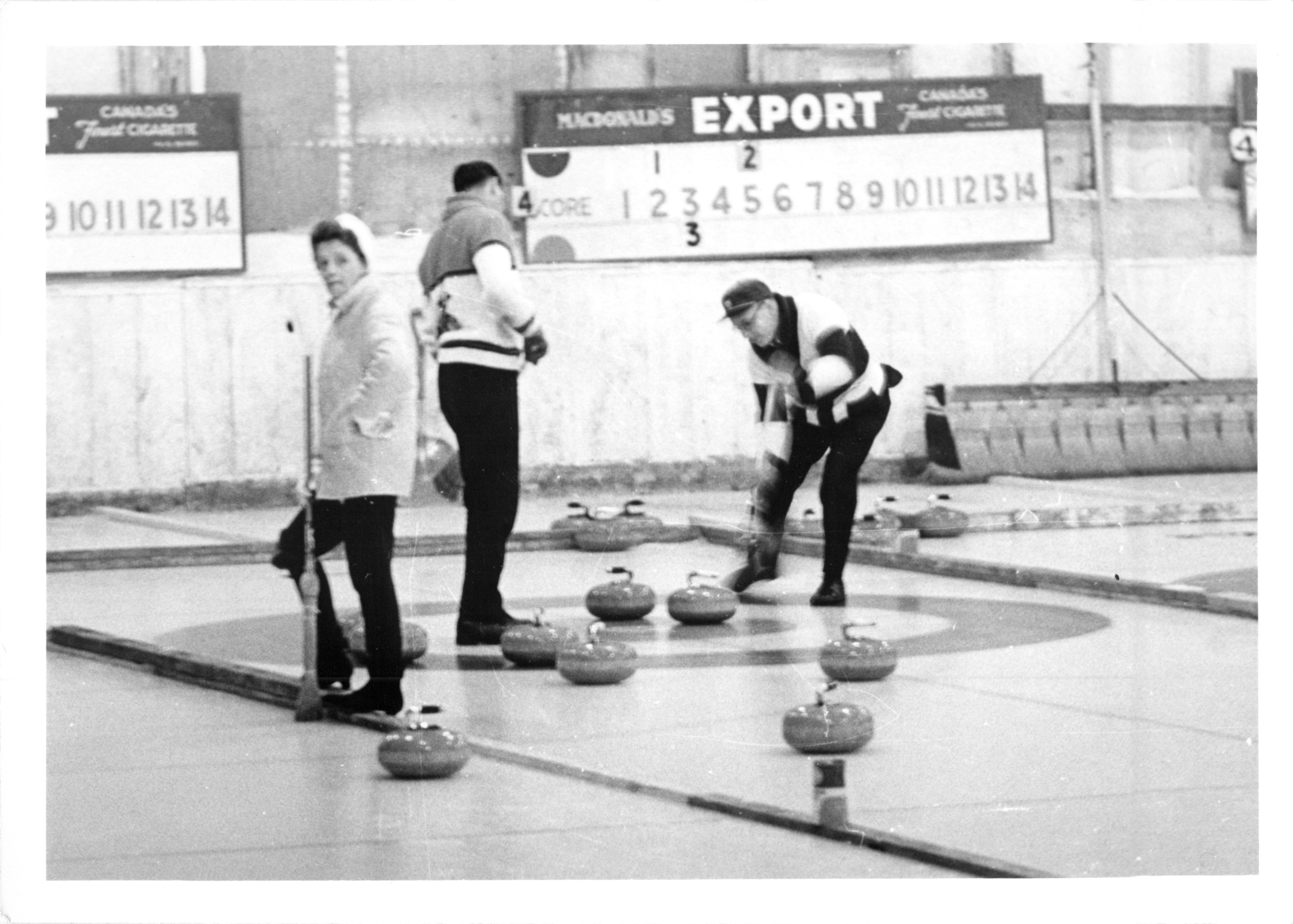 Description Strathclair Bonspiel 1959 Gordon Sinclair holding the broom, Muriel Mackie on the left