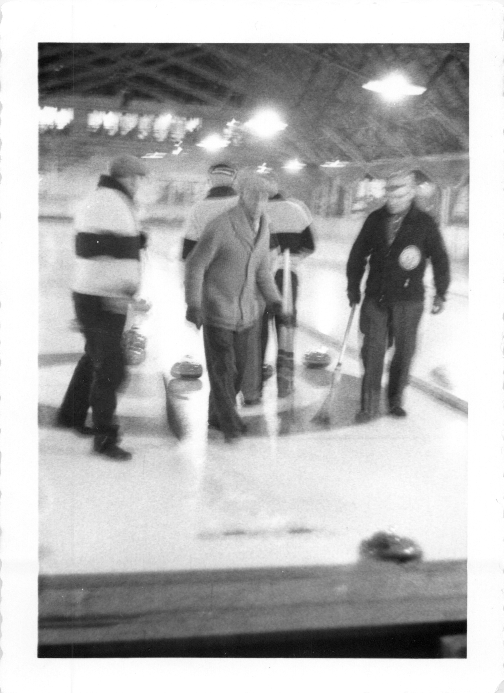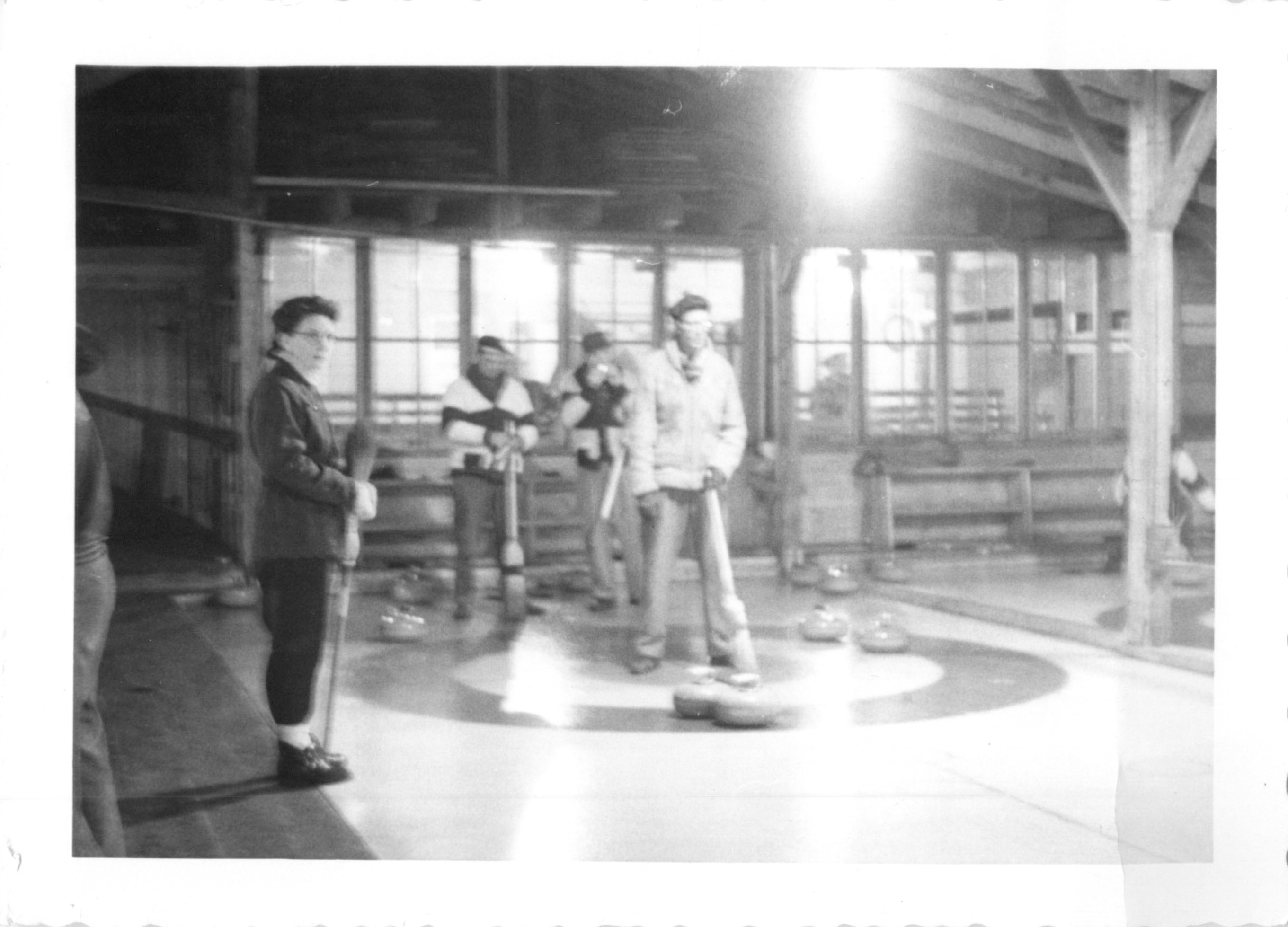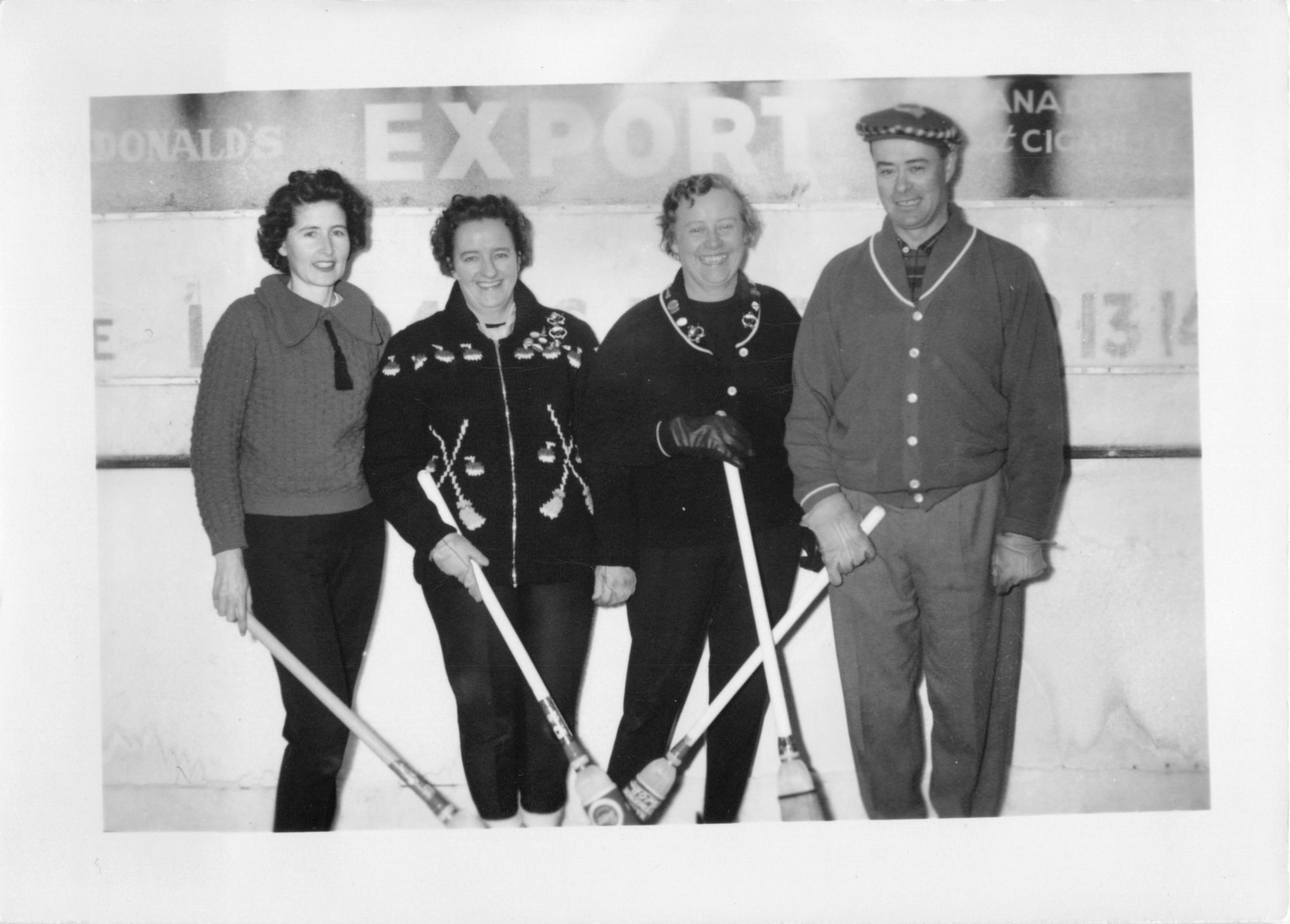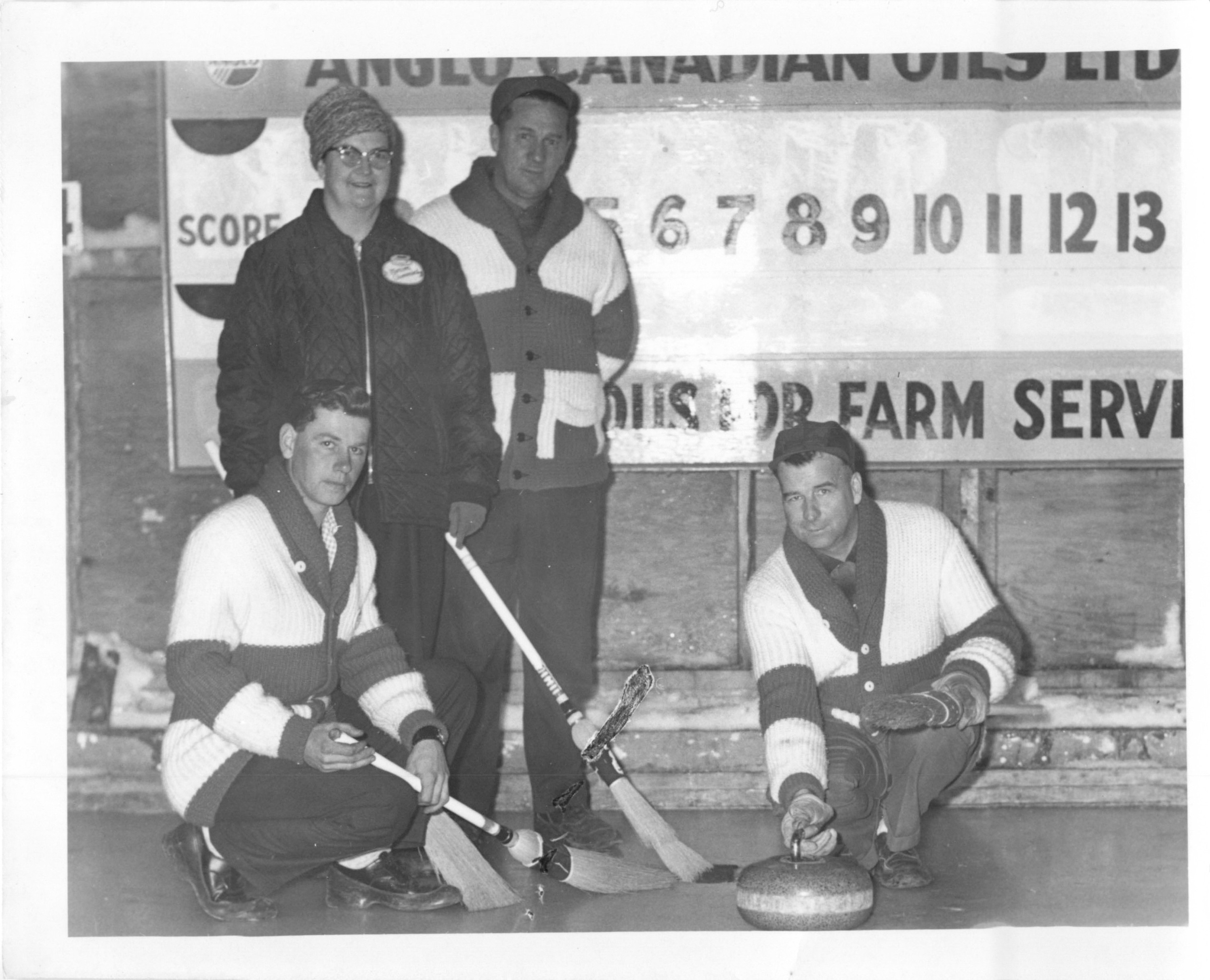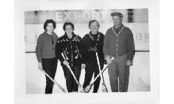 Description Strathclair Bonspiel 1959 Wilf Lee, Jean Jack, Horace Gill, Margaret Church in the foreground.