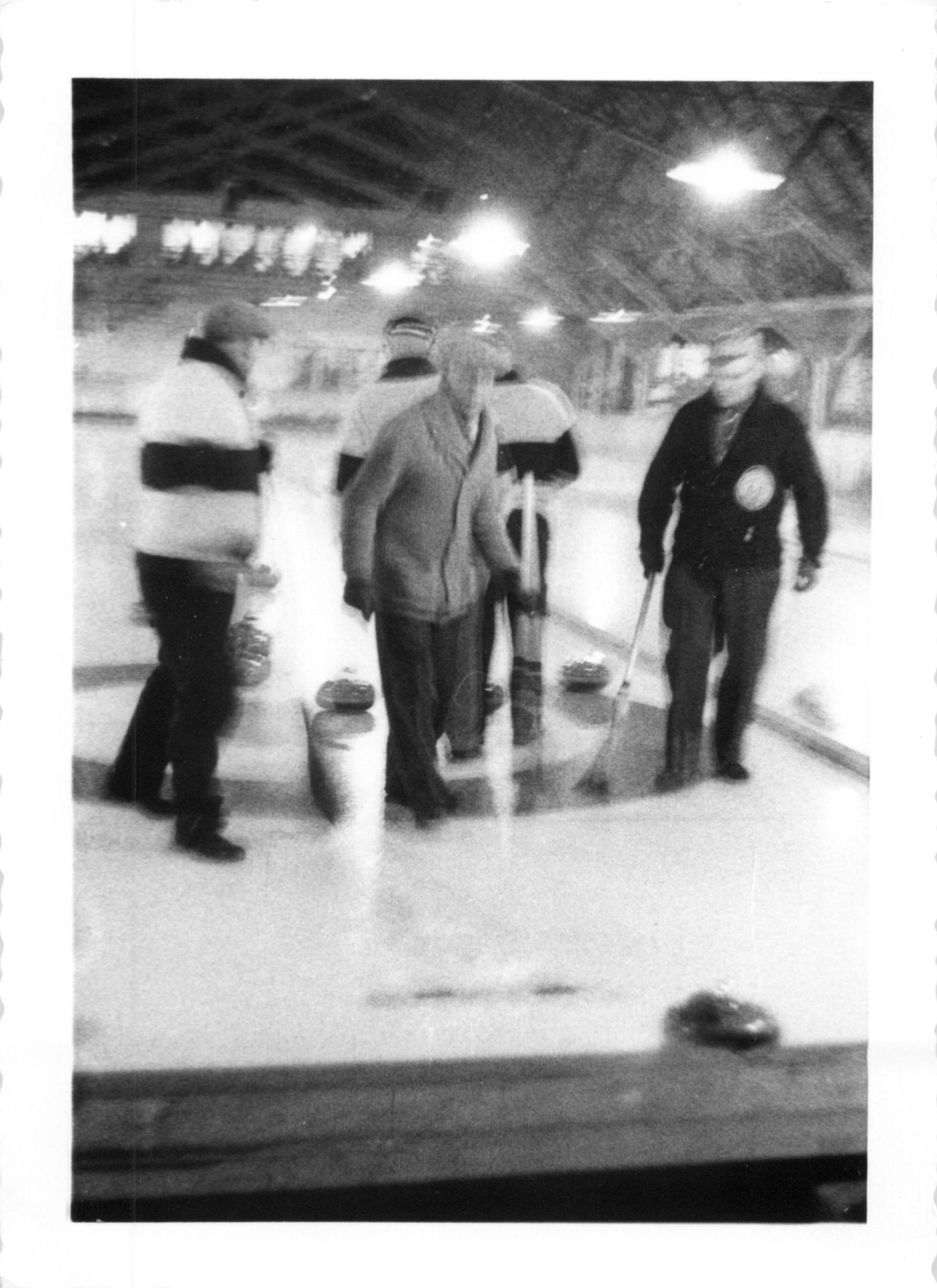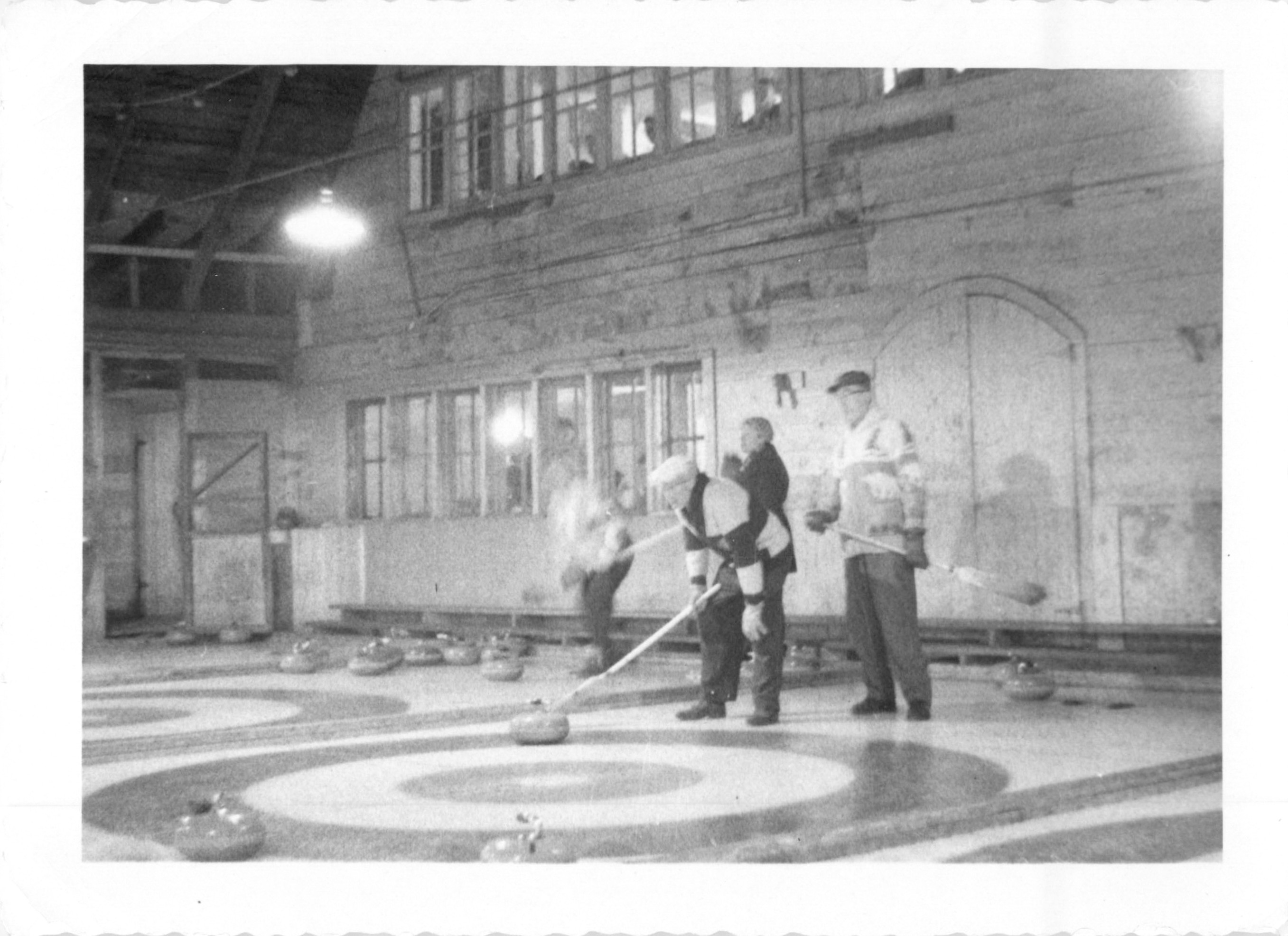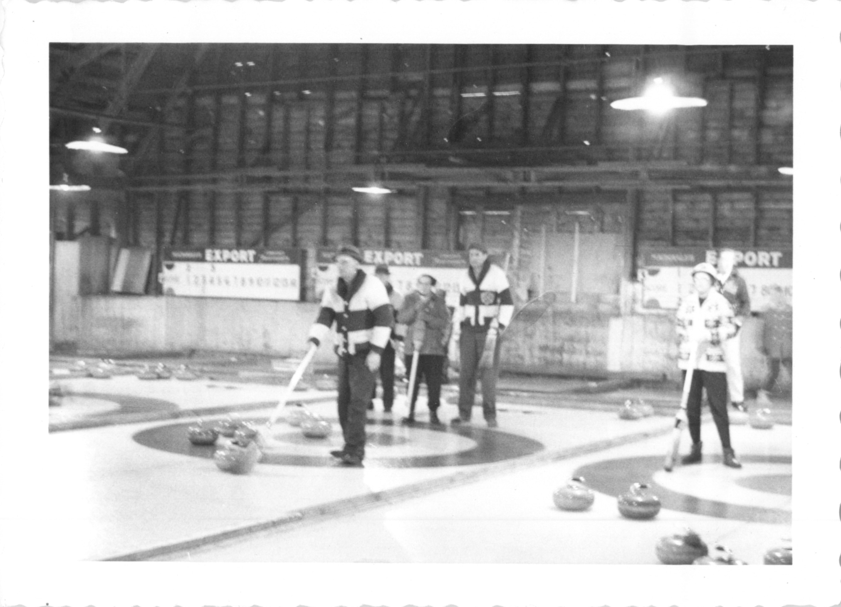 Description Strathclair Bonspiel 1959 Wilf Lee, Jean Jack, Horace Gill, Margaret Church in the foreground.