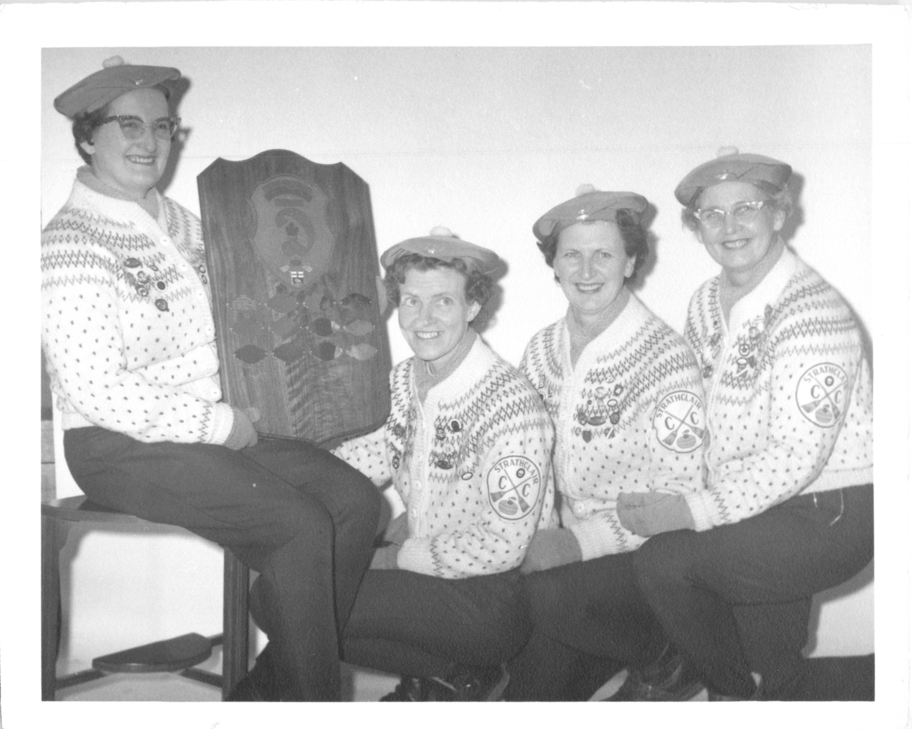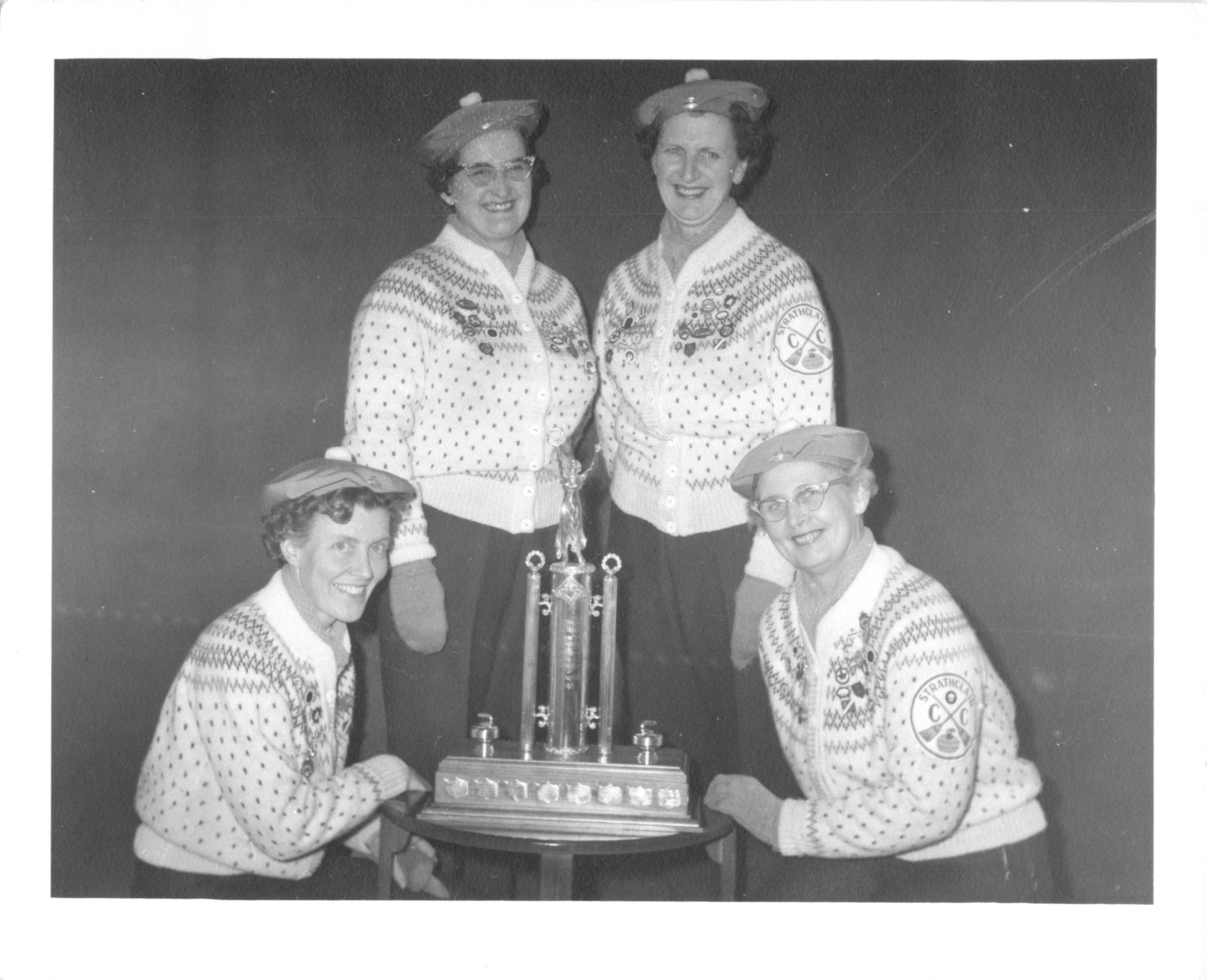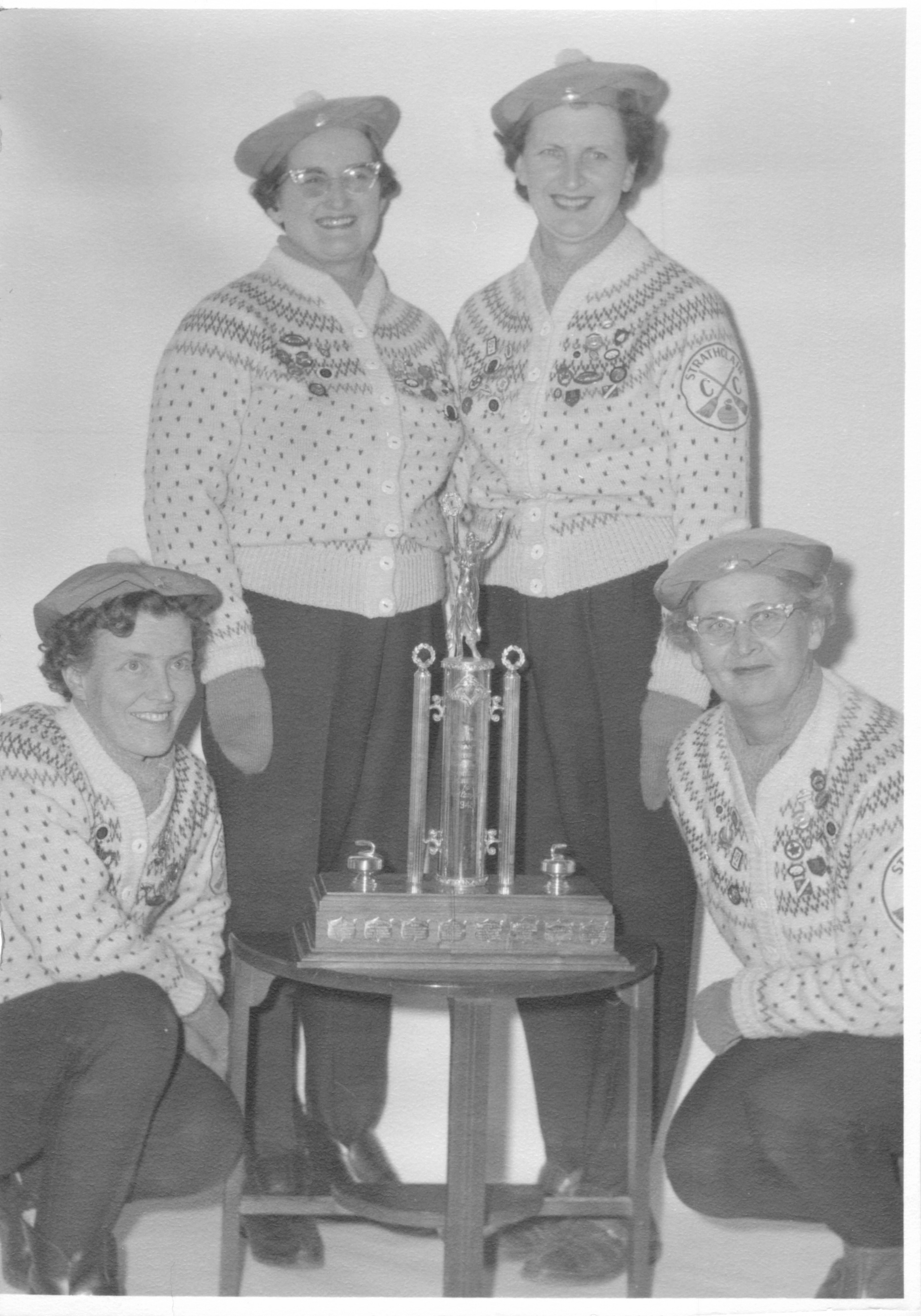 Description Strathclair Bonspiel 1959 Back Row L-R: Shirley Winstone, Lola Grills Front Row: L-R Irene Parker, Olive Gamey. Strathclair won the Dominion Final and went to Ottawa to play for the Diamond D Trophy in 1961