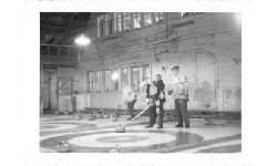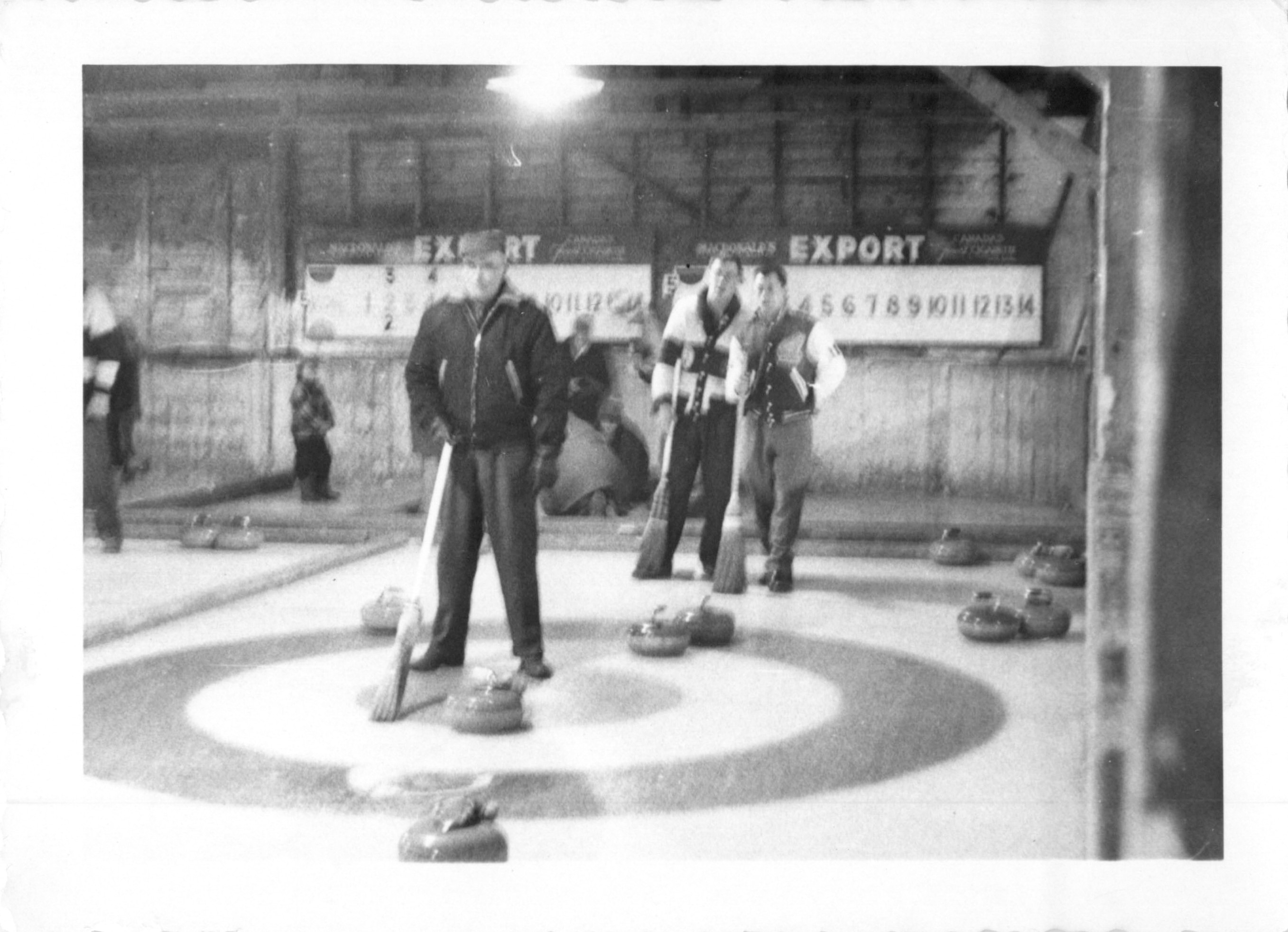 Description Strathclair Bonspiel 1959 Joe Gerrard holding broom, unknown, Bruce Rapley on the right