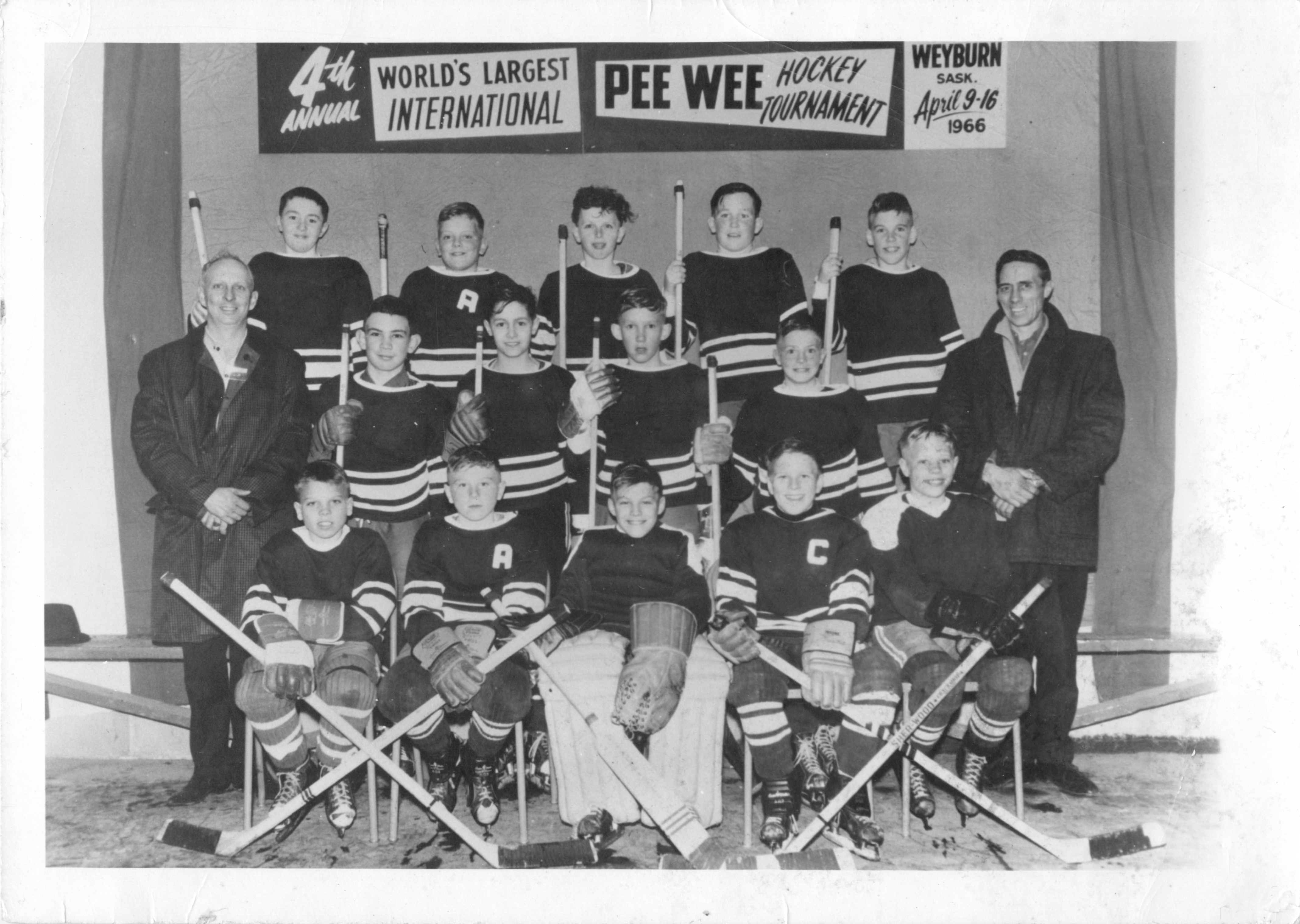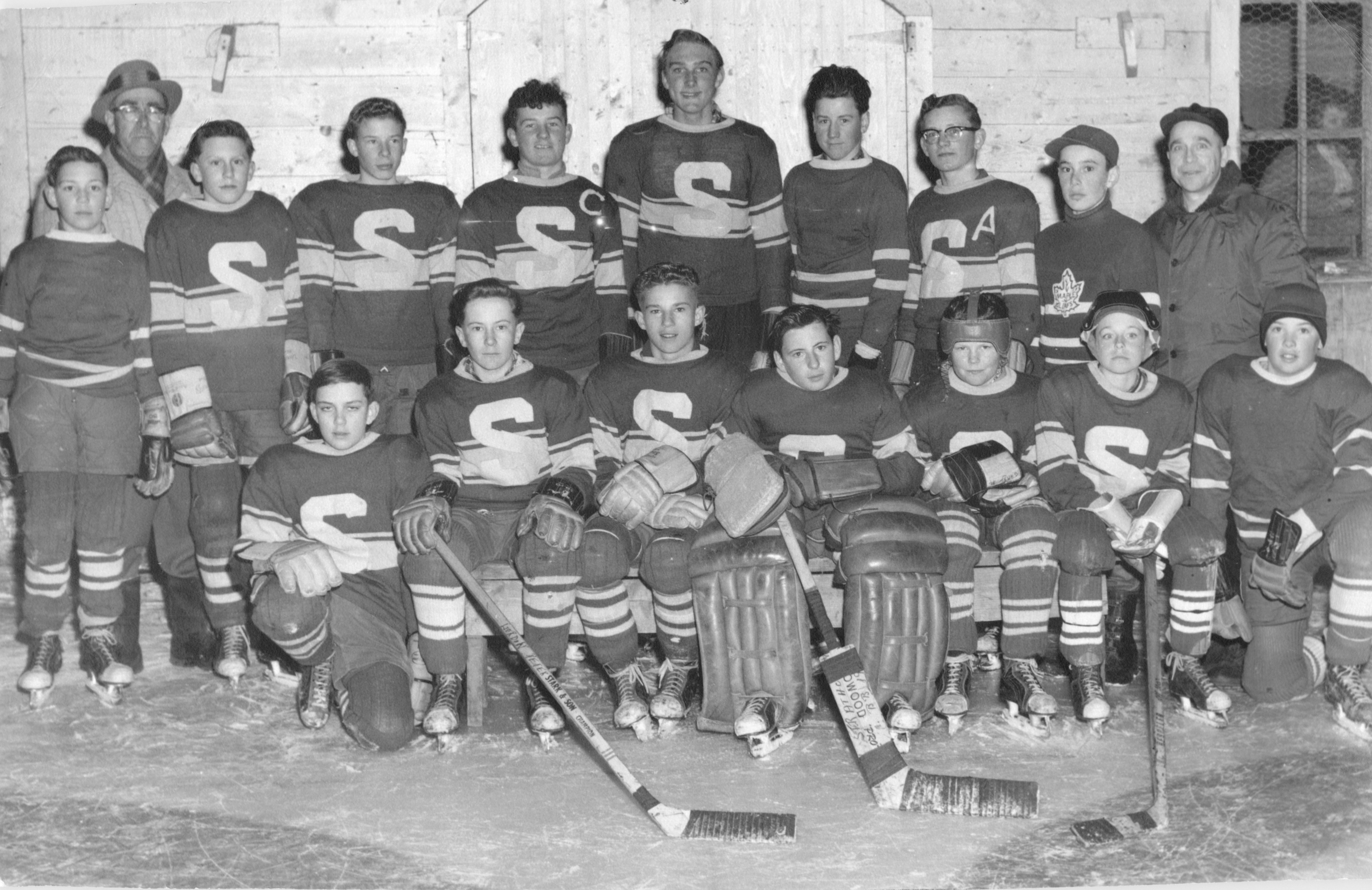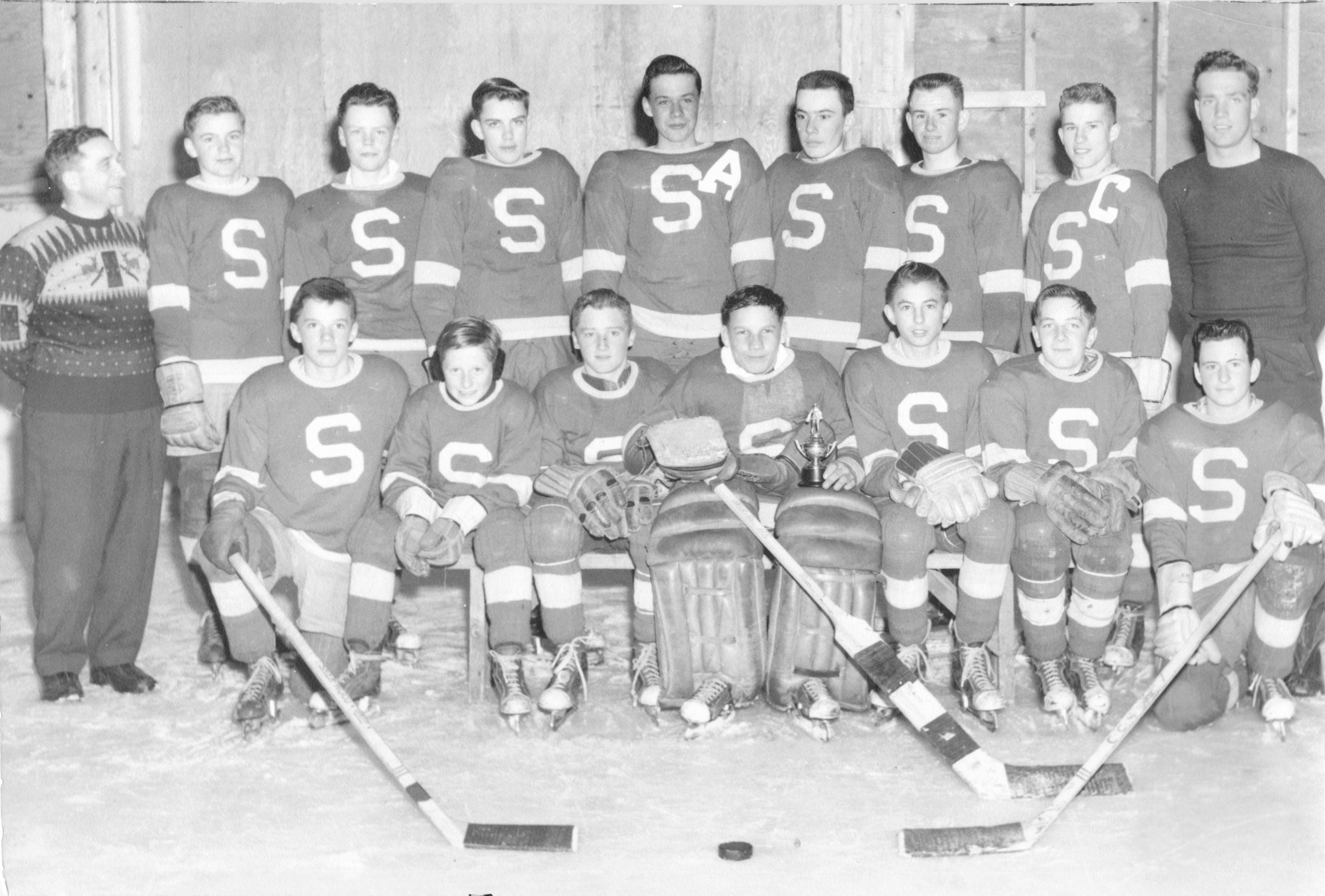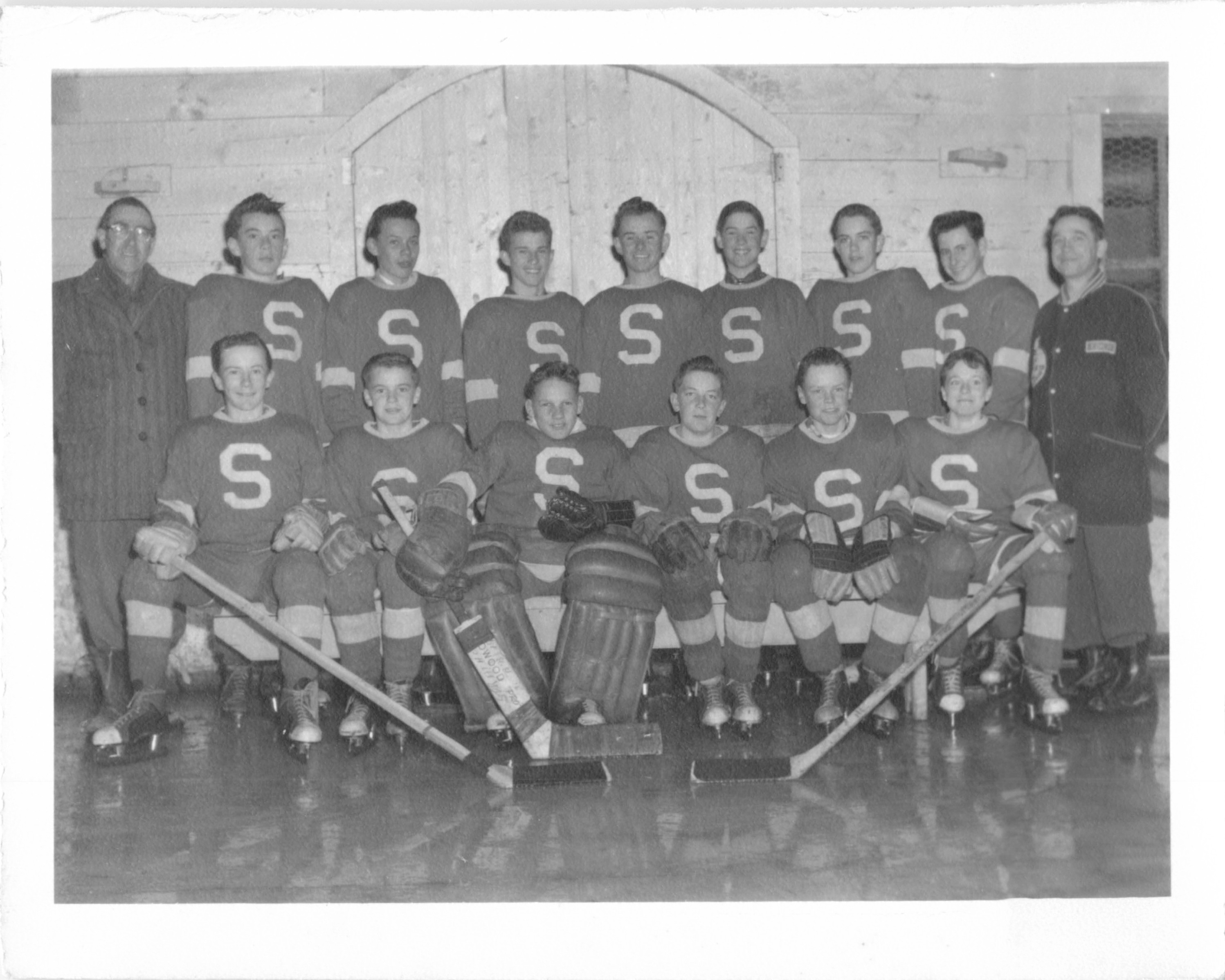 Description Back Row L-R: Jack Endecott, Harry Morcom (coach), Reid Warwick, Eddie Waddell, Jim Glenn, Dennis Leigh, Jack Biccum, Maurice Sydor, Wayne Rapley, Louis Molgat (coach) Front Row: L-R: Doug Morcom, Gord Peters, Gerald Warwick, Bruce Rapley, Garry Martin