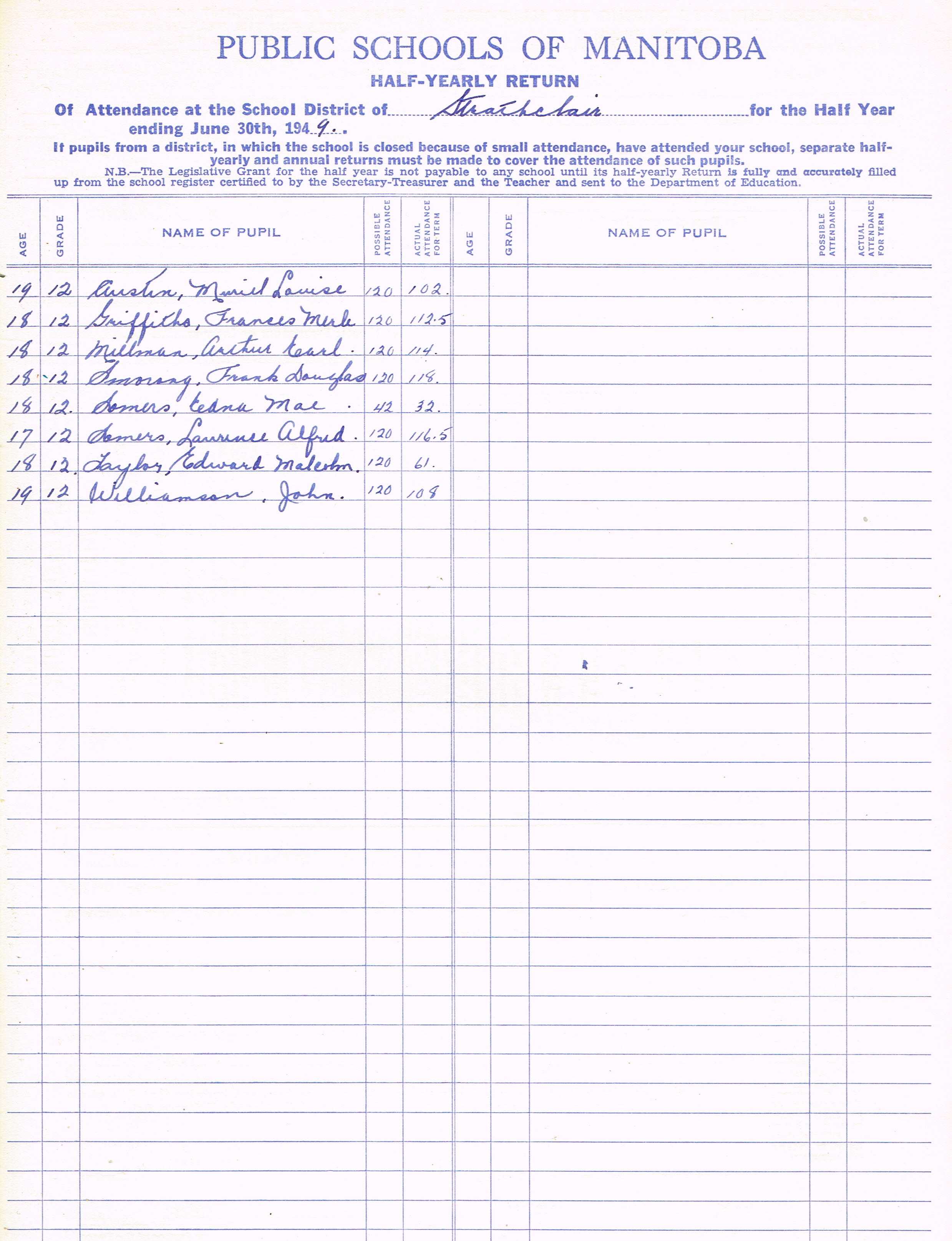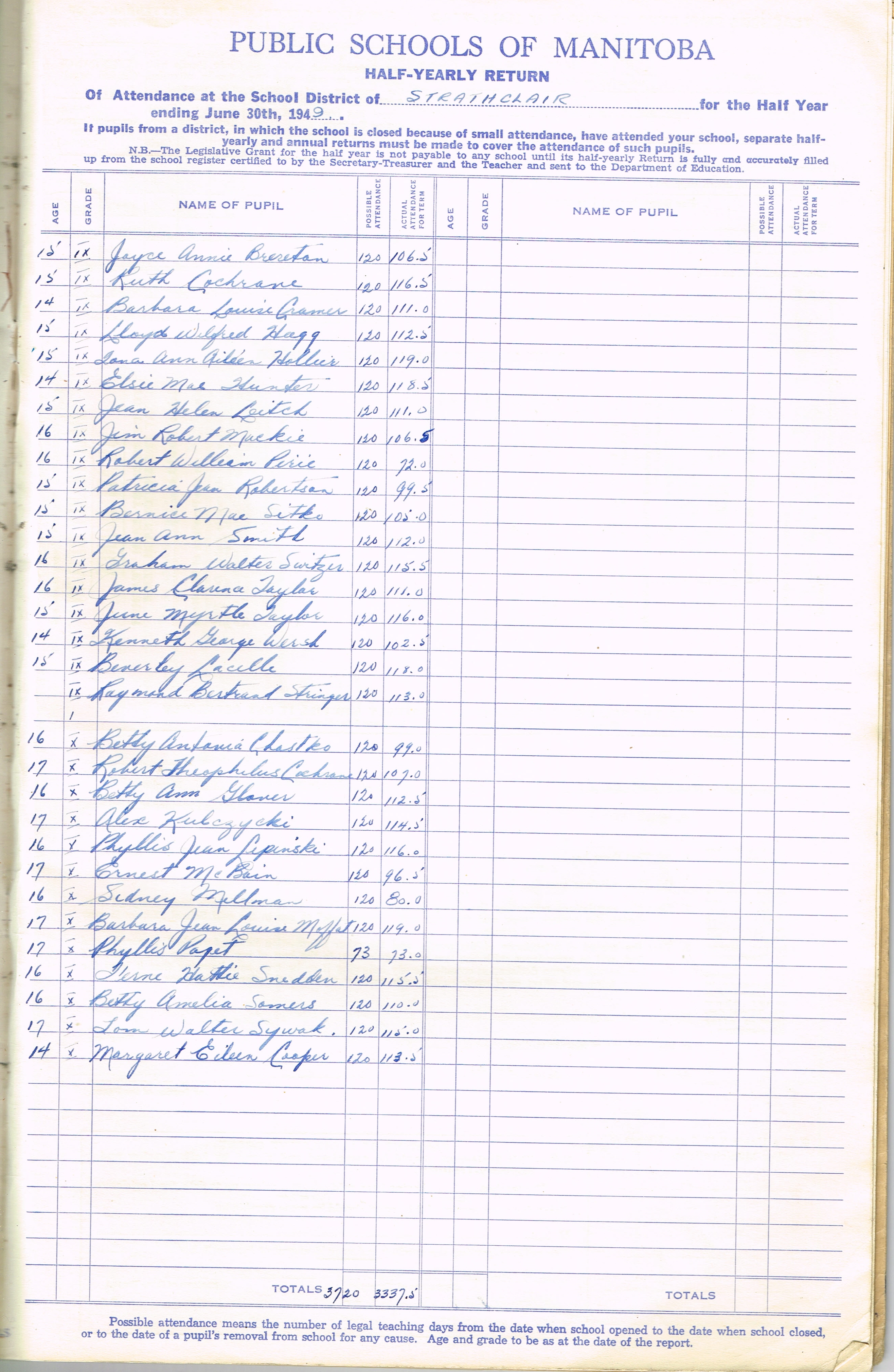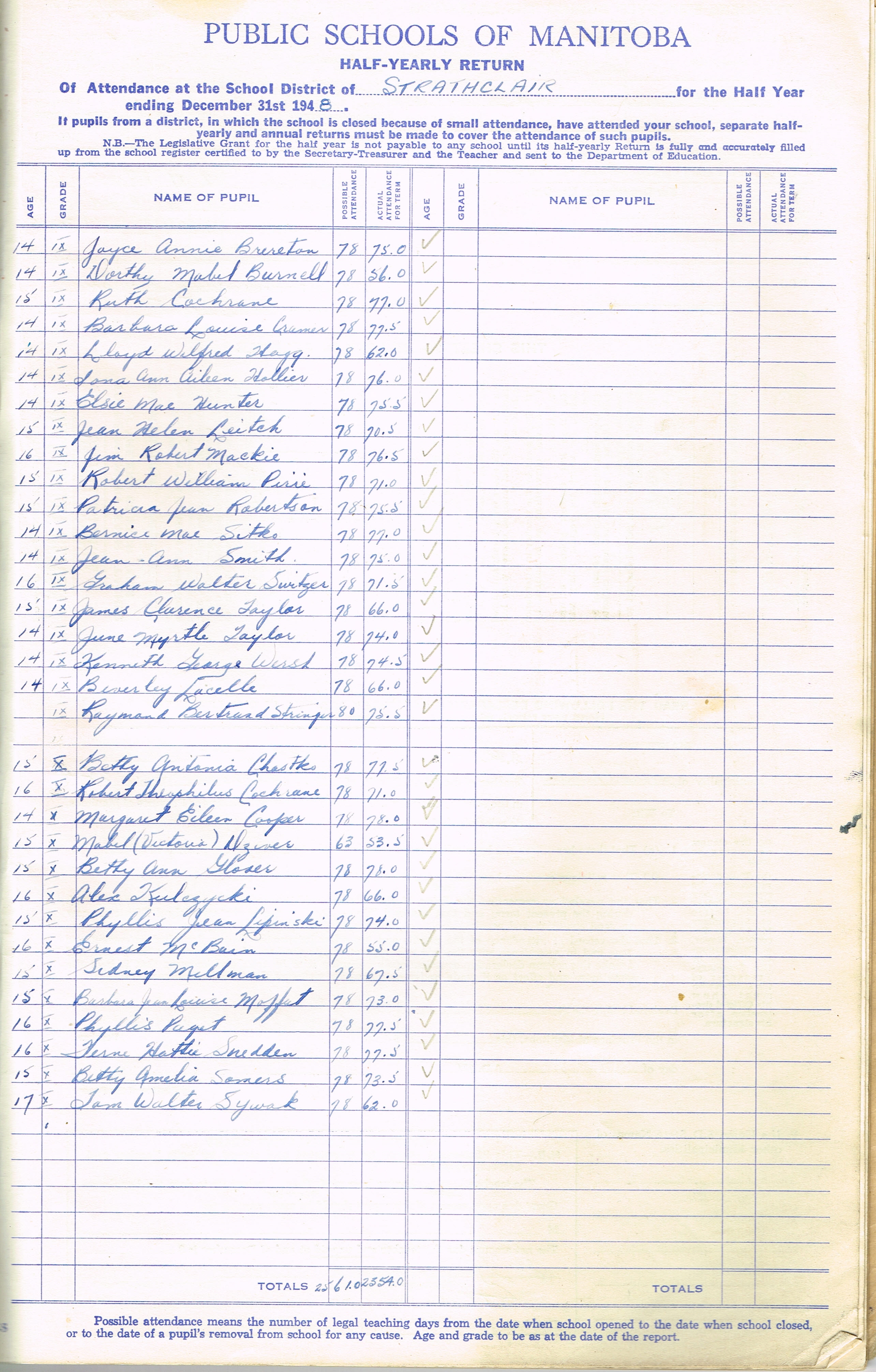 Description Teacher – E. G. Morris; Joyce Annie Brereton (G9); Dorothy Mabel Burnell (G9); Ruth Cochrane (G9); Barbara Louise Cramer (G9); Lloyd Wilfred Hogg (G9); Iona Ann Aileen Hollier (G9); Elsie Mae Hunter (G9); Jean Helen Leitch (G9); Jim Robert Mackie (G9); Robert William Pirie (G9); Patricia Jean Robertson (G9); Bernice Mae Sitko (G9); Jean Ann Smith (G9); Graham Walter Switzer (G9); Jeames Clarence Taylor (G9); June Myrtle Taylor (G9); Kenneth George Wersh (G9); Beverley Lacelle (G9); Raymond Bertrand Stringer (G9) Betty Antonia Chastko (G10); Robert Theophilus Cochrane (G10); Margaret Eileen Cooper (G10); Mabel Victoria Dziver (G10);Betty Ann Glover (G10); Alex Kulczycki (G10); Phyllis Jean Lipinski (G10);Ernest McBain (G10); Sidney Millman (G10); Barbara Jean Louise Moffat (G10); Phyllis Paget (G10); Ferne Hattie Snedden (G10); Betty Amelia Somers (G10); Tom Walter Sywak (G10)