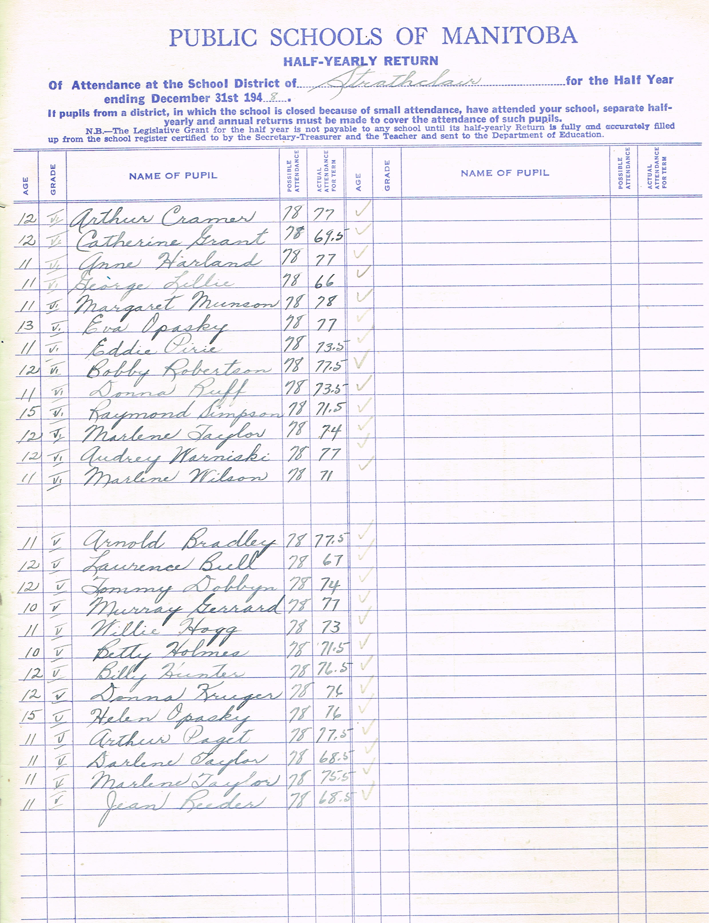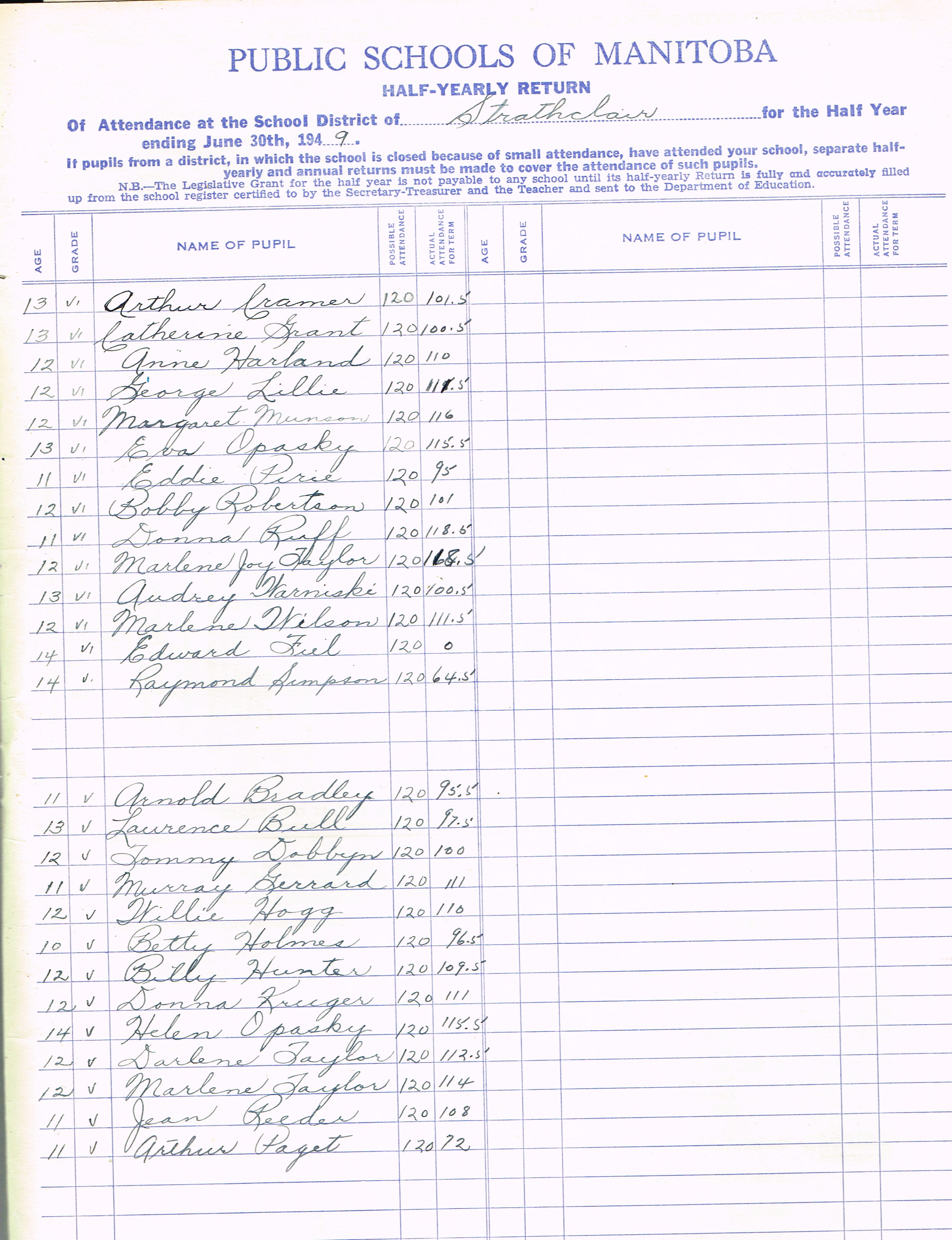 Description Teacher – Jean L. Fulford; Archur Cramer(G6); Catherine, Grant (G6); Anne Harland (G6); Ge orge, Lillie (G6); Margaret Munson (G6); Eva Opasky (G6); Eddie Pirie (G6); Bobby Robertson (G6);Donna Ruff (G6); Raymond Simpson (G6); Marlene Taylor (G6); Audrey Warniski (G6); Marlene Wilson (G6) Arnold Bradley (G5); Lawrence Bull (G5); Tommy Dobbyn (G5); Murray Gerrard (G5); Willie Hogg (G5); Betty Holmes (G5); Billie Hunter (G5); Donna Kruger (G5); Helen Opasky (G5); Arthur Paget (G5); Darlene Taylor (G5); Marlene Taylor (G5); Jean Reeder (G5)