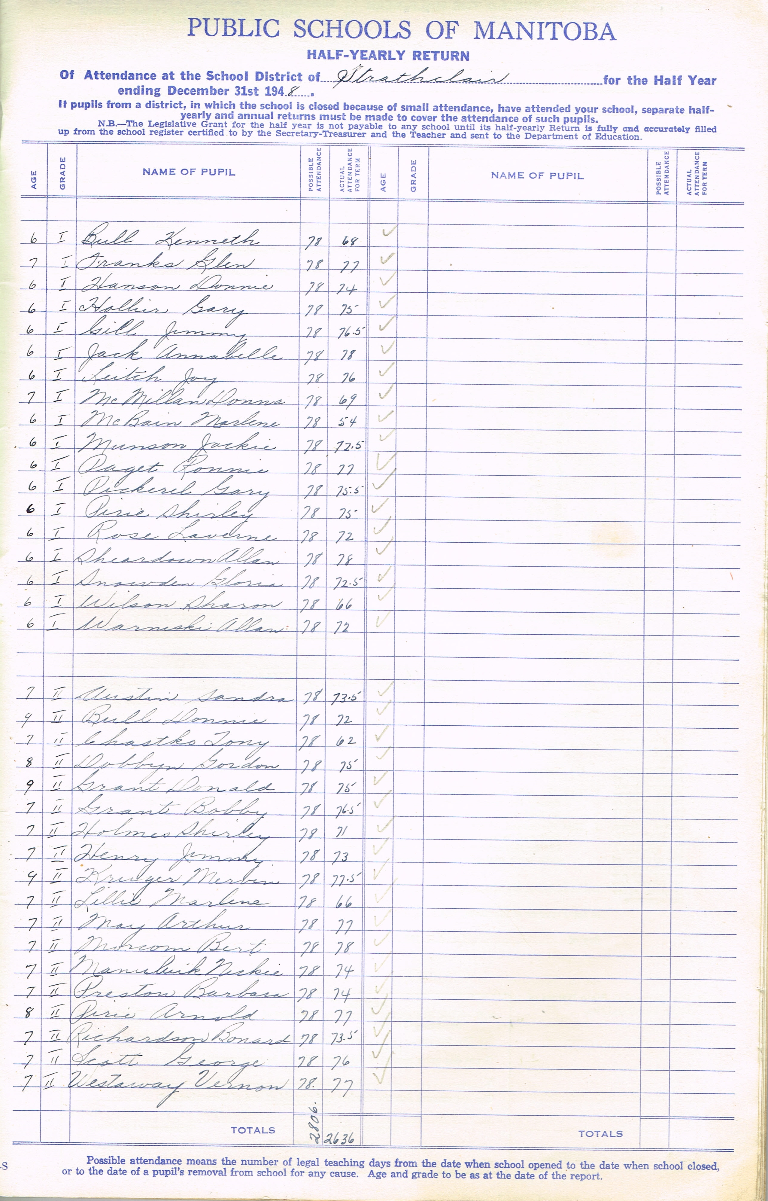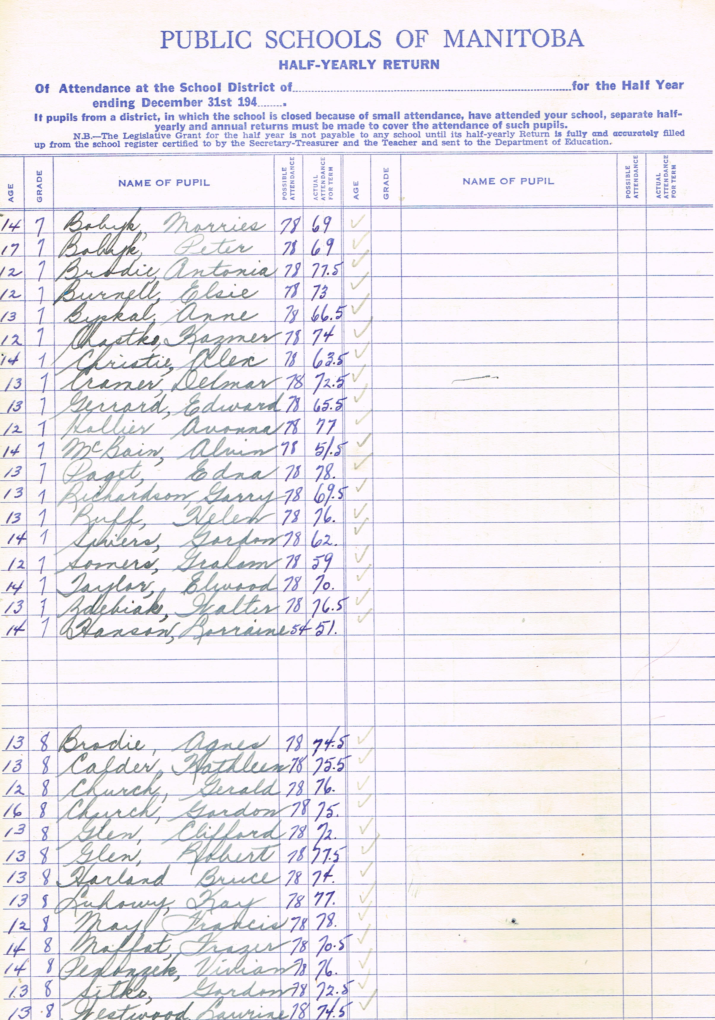 Description Teacher – M. Hacking; Bobyk, Morries (G7); Bobyk, Peter (G7); Brodie, Antonia (G7); Burnell, Elsie (G7);Byskal, Anne (G7); Chastko, Kazmer (G7); Christie, Alex (G7); Cramer, Delmar (G7); Gerrard, Edward (G7); Hollier, Avonna (G7); McBain, Alvin (G7); Richardson, Garry (G7); Ruff, Helen (G7); Sivers, Gordon (G7); Somers, Graham (G7); Tayor, Elwood (G7); Zdebiak, Walter (G7); Hanson, Lorraine (G7) Brodie, Agnes (G8); Calder, Kathleen (G8); Church, Gerald (G8); Church, Gordon (G8); Glen, Clifford (G8);Glen, Robert (G8); Harland, Bruce (G8); Luhowy, Kay(G8); May, Francis (G8); Moffat, Frazer (G8), Penonzek, Vivian (G8); Sitko, Gordon (G8); Westwood, Laurine (G8); Zdebiak, Jean (G8)