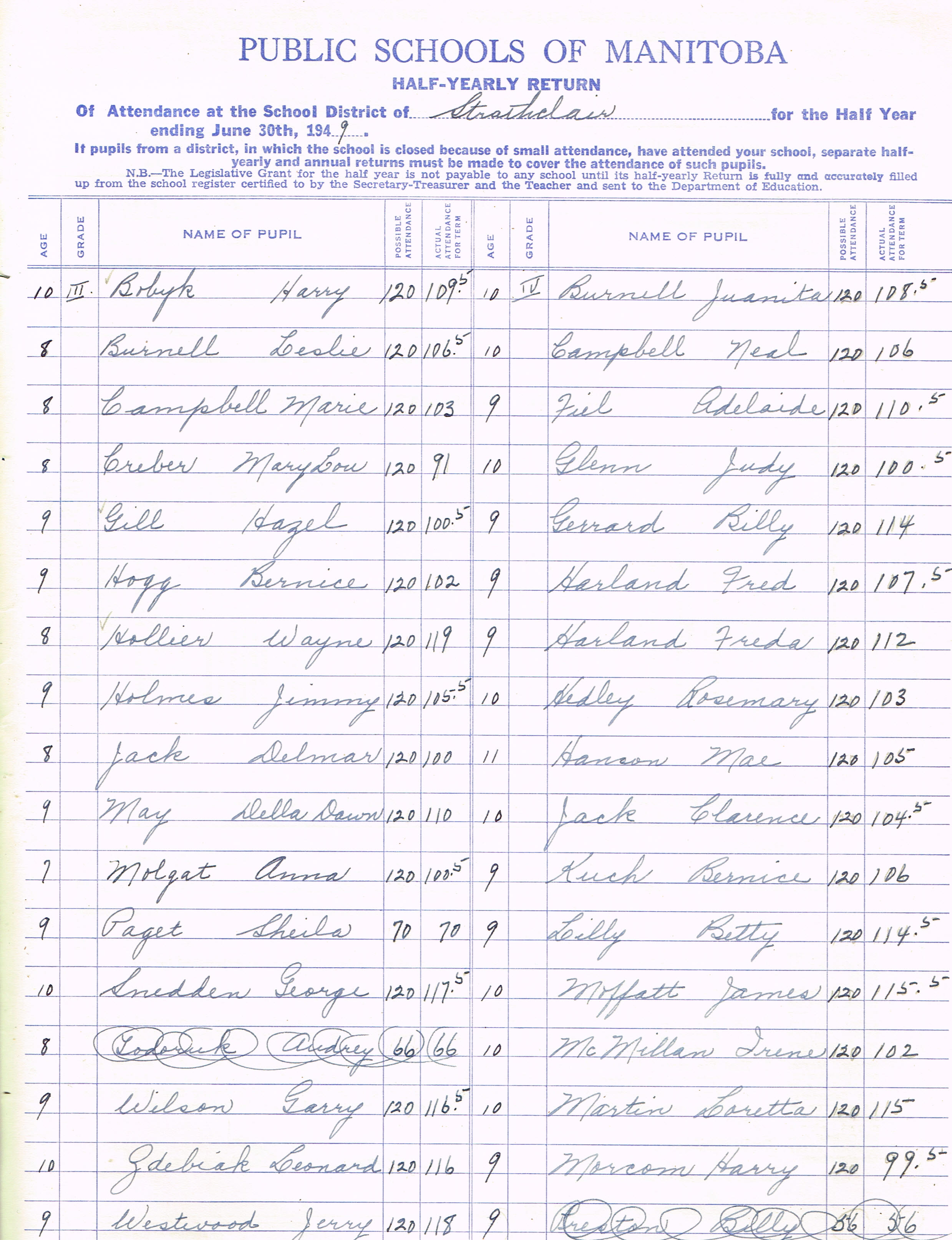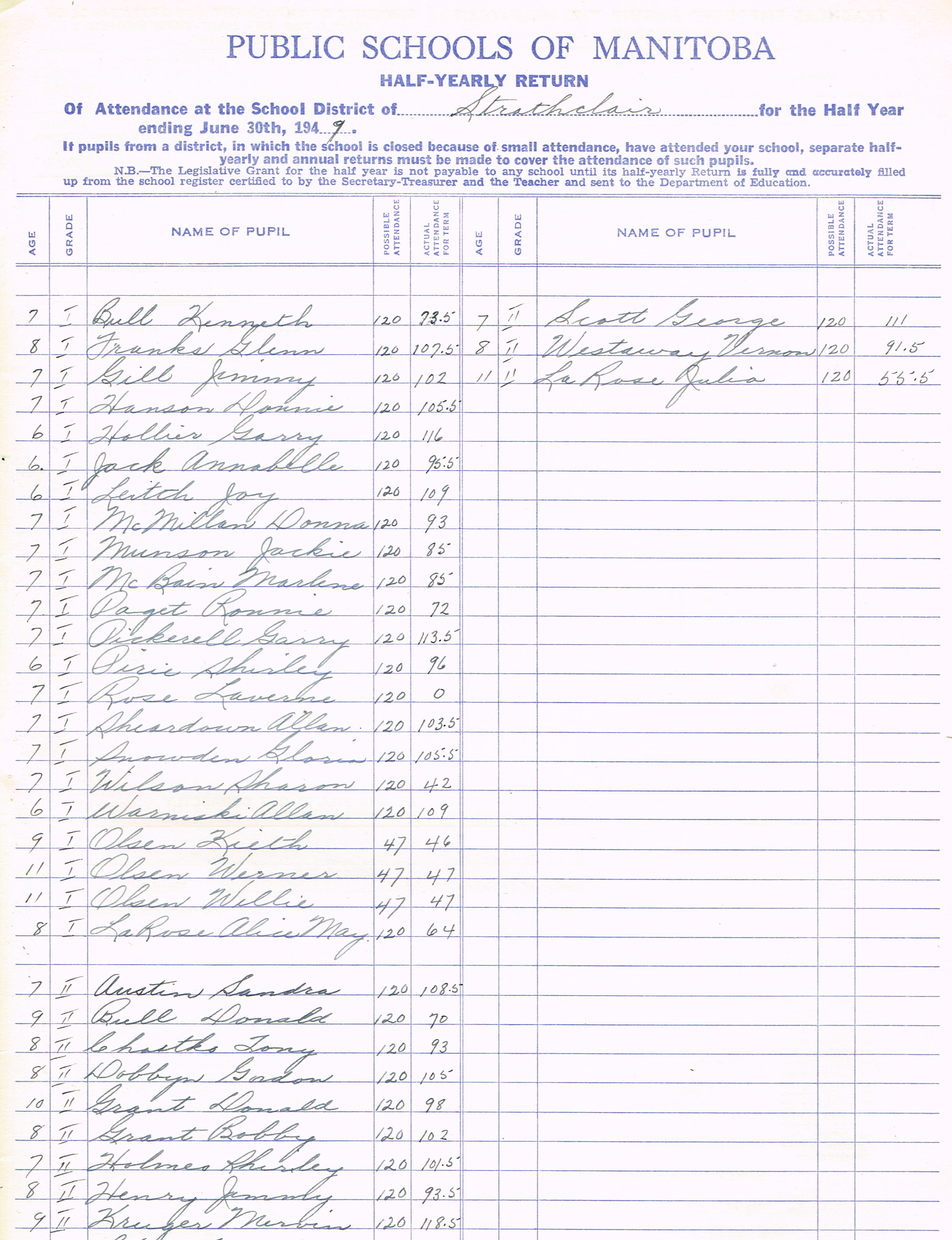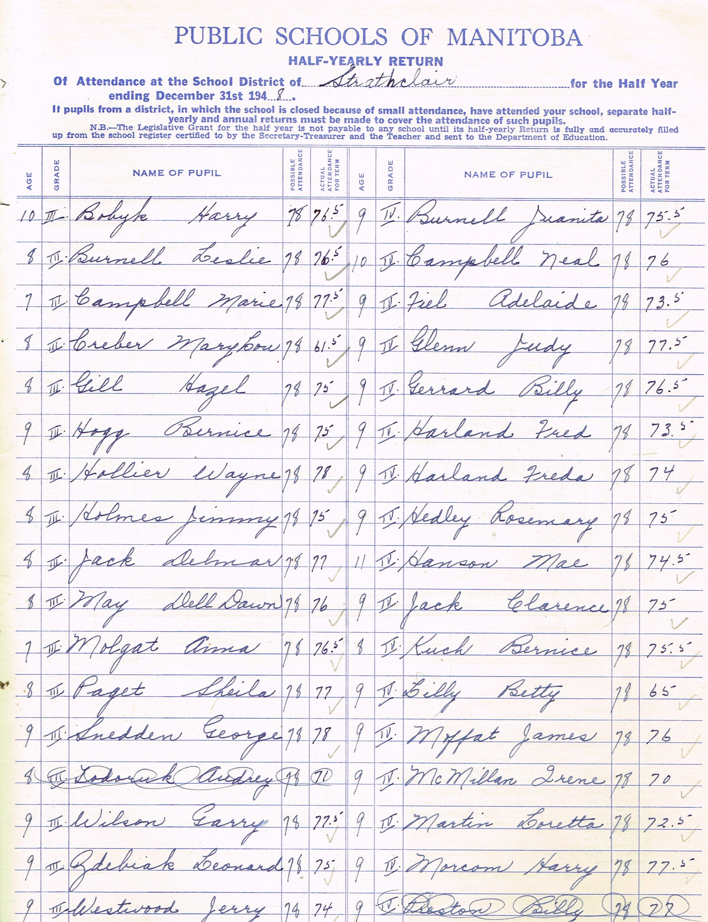Description Teacher – E. B. Bennett; Bobyk, Harry (G3); Burnell, Leslie (G3); Campbell, Marie (G3); Creber, Mary Lou (G3); Gill, Hazel (G3); Hogg, Bernice (G3); Hollier, Wayne (G3); Holmes, Jimmy (G3); Jack, Delmar (G3); May, Della Dawn (G3); Molgat, Anna (G3); Paget, Sheila (G3); Snedden, George (G3); Wilson, Garry (G3); Zdebiak, Leonard (G3); Westwood, Jerry (G3) Burnell, Juanita (G4); Campbell, Neal (G4); Fiel, Adelaide (G4); Glenn, Judy (G4); Gerrard, Billy (G4); Harland, Fred (G4); Harland, Freda (G4); Hedley, Rosemary (G4); Hanson, Mae (G4); Jack, Clarence (G4); Kuch, Bernice (G4); Lilly, Betty (G4); Moffatt, James (G4); McMillan, Irene (G4); Martin, Loretta (G4); Morcom, Harry (G4); Prus, Shirley (G4); Sinclair, James (G4); Smith, Edward (G4)