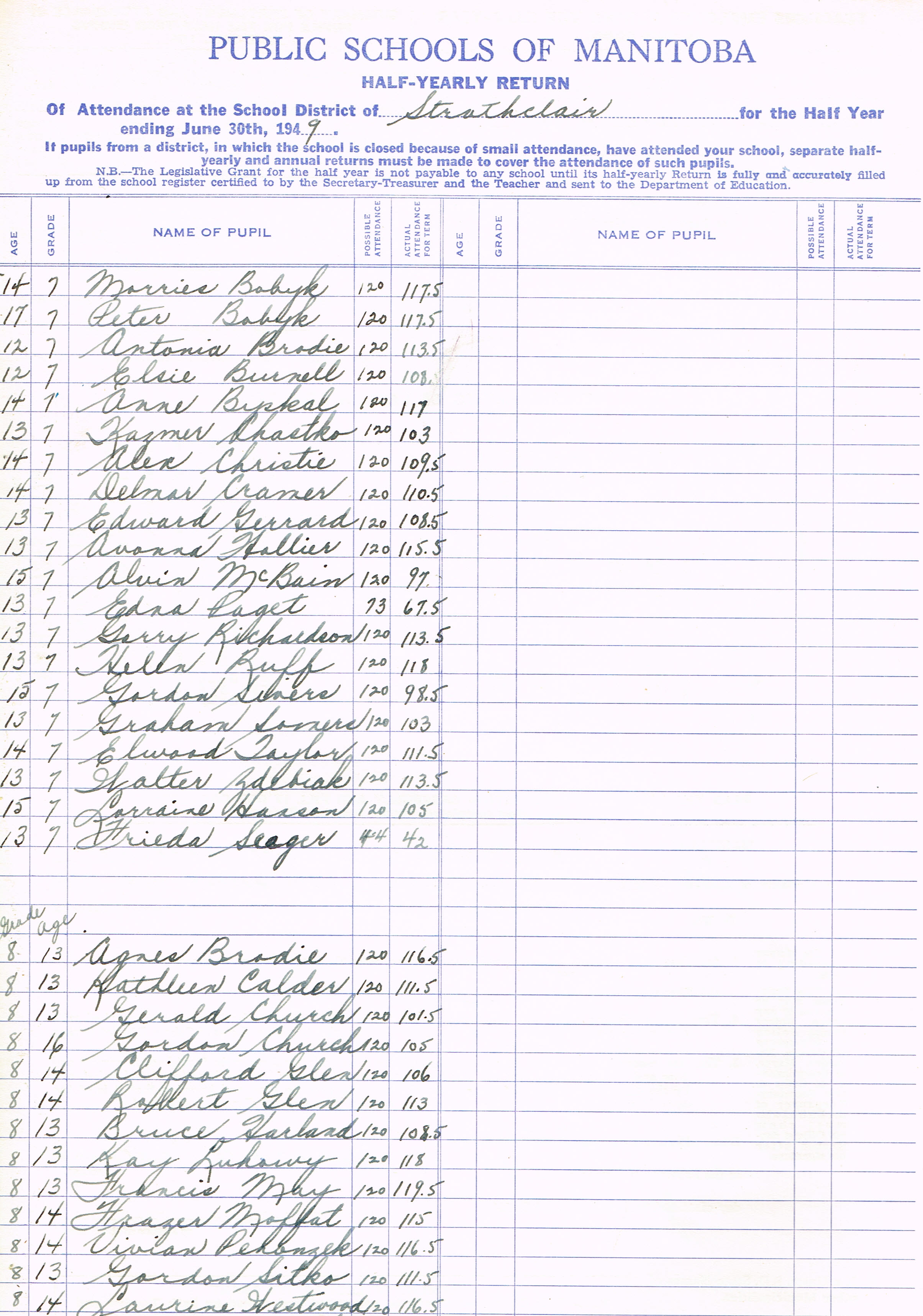 Description Teacher – M. Hacking; Bobyk, Morries (G7); Bobyk, Peter (G7); Brodie, Antonia (G7); Burnell, Elsie (G7);Byskal, Anne (G7); Chastko, Kazmer (G7); Christie, Alex (G7); Cramer, Delmar (G7); Gerrard, Edward (G7); Hollier, Avonna (G7); McBain, Alvin (G7);Edna Paget (G7); Richardson, Garry (G7); Ruff, Helen (G7); Sivers, Gordon (G7); Somers, Graham (G7); Tayor, Elwood (G7); Zdebiak, Walter (G7); Hanson, Lorraine (G7); Seager, Frieda (G7) Brodie, Agnes (G8); Calder, Kathleen (G8); Church, Gerald (G8); Church, Gordon (G8); Glen, Clifford (G8);Glen, Robert (G8); Harland, Bruce (G8); Luhowy, Kay(G8); May, Francis (G8); Moffat, Frazer (G8), Penonzek, Vivian (G8); Sitko, Gordon (G8); Westwood, Laurine (G8); Zdebiak, Jean (G8)