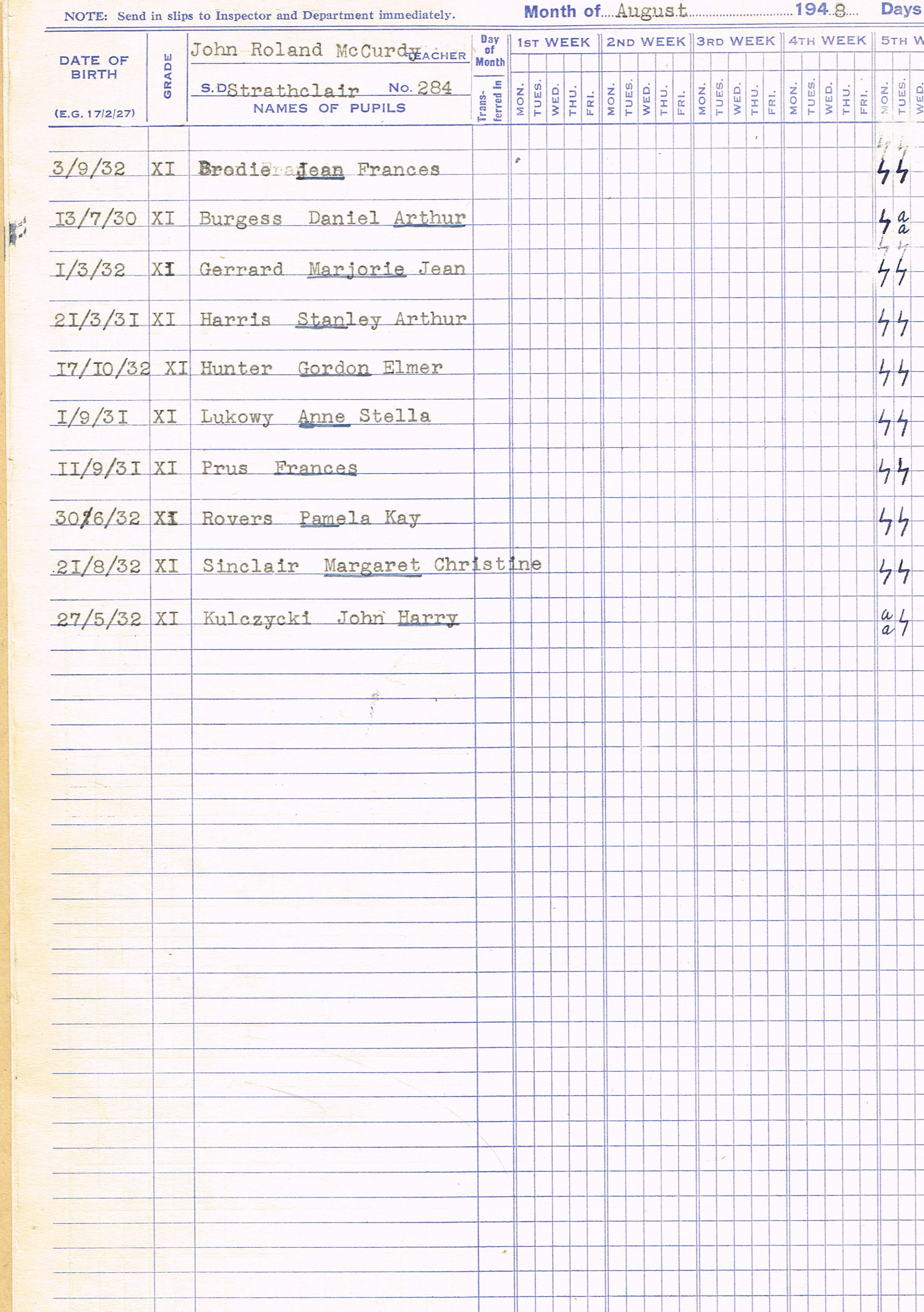 Description Teacher – J. Roland McCurdy; Brodie, Jean Frances (G11); Burgess, Daniel Arthur (G11); Gerrard, Marjorie Jean (G11); Harris, Stanley Arthur (G11); Hunter, Gordon Elmer (G11); Luhowy, Anne Stella (G11); Prus, Frances (G11); Rovers, Pamela Kay (G11); Sinclair, Margaret Christine (G11); Kulczycki, Harry John (G11)