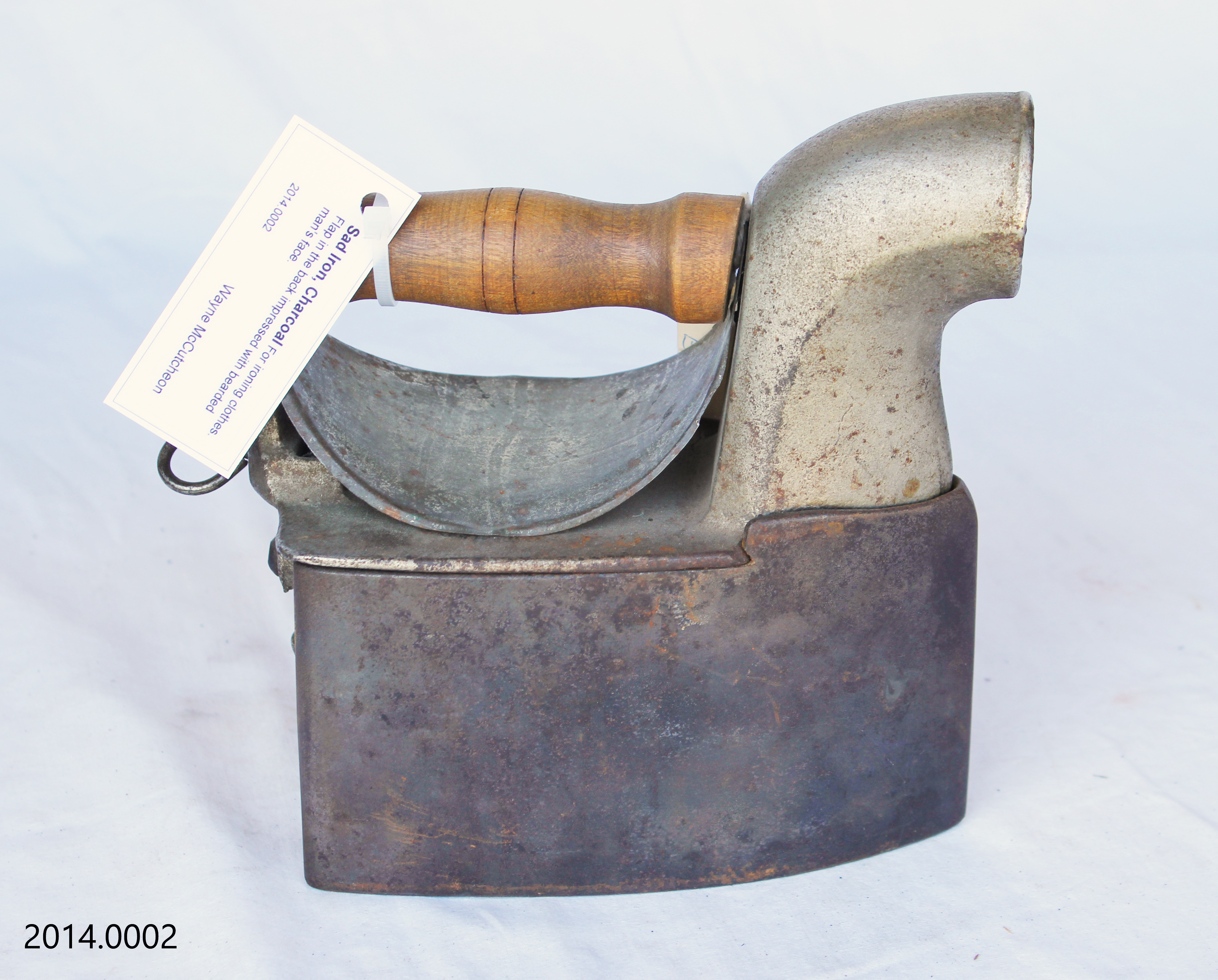 Object Desc For ironing clothes. Flap in the back impressed with bearded man's face.