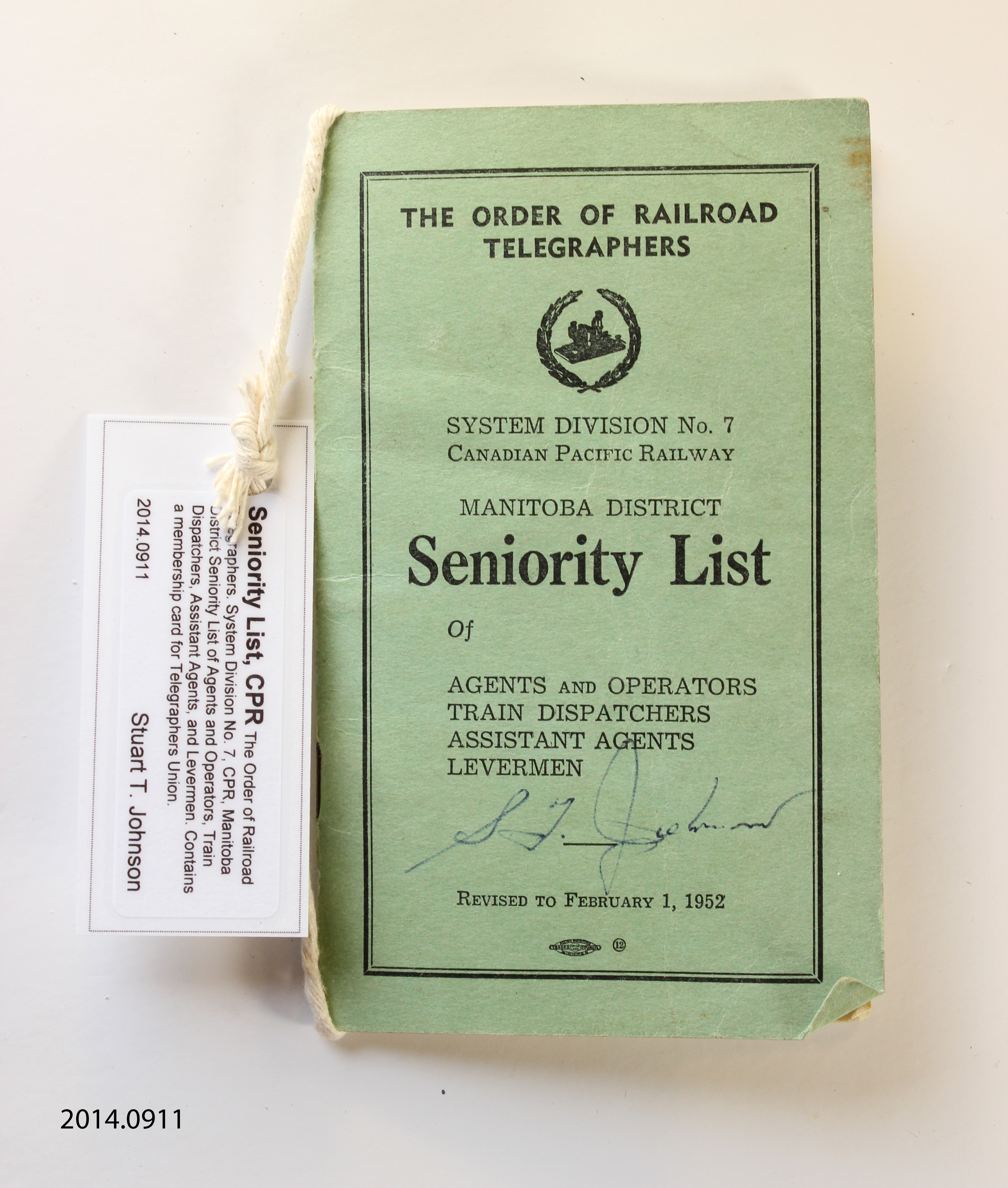 Object Desc The Order of Railroad Telegraphers. System Division No. 7, CPR, Manitoba District Seniority List of Agents and Operators, Train Dispatchers, Assistant Agents, and Levermen. Contains a membership card for Telegraphers Union.