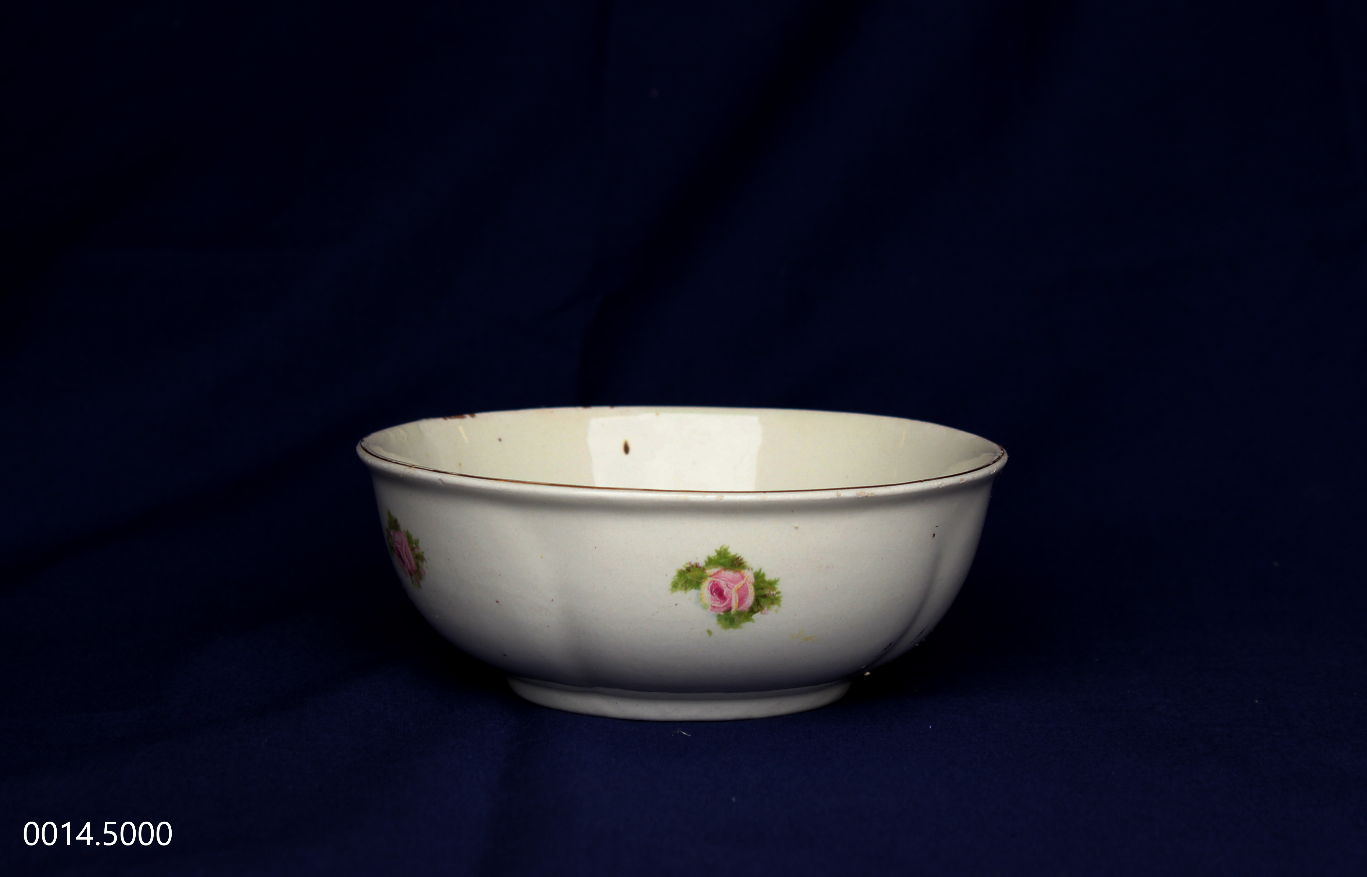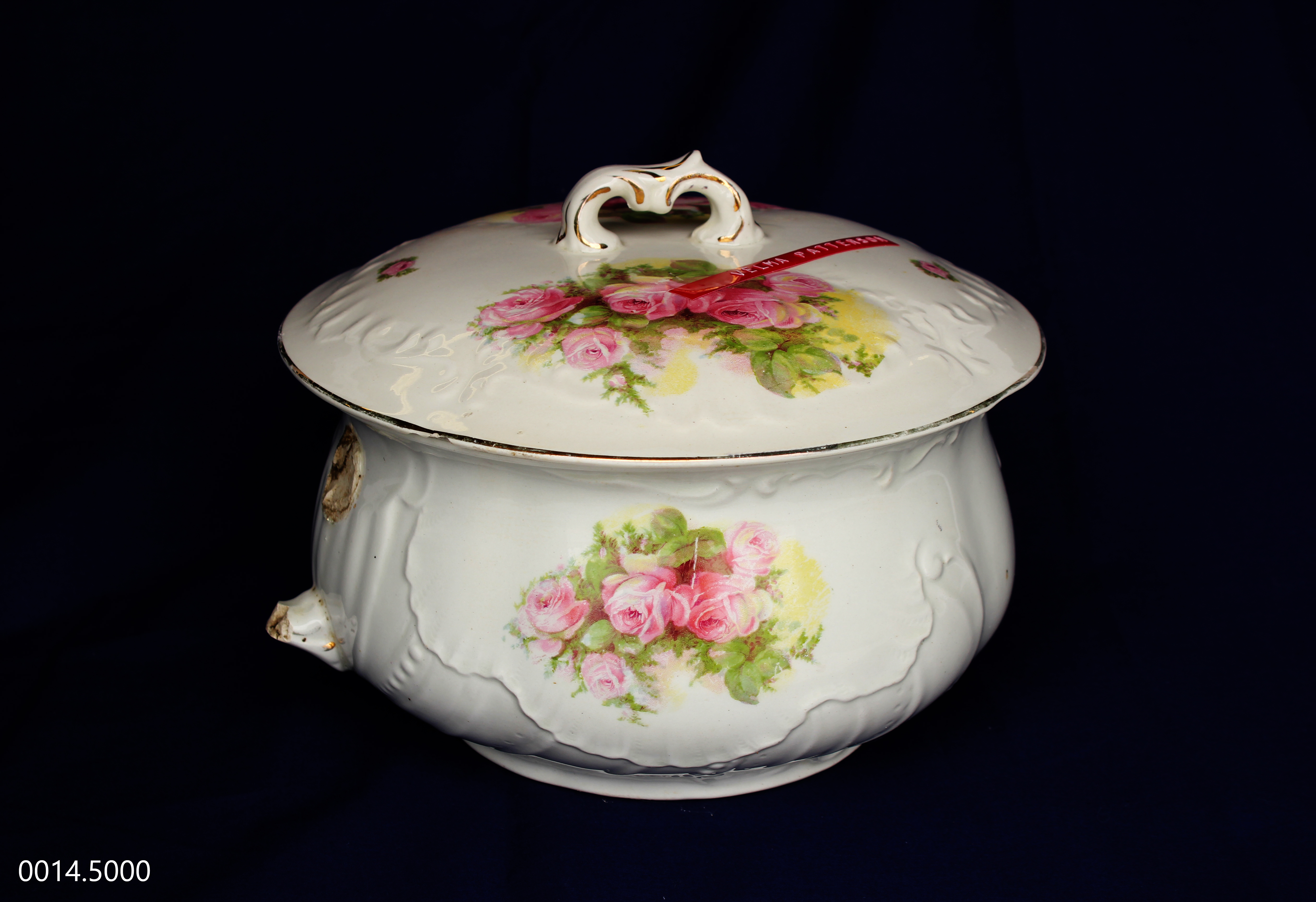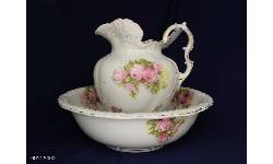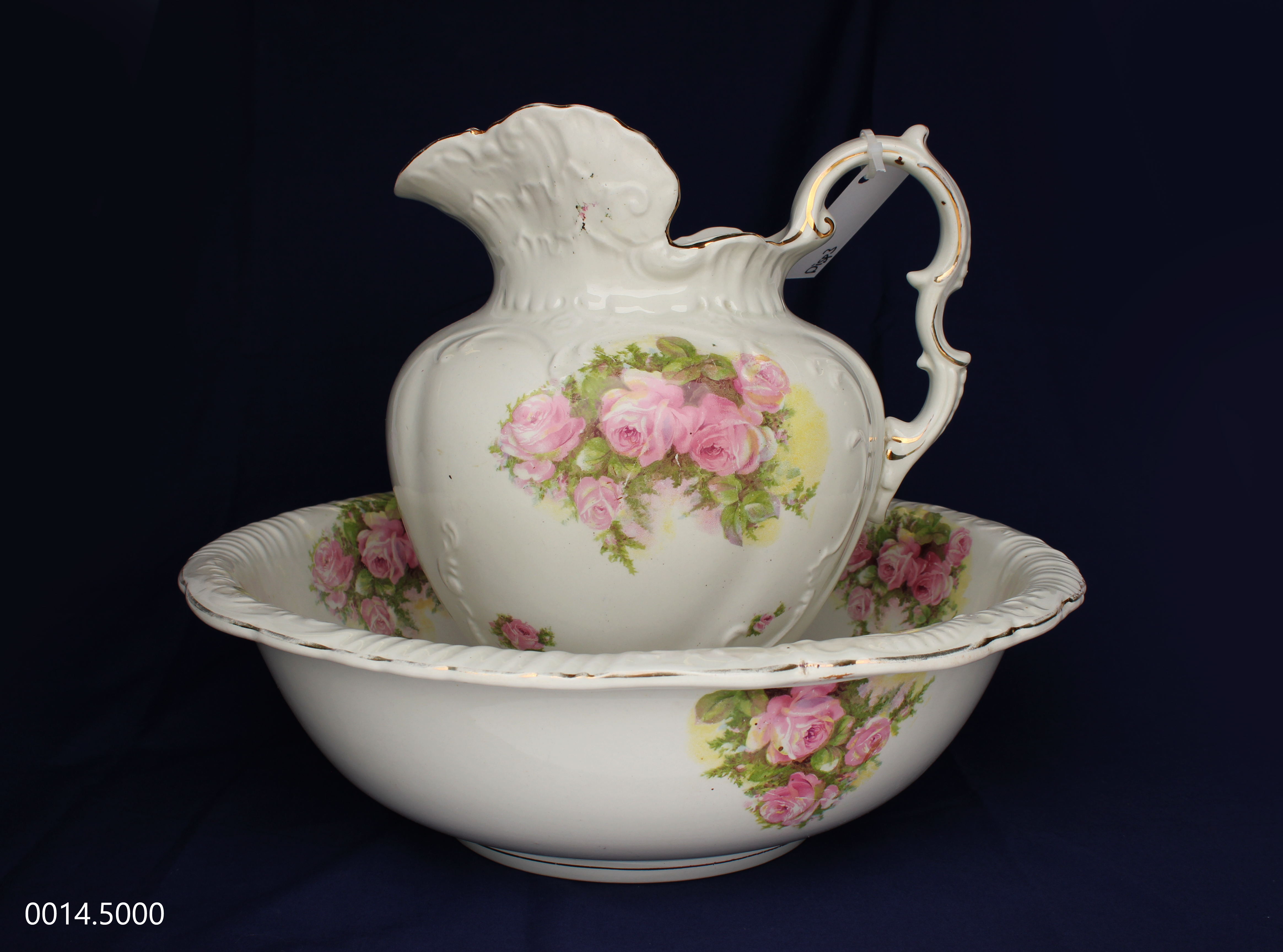 Object Desc Features a pink rose design. 1 soap dish, 1 toothbrush cup, 1 bowl, 1 shaving cup, 1 wash pitcher, 1 wash stand bowl, and 1 chamber pot