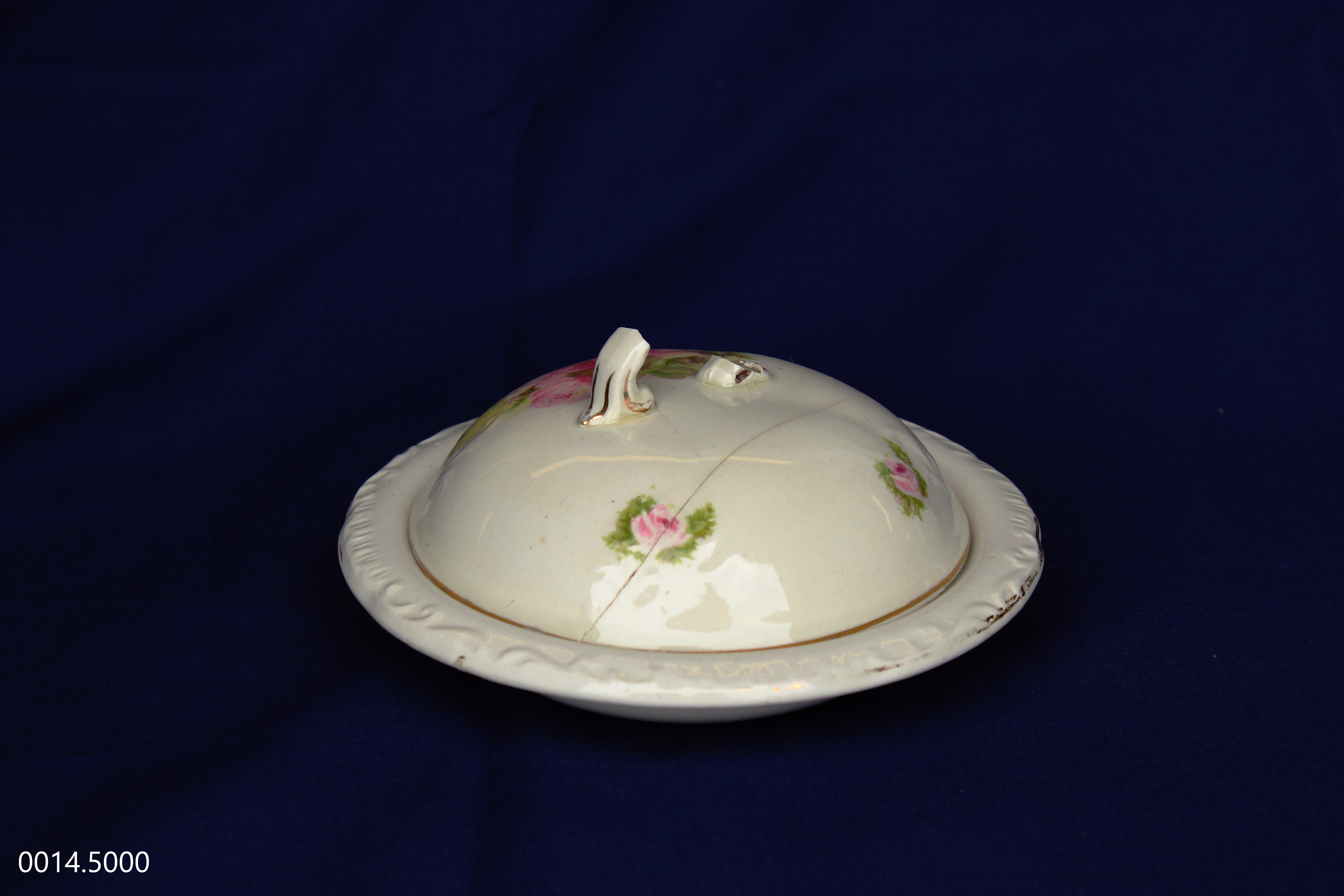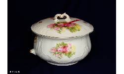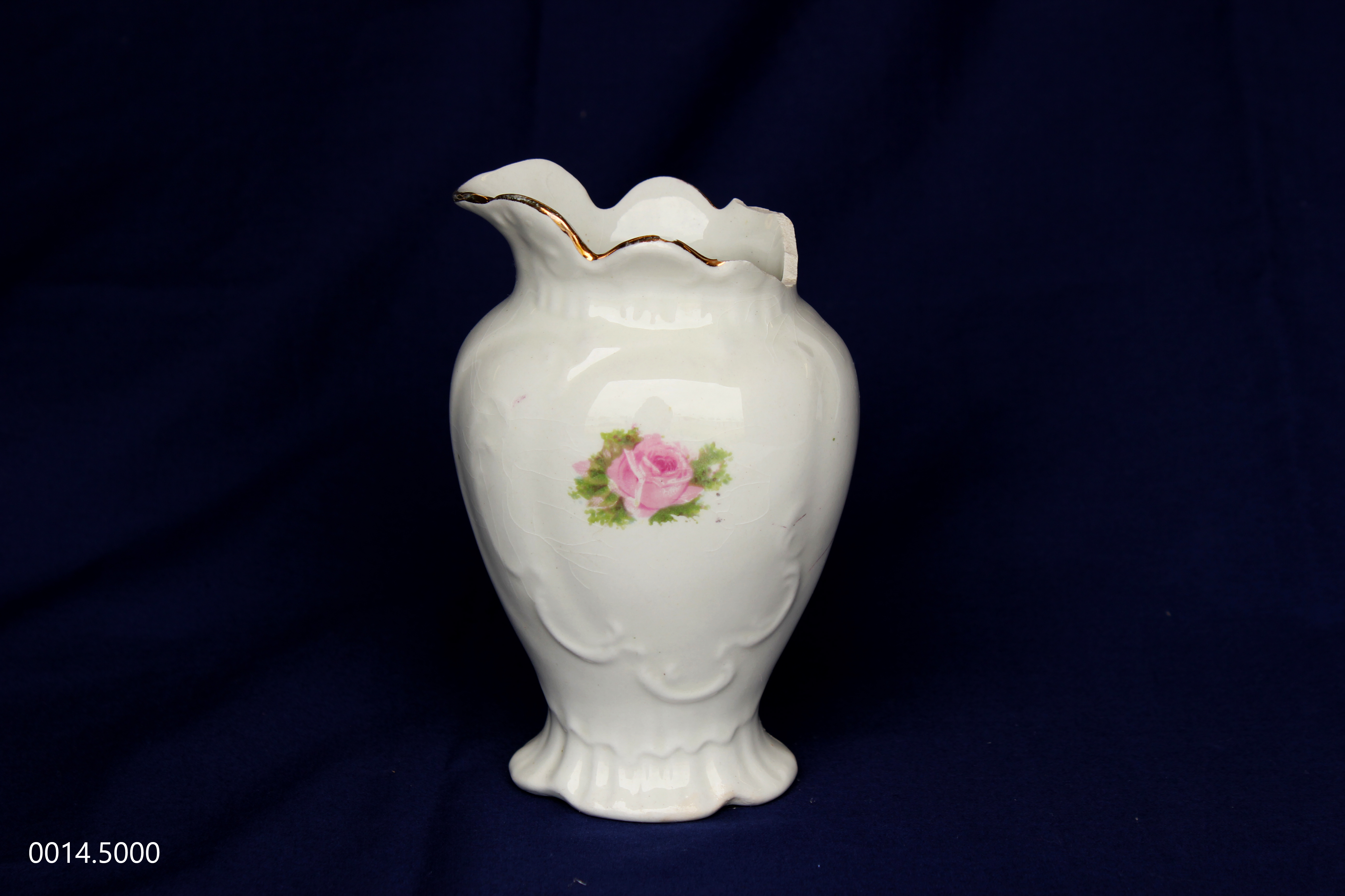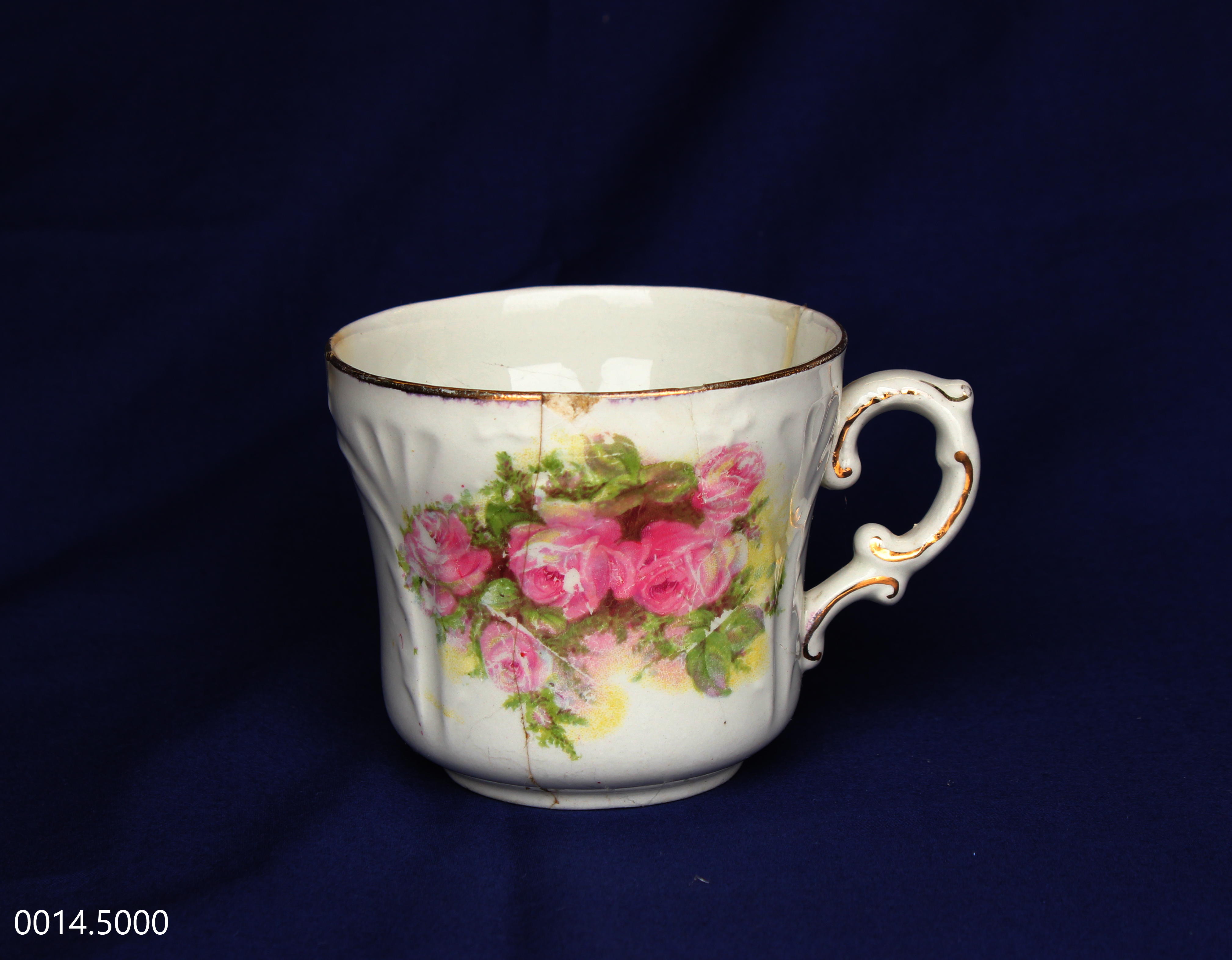 Object Desc Features a pink rose design. 1 soap dish, 1 toothbrush cup, 1 bowl, 1 shaving cup, 1 wash pitcher, 1 wash stand bowl, and 1 chamber pot