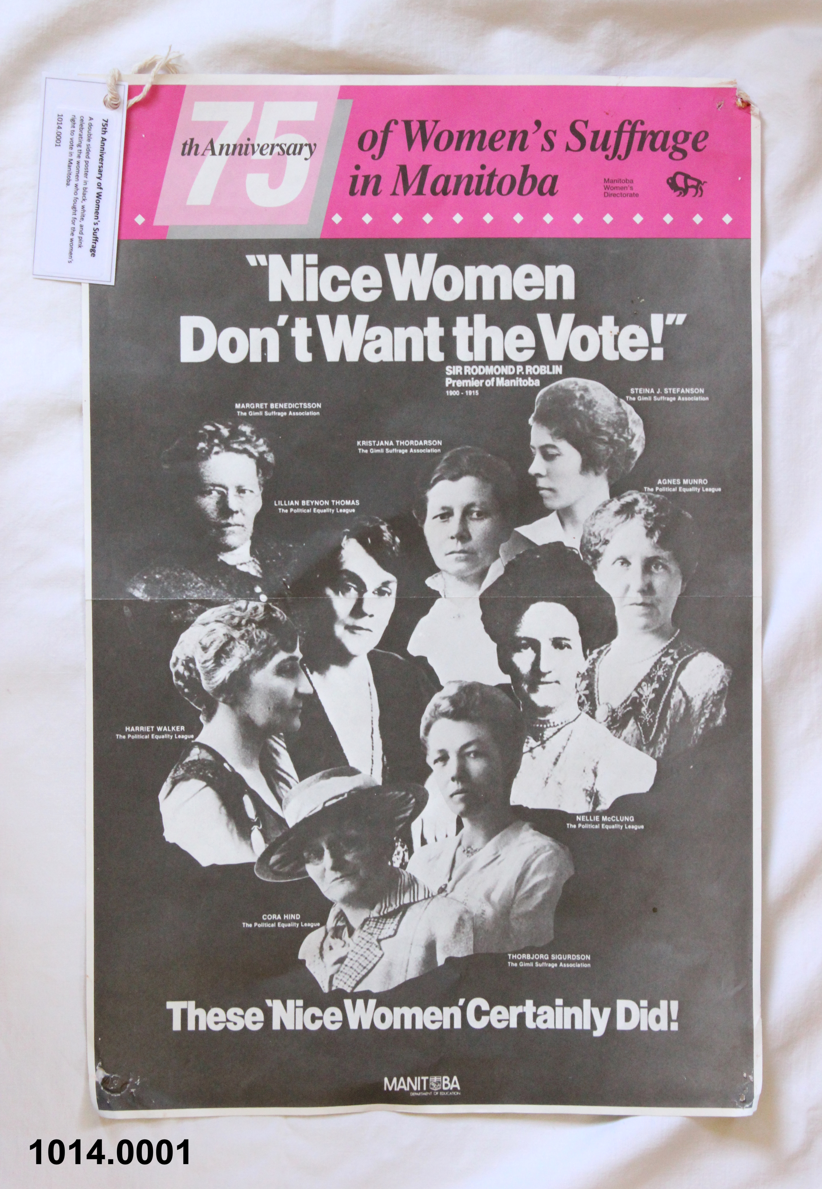 Object Desc A double sided poster in black, white, and pink celebrating the women who fought for women's right to vote in Manitoba.
