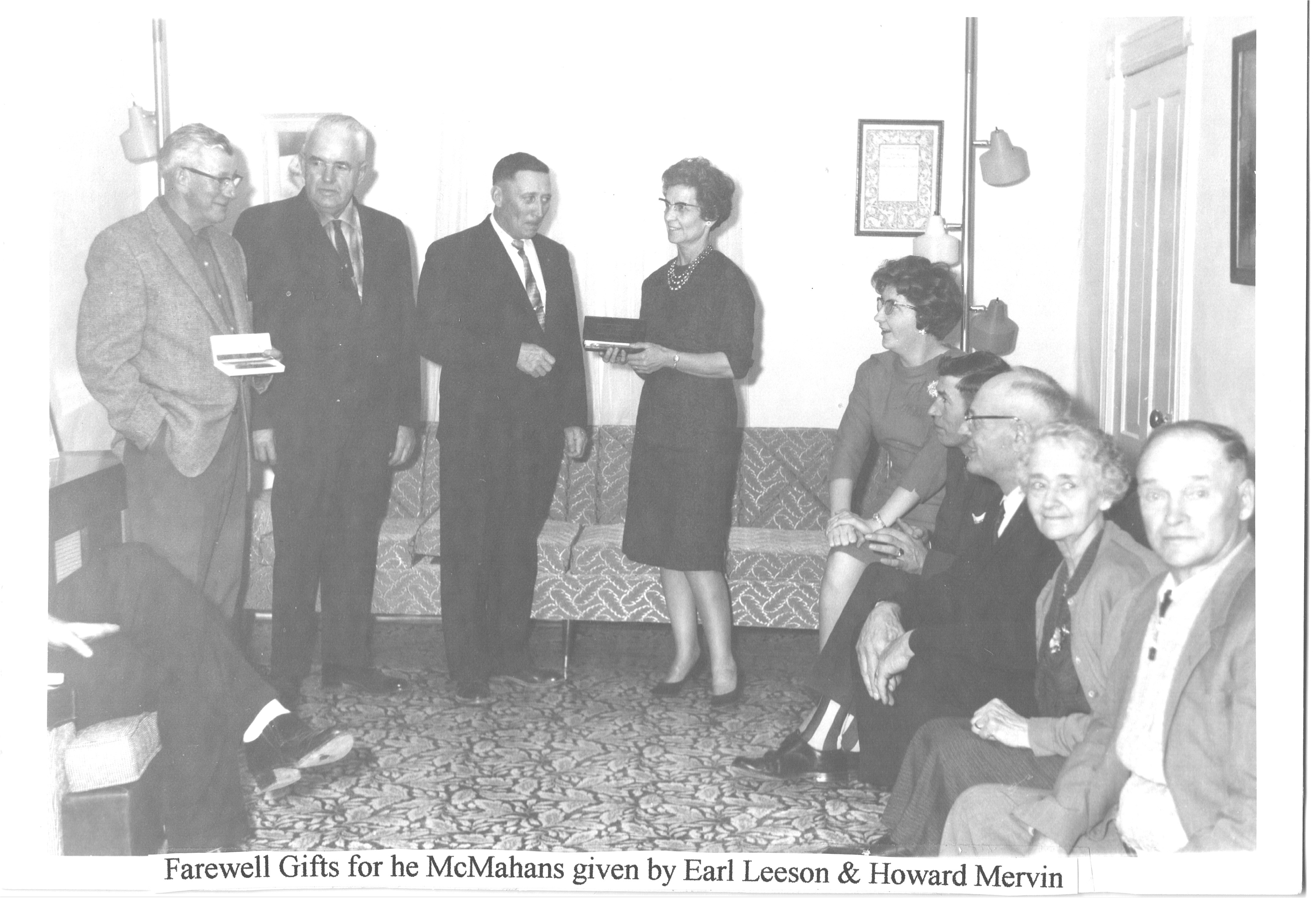 Description L-R Ed McMahan, Earl Lesson, Howard Mervyn, Muriel McMahan, Lex Pedersen, Mervyn Pedersen, Walter Moffat, Hilda & Austin Bradley, McMahans retired to Strathclair and lived in the Roy & Alice Glenn house.