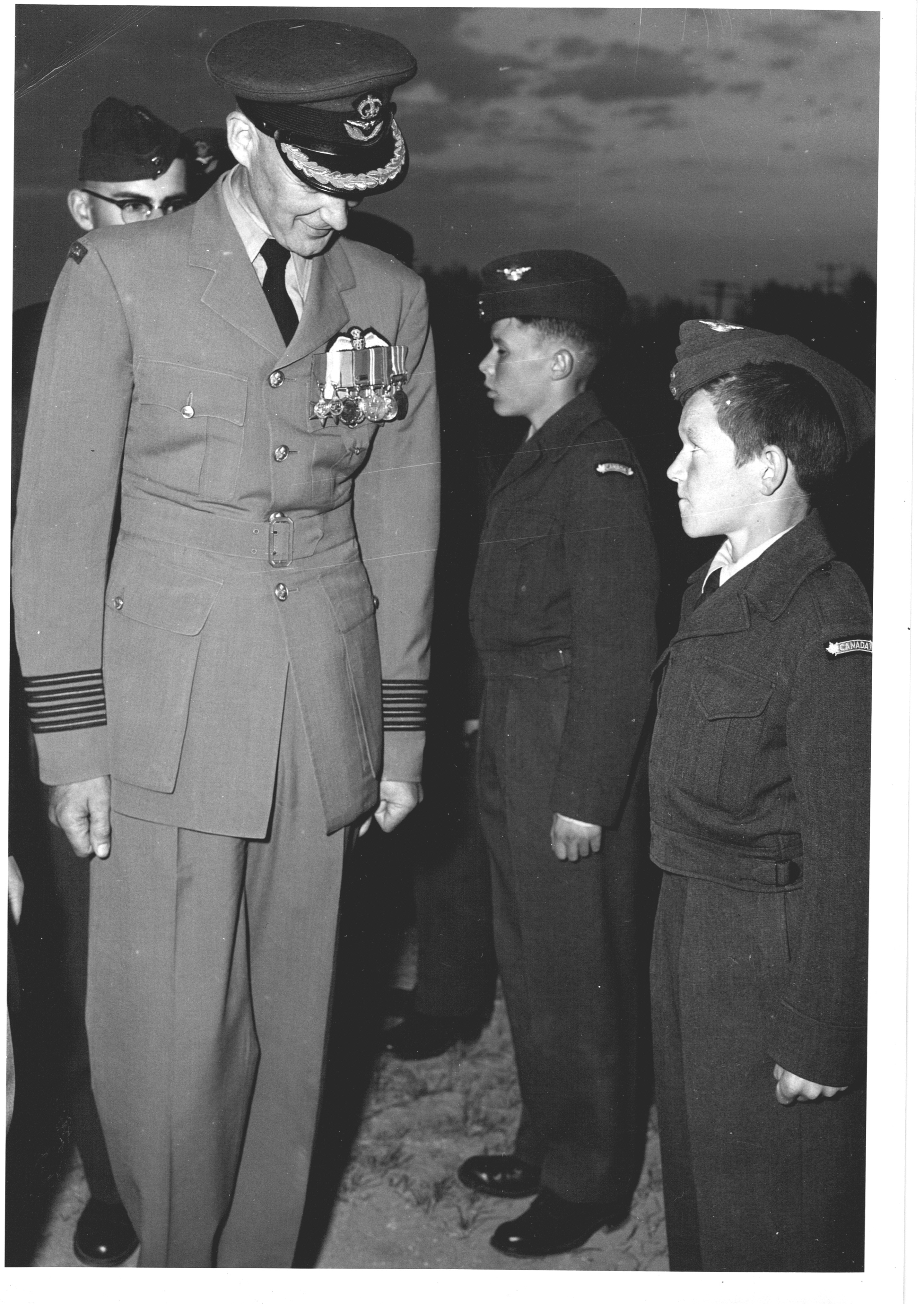Description Unknown Dignitary for Cadet Inspection event. Behind him Jim Holmes unknown. Boy on left Brian Glenn (possible)